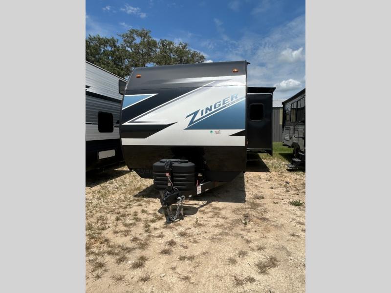 Lead your family to a great vacation getaway in any one of these CrossRoads RV Zinger travel trailers! They feature an aerodynamic front end, Keyed-Alike door locks, Secure Stance entry steps, and exterior speakers with LED accents. The interior of each model includes kitchen backsplash and pressed countertops, along with generous storage, designer valances, and LED lighting to keep your space well lit. You will also appreciate USB ports to keep your electronics charged up, and there is an AM/FM stereo with a Bluetooth soundbar to keep the party going!