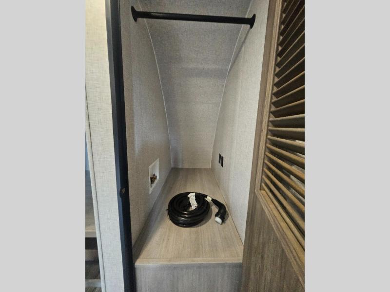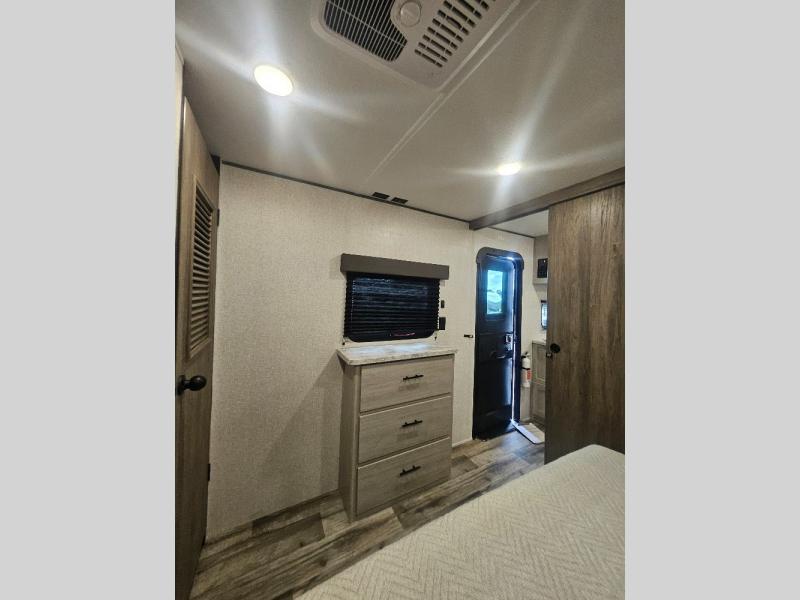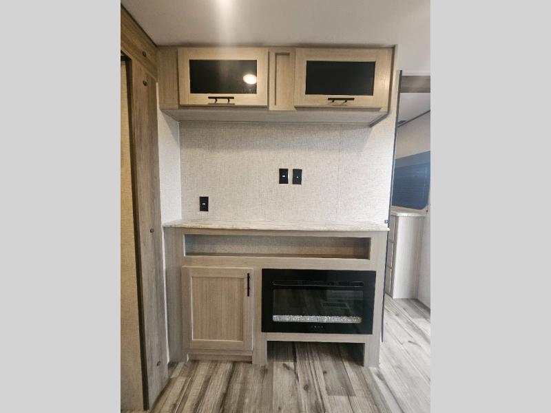Camp like royalty in this travel trailer! The front private bedroom features a king bed across from a dresser and next to a large wardrobe with overhead cabinets, plus there is a closet with washer and dryer prep. The living area has a 60" jackknife sofa that can be pulled out for a comfortable place to lie down and watch a movie on the HDTV while a fire is roaring in the electric fireplace. The rear private bunkhouse is big enough to house all of the kiddos with the 38" x 74" flip-up bunk above the 72" jackknife sofa and the 38" x 74" bunk above the wardrobe/entertainment center. You can even cook dinner while breathing in fresh air at the outdoor kitchen!