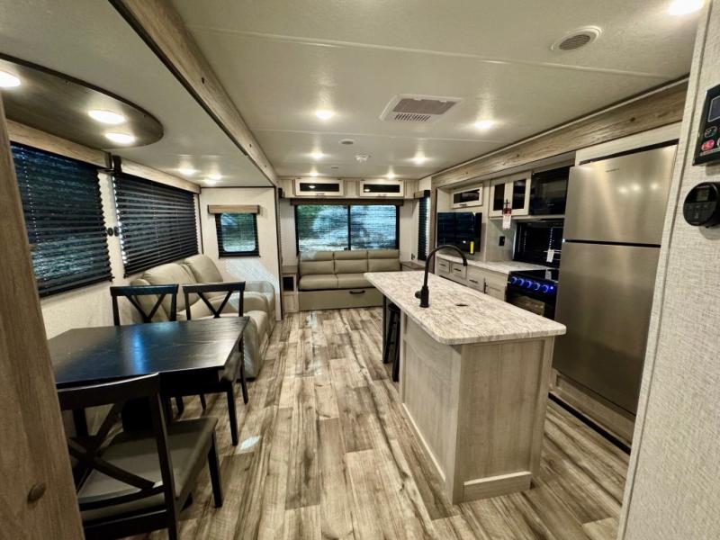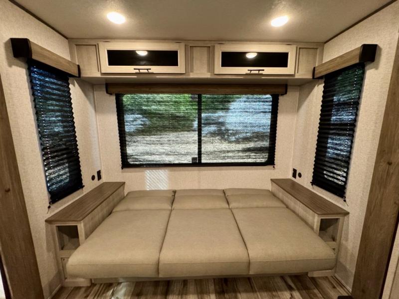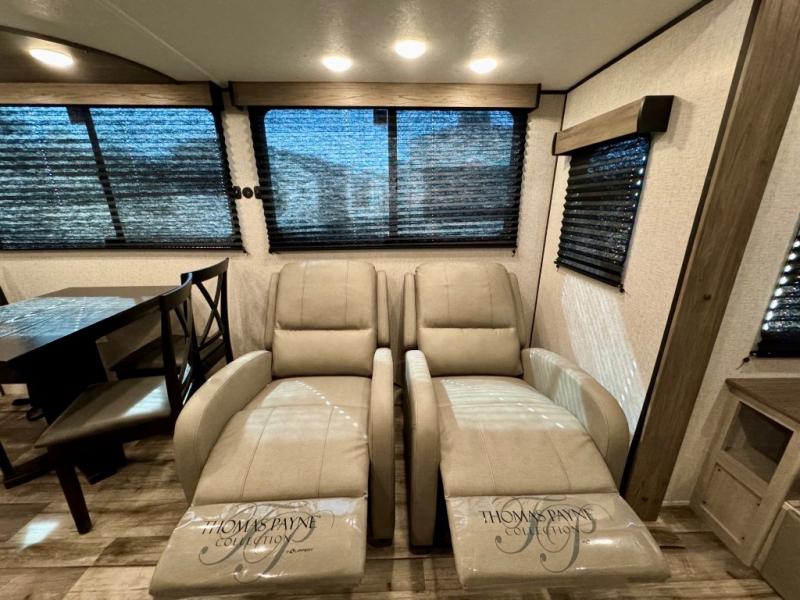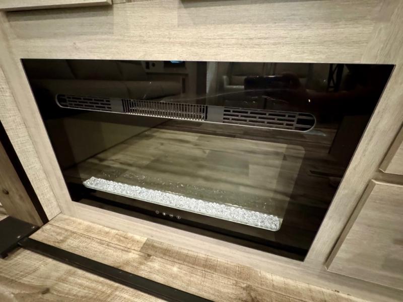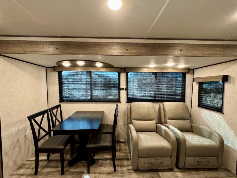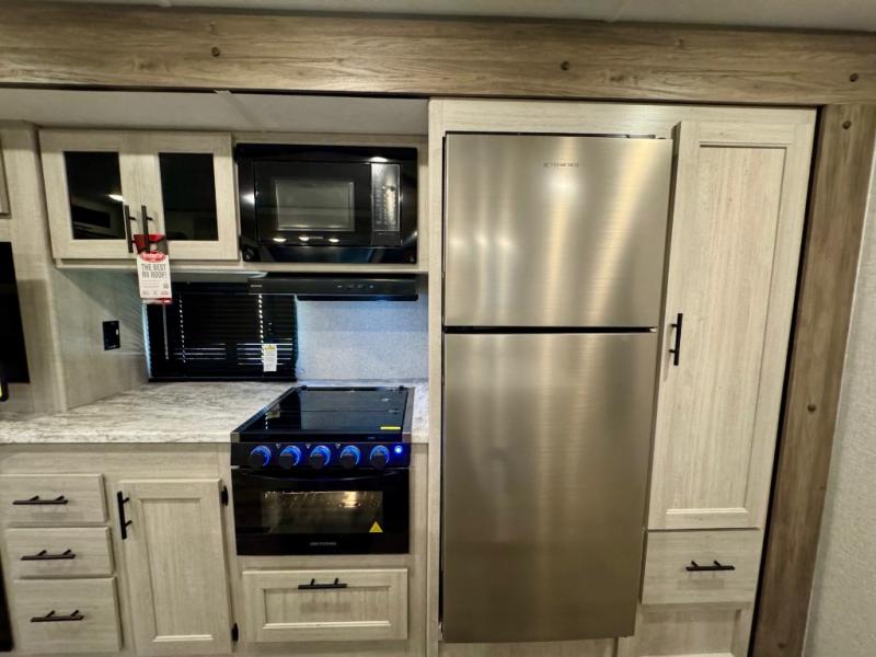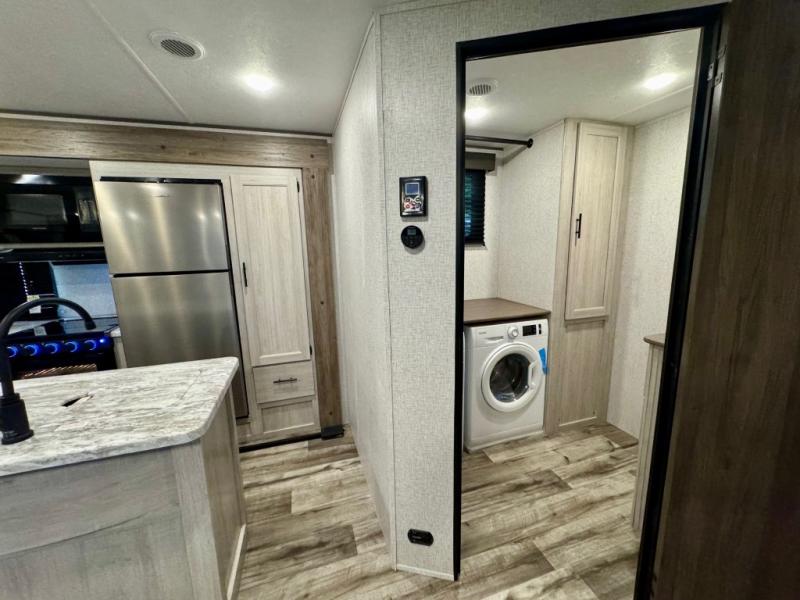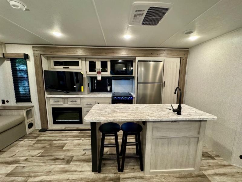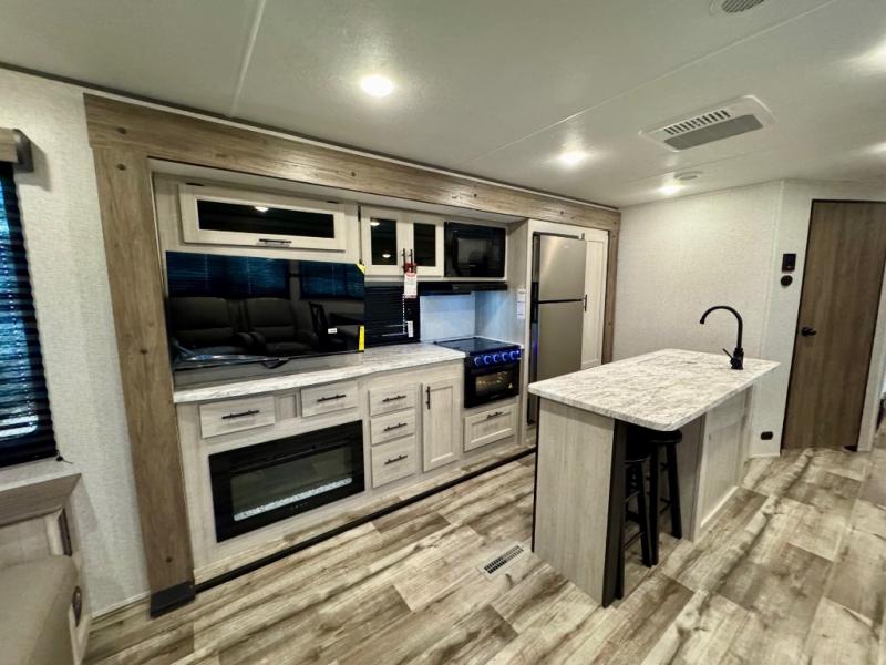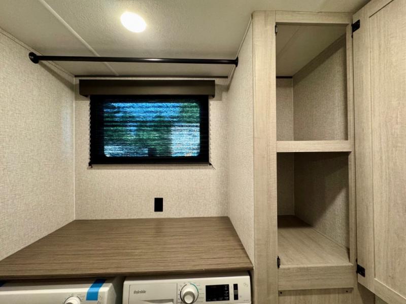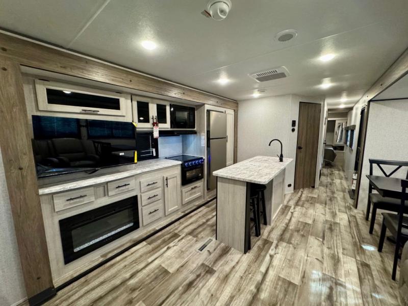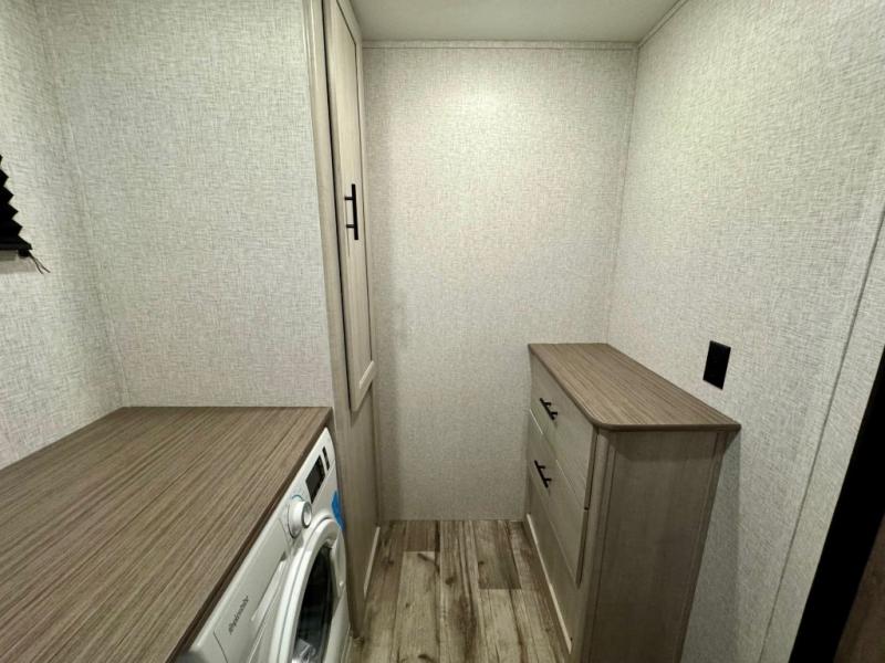 If you and your loved ones wish to escape the hustle and bustle of everyday life, then you need this travel trailer! The rear living area is filled with relaxation with a 72" jackknife sofa and two recliner chairs across from the entertainment center with a fireplace and a 39" TV. The kitchen is full of comforts too, including a kitchen island with a chair on either side of it, a 42" U-shaped dinette, and a pantry for snacks. This middle utility room features washer and dryer prep, a dresser, and a linen closet, making this room the perfect mud room or laundry room if you choose to add those appliances. When it's time to call it a night, the front master bedroom with an RV queen bed is sure to bring a great night's rest.
