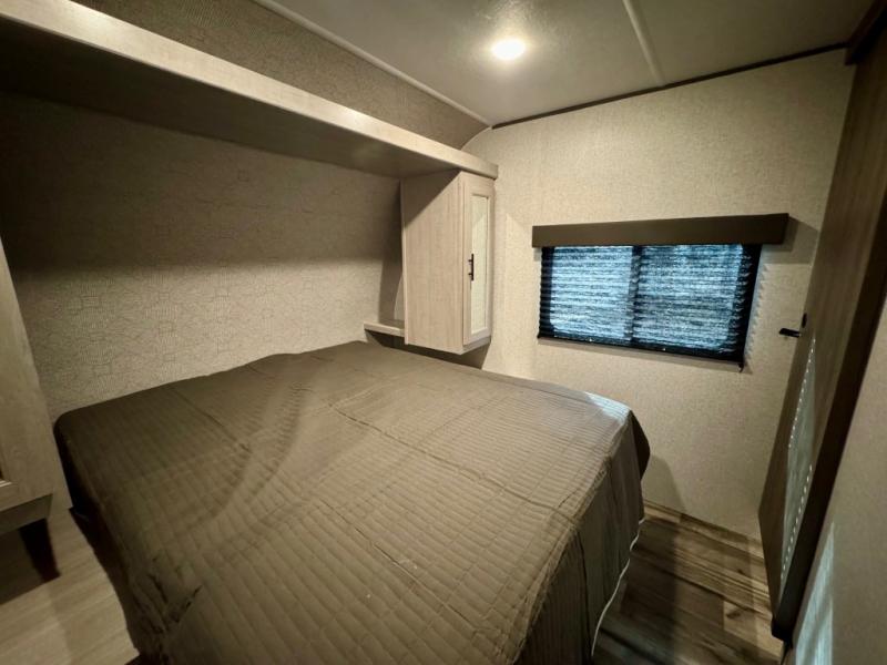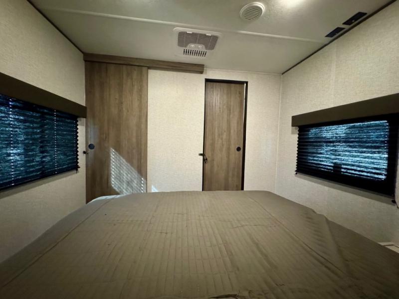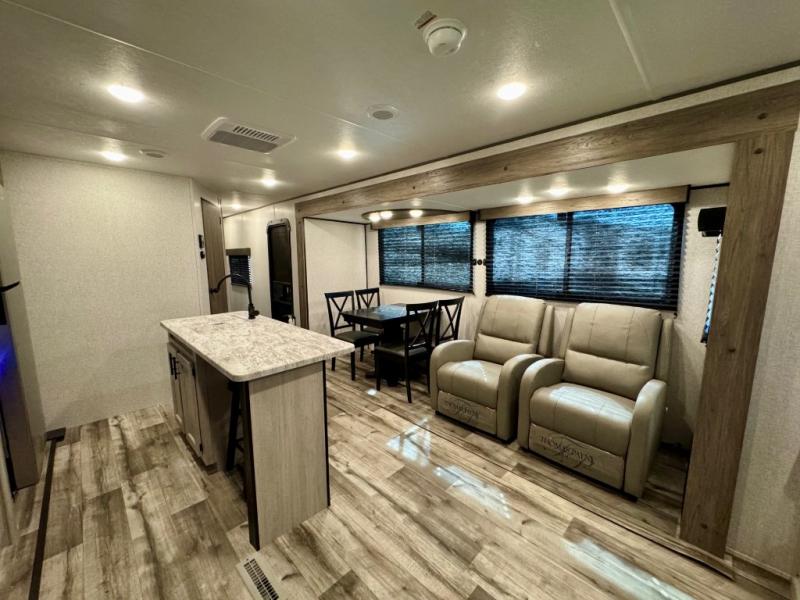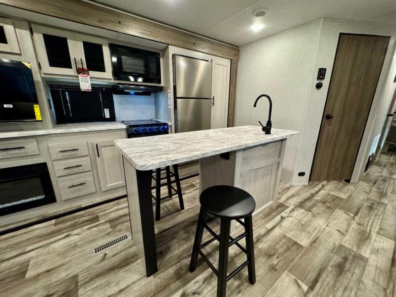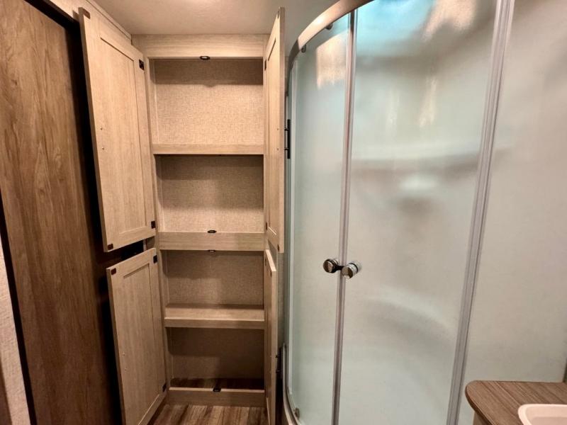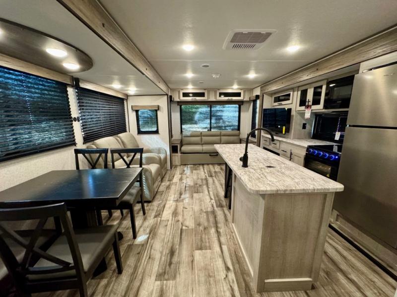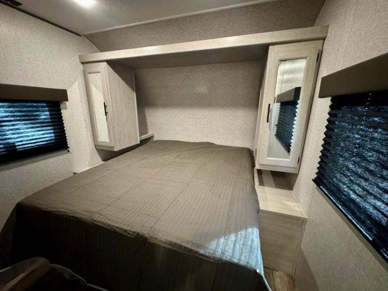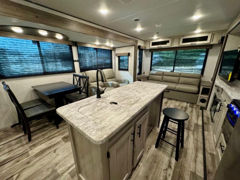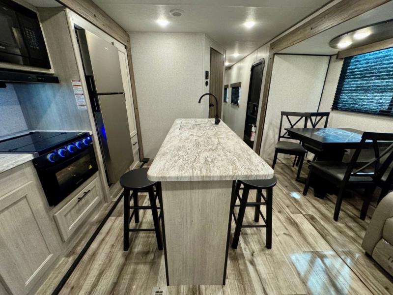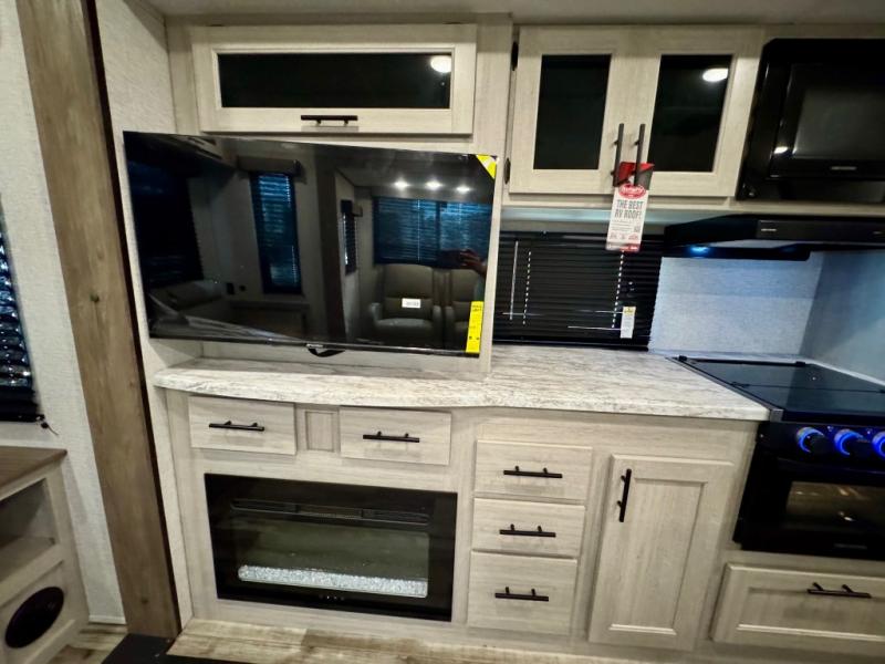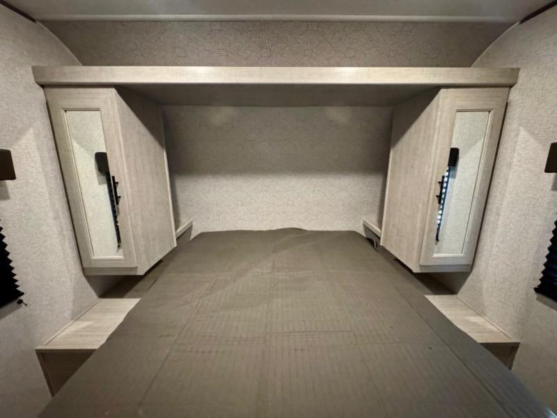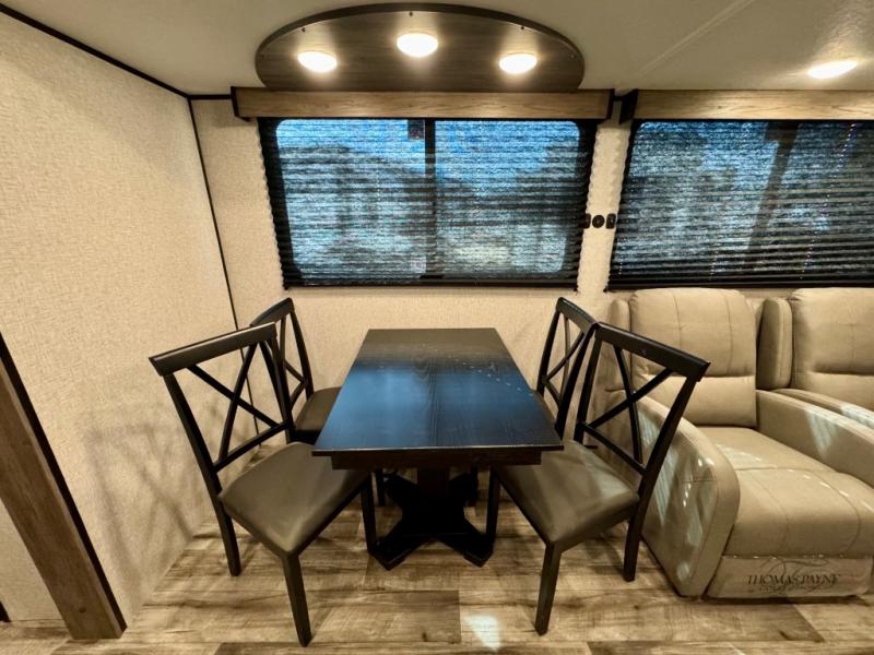 If you and your loved ones wish to escape the hustle and bustle of everyday life, then you need this travel trailer! The rear living area is filled with relaxation with a 72" jackknife sofa and two recliner chairs across from the entertainment center with a fireplace and a 39" TV. The kitchen is full of comforts too, including a kitchen island with a chair on either side of it, a 42" U-shaped dinette, and a pantry for snacks. This middle utility room features washer and dryer prep, a dresser, and a linen closet, making this room the perfect mud room or laundry room if you choose to add those appliances. When it's time to call it a night, the front master bedroom with an RV queen bed is sure to bring a great night's rest.