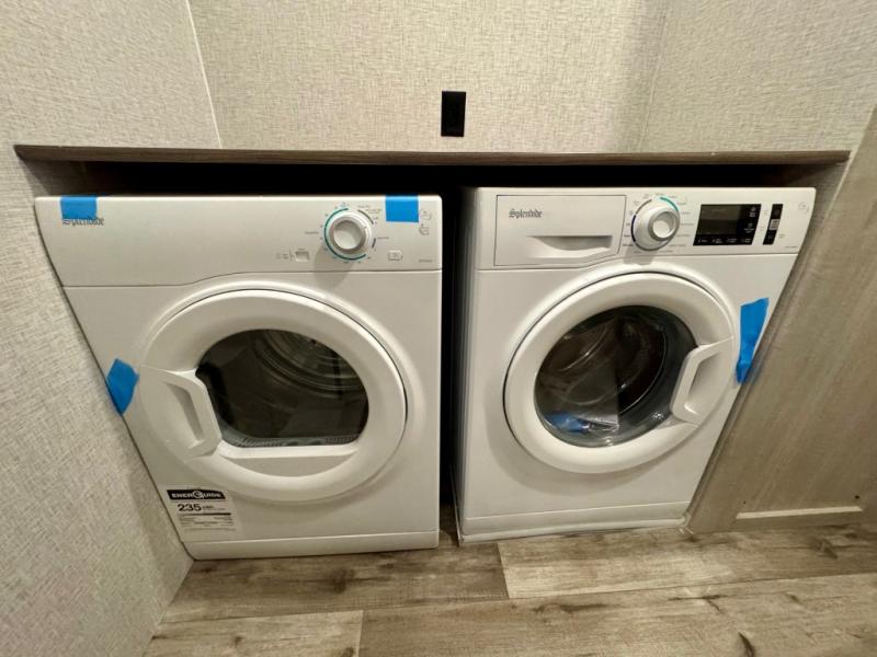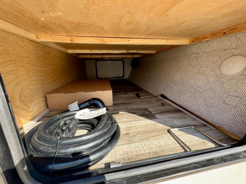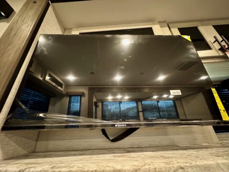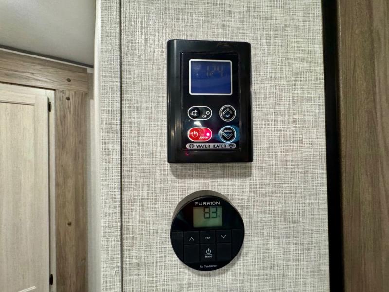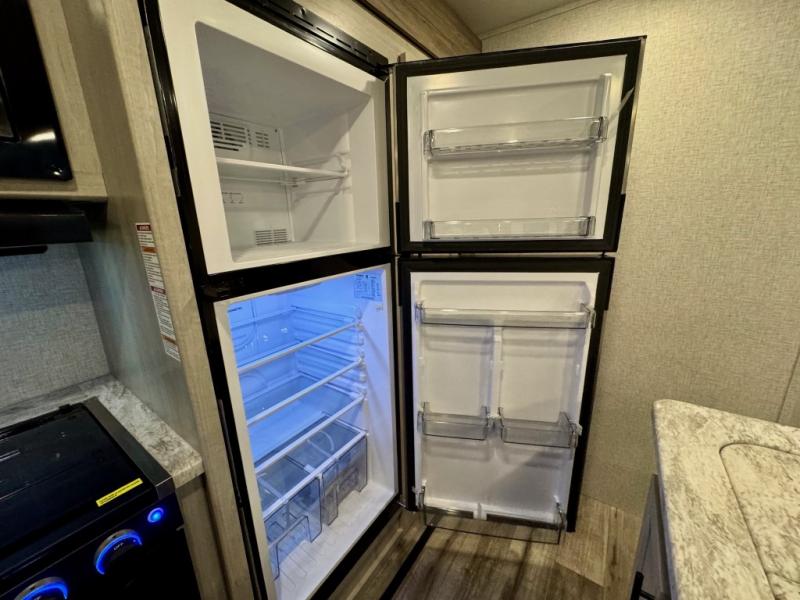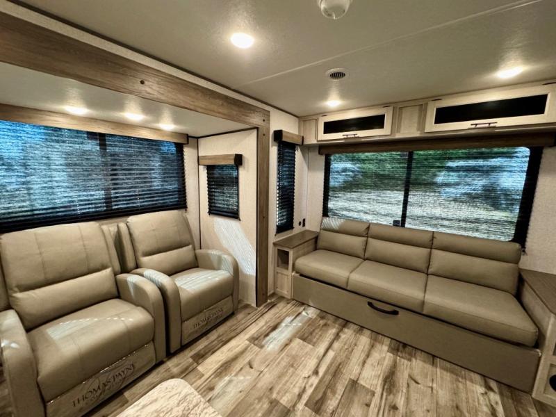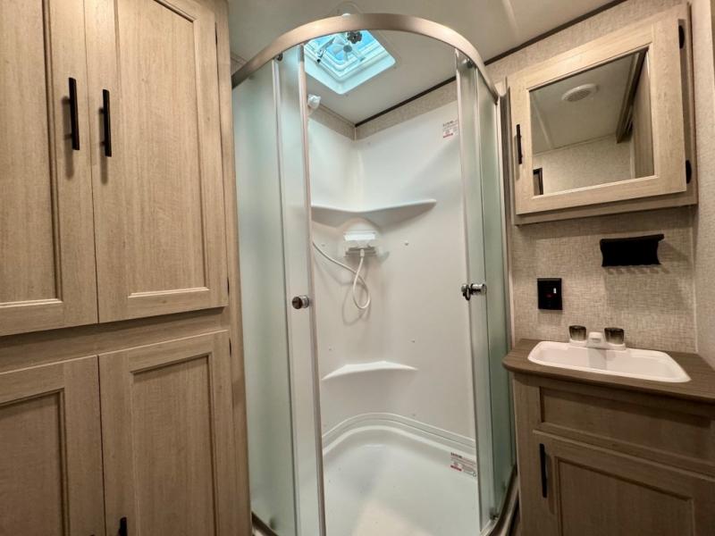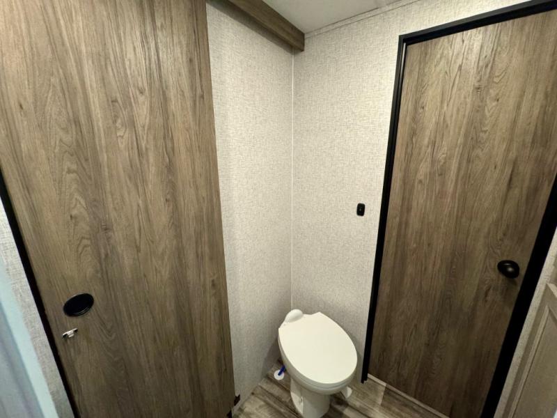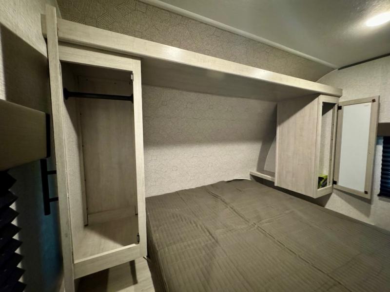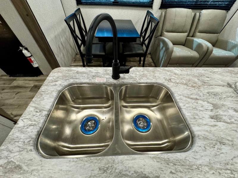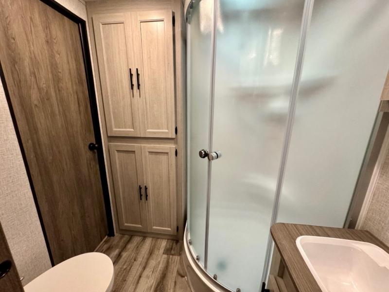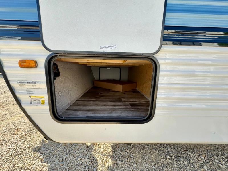 If you and your loved ones wish to escape the hustle and bustle of everyday life, then you need this travel trailer! The rear living area is filled with relaxation with a 72" jackknife sofa and two recliner chairs across from the entertainment center with a fireplace and a 39" TV. The kitchen is full of comforts too, including a kitchen island with a chair on either side of it, a 42" U-shaped dinette, and a pantry for snacks. This middle utility room features washer and dryer prep, a dresser, and a linen closet, making this room the perfect mud room or laundry room if you choose to add those appliances. When it's time to call it a night, the front master bedroom with an RV queen bed is sure to bring a great night's rest.