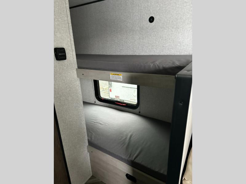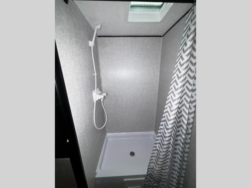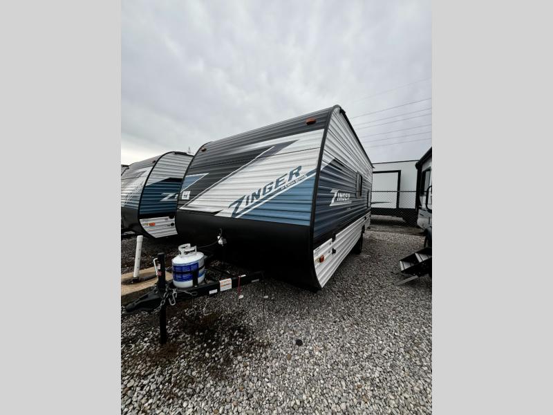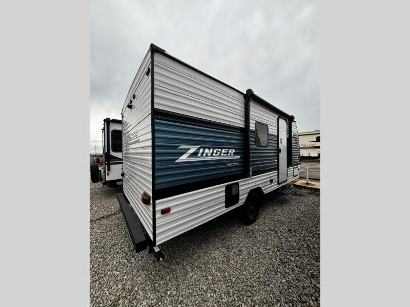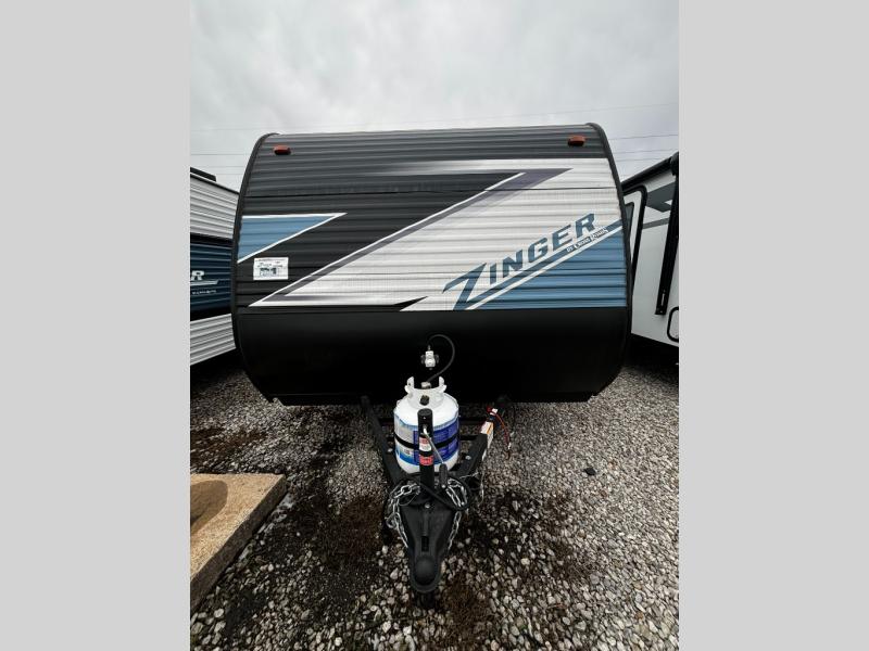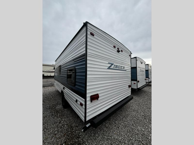 This Zinger Lite travel trailer is perfect for your next family vacation or weekend at the lake with friends. With room for five, this unit gives you the space you need to pack up the kids and the dog and get ready to hit the road! With an RV queen bed and bunk beds, everyone will have a place to sleep. The 38" booth dinette can comfortably hold one to two little ones or an adult guest. Use the two burner range to make a home-cooked meal and easily store your leftovers in the 12V refrigerator. Enjoy extra privacy with a rear corner bath that includes a 30" x 36" shower. This unit features multiple overhead compartments, so bring along the board games and other valuables from home.