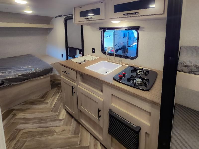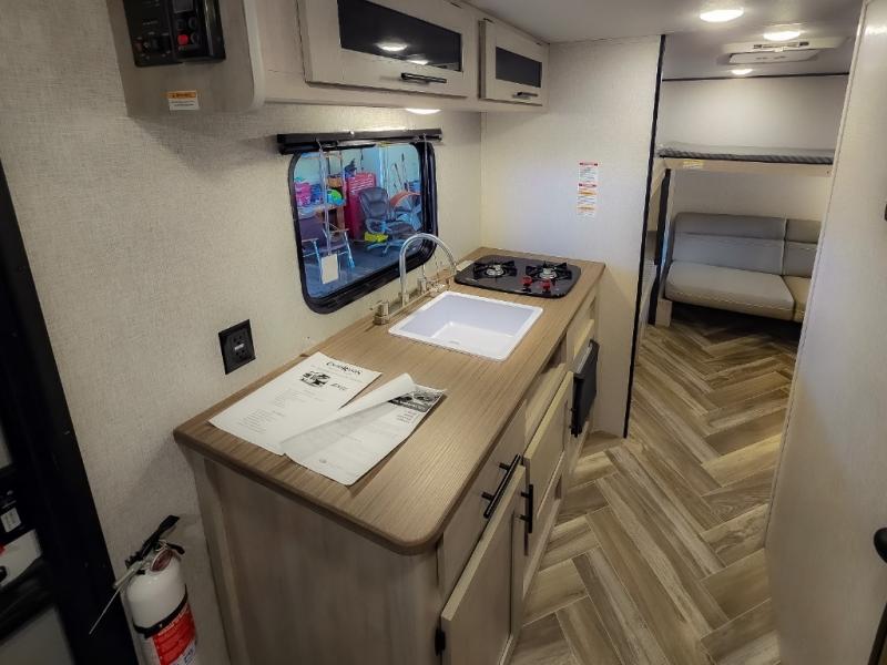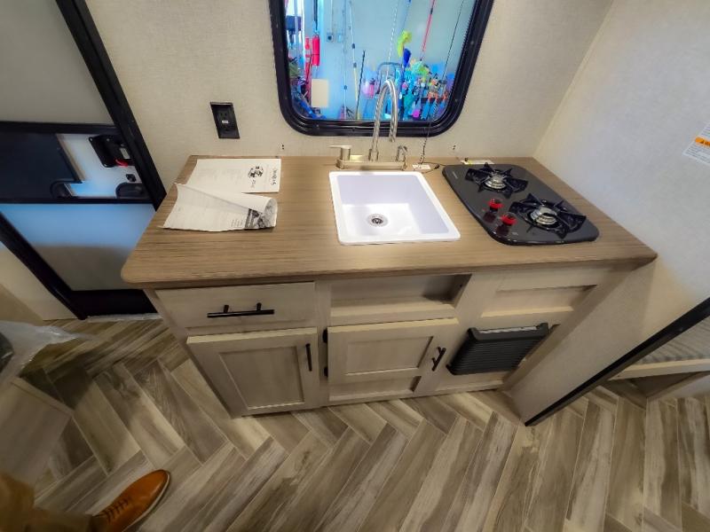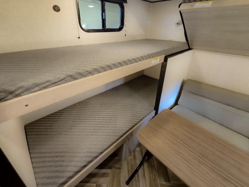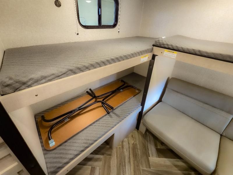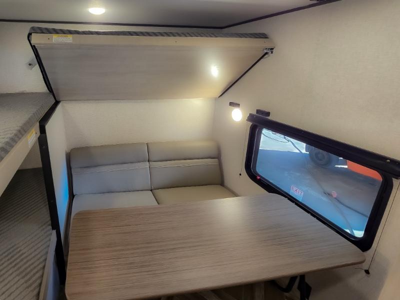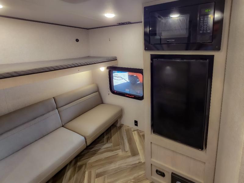 This is the perfect travel trailer to bring along guests or little ones since there are bunk beds in the back, along with a third bunk above a jackknife sofa. There is also a fold-up table by the sofa where you can dine at each day. This Zinger Lite kitchen includes a microwave oven, cooktop, and a 12V refrigerator for perishables. When you're ready for some shut-eye, the RV queen bed up front will provide a great night's rest, and there is bedroom overhead storage for your belongings.
