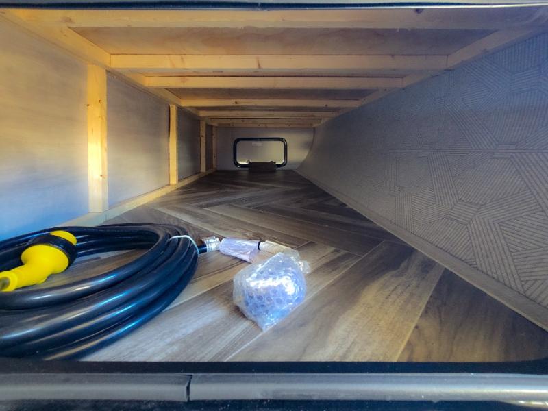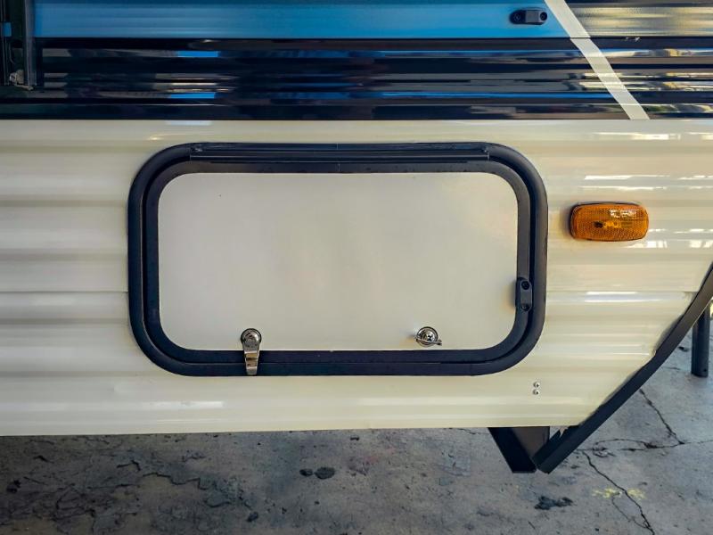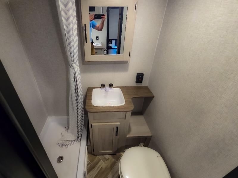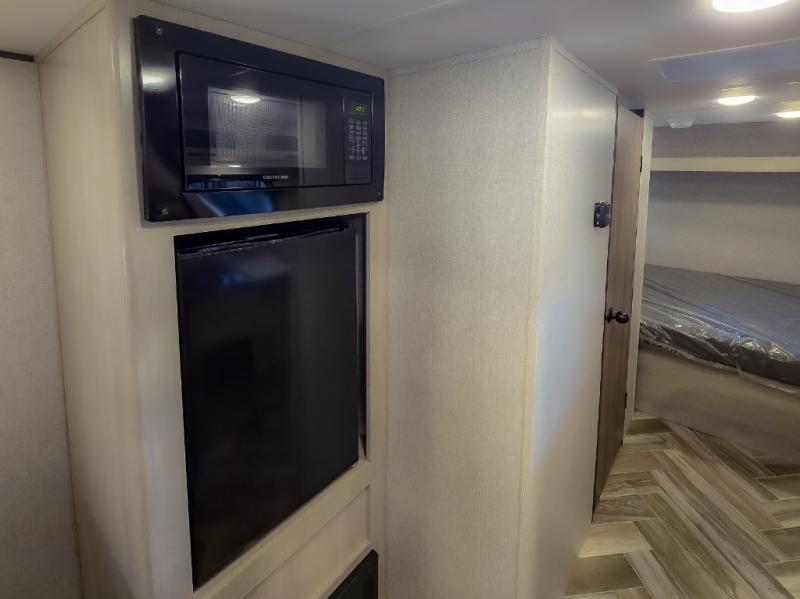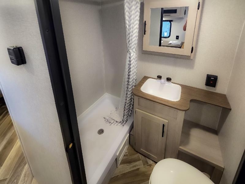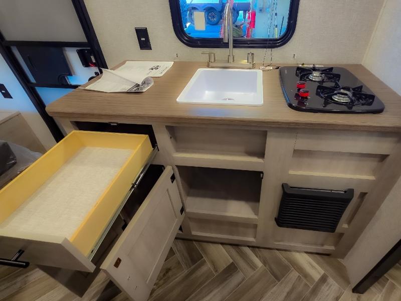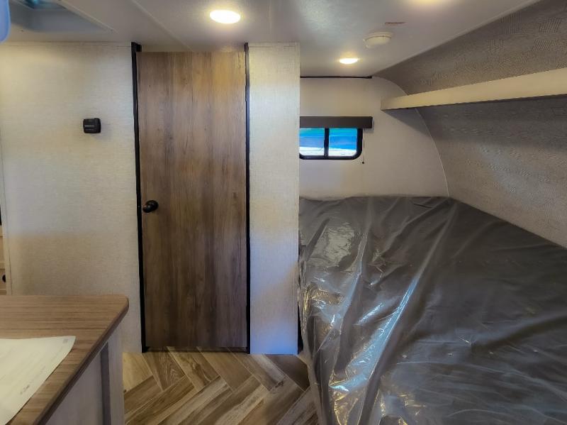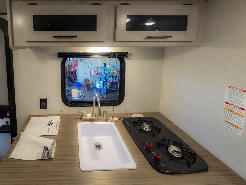 This is the perfect travel trailer to bring along guests or little ones since there are bunk beds in the back, along with a third bunk above a jackknife sofa. There is also a fold-up table by the sofa where you can dine at each day. This Zinger Lite kitchen includes a microwave oven, cooktop, and a 12V refrigerator for perishables. When you're ready for some shut-eye, the RV queen bed up front will provide a great night's rest, and there is bedroom overhead storage for your belongings.