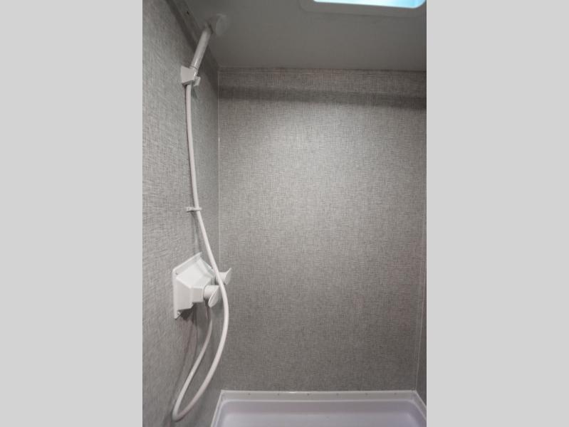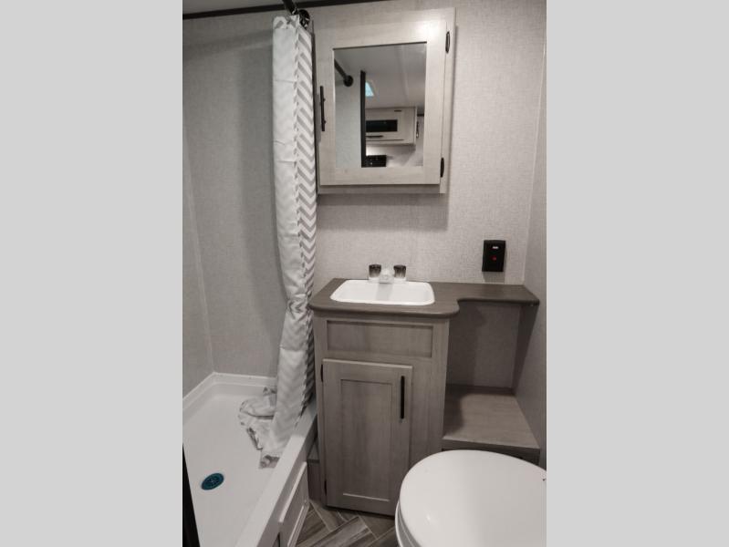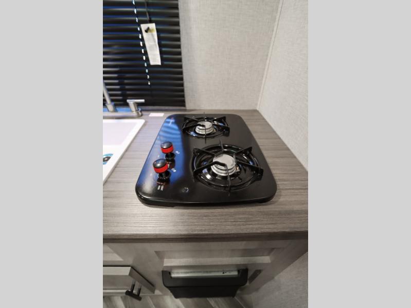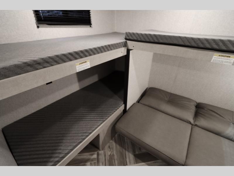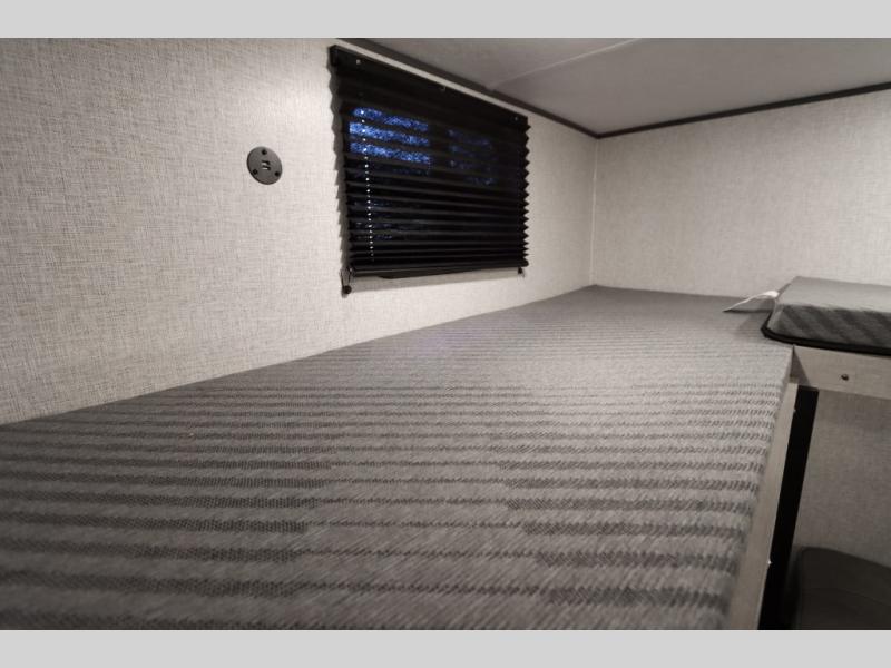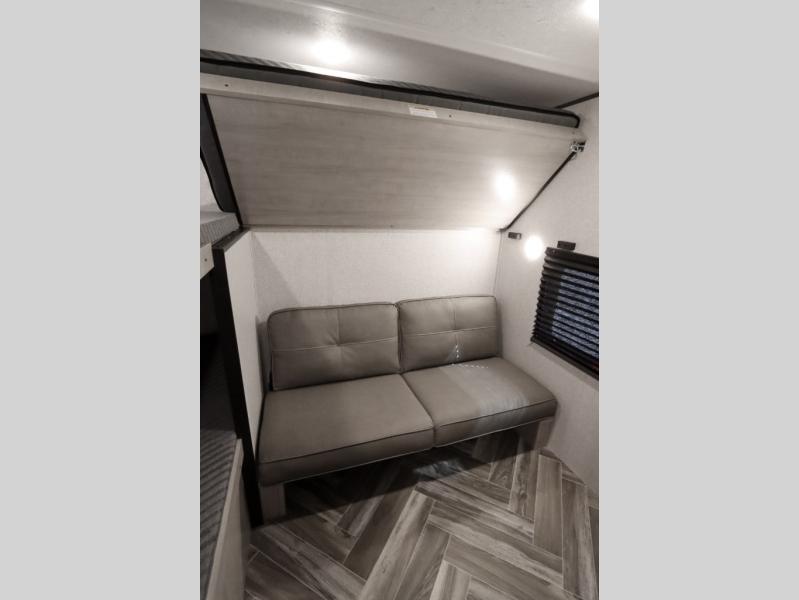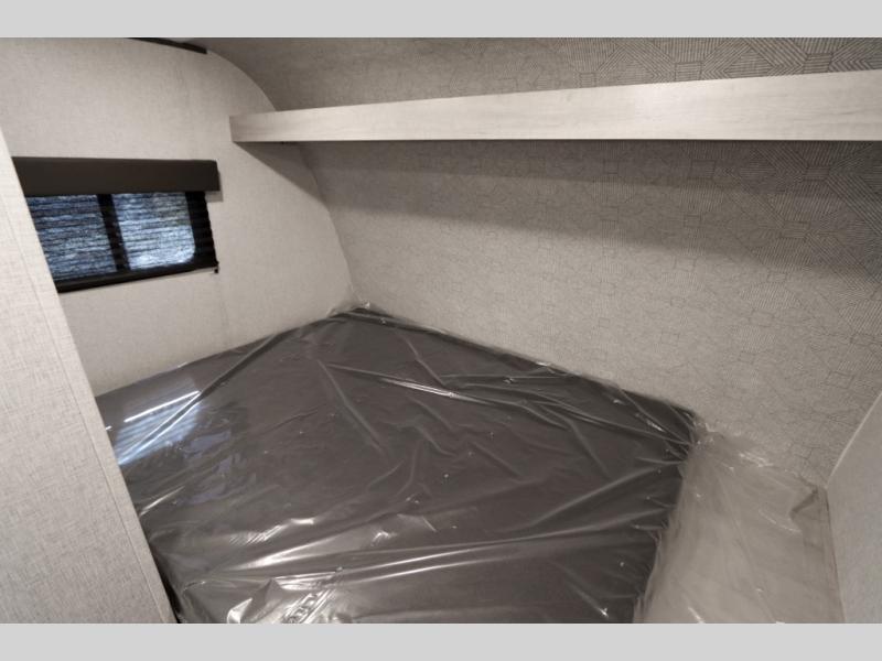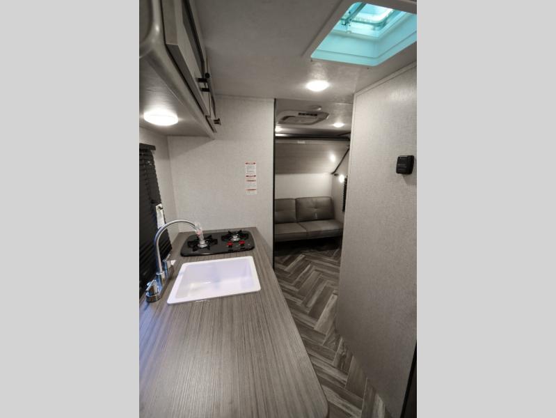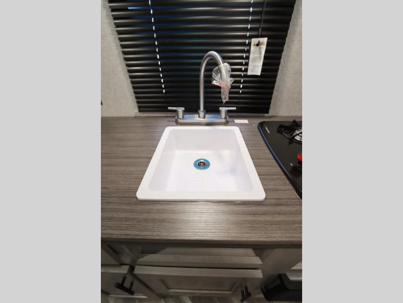 This is the perfect travel trailer to bring along guests or little ones since there are bunk beds in the back, along with a third bunk above a jackknife sofa. There is also a fold-up table by the sofa where you can dine at each day. This Zinger Lite kitchen includes a microwave oven, cooktop, and a 12V refrigerator for perishables. When you're ready for some shut-eye, the RV queen bed up front will provide a great night's rest, and there is bedroom overhead storage for your belongings.