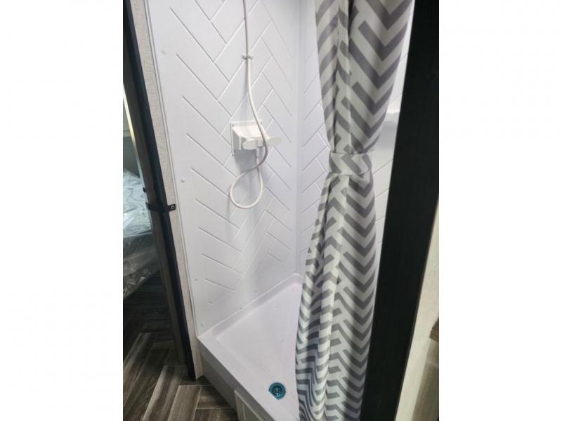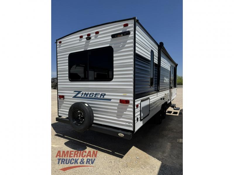 You and your spouse will not want to leave the campsite with this Zinger Lite travel trailer! There is a comfortable 60" jackknife sofa with an end table across from the front entertainment center which features an HDTV for you to watch your favorite movies on at night. The outstanding kitchen not only has two bar stools at the countertop, but it also has a 10 cu. ft. 12V refrigerator and an oven with an LED glass top. You can head right into the rear private bedroom from the walk-through bath and take a quick nap on the RV queen bed with shirt closets on either side to keep your hang-up clothes neat and tidy!