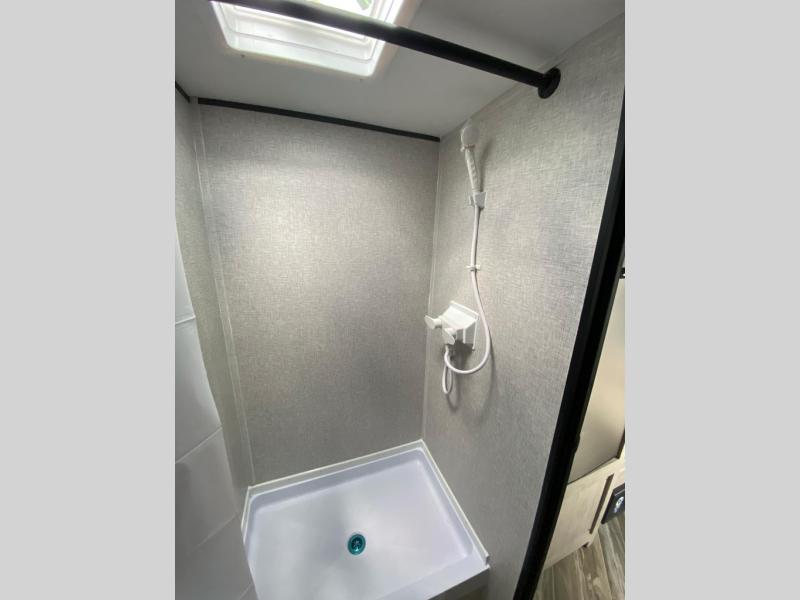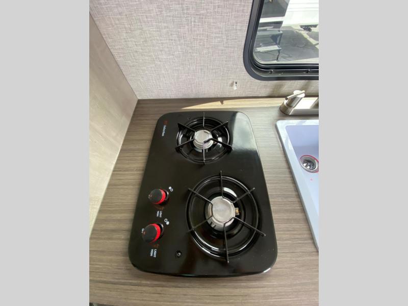 You and your spouse will love camping in this Zinger Lite travel trailer! The full rear bathroom has a 36" shower for you to rinse off the day and a linen closet to store your towels. You can prepare home-cooked meals with the two burner cooktop and enjoy eating them at the booth dinette. You will also start each day feeling ready to go after sleeping on the front RV queen bed with an overhead shelf for your belongings.