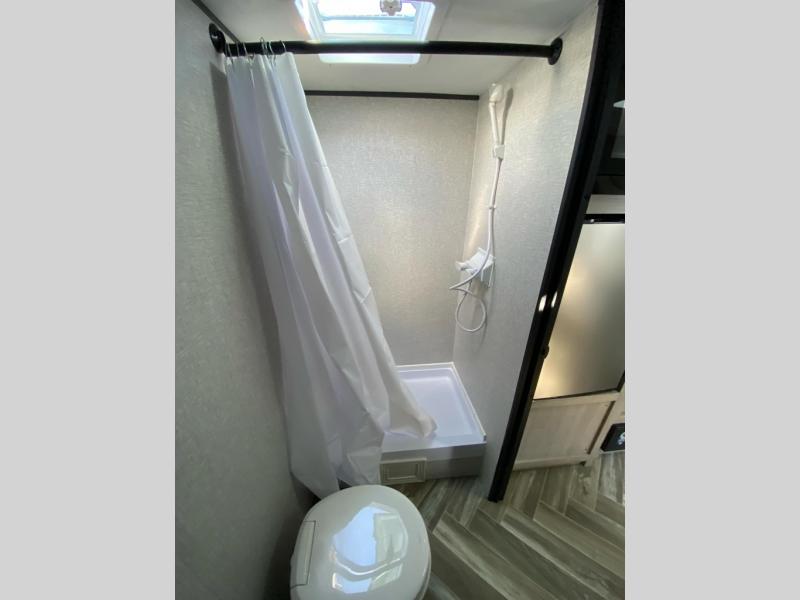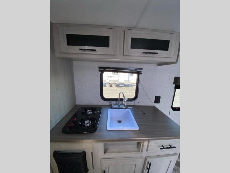 You and your spouse will love camping in this Zinger Lite travel trailer! The full rear bathroom has a 36" shower for you to rinse off the day and a linen closet to store your towels. You can prepare home-cooked meals with the two burner cooktop and enjoy eating them at the booth dinette. You will also start each day feeling ready to go after sleeping on the front RV queen bed with an overhead shelf for your belongings.