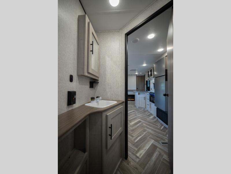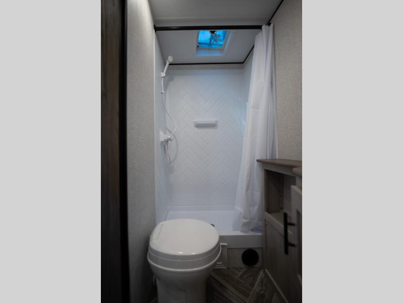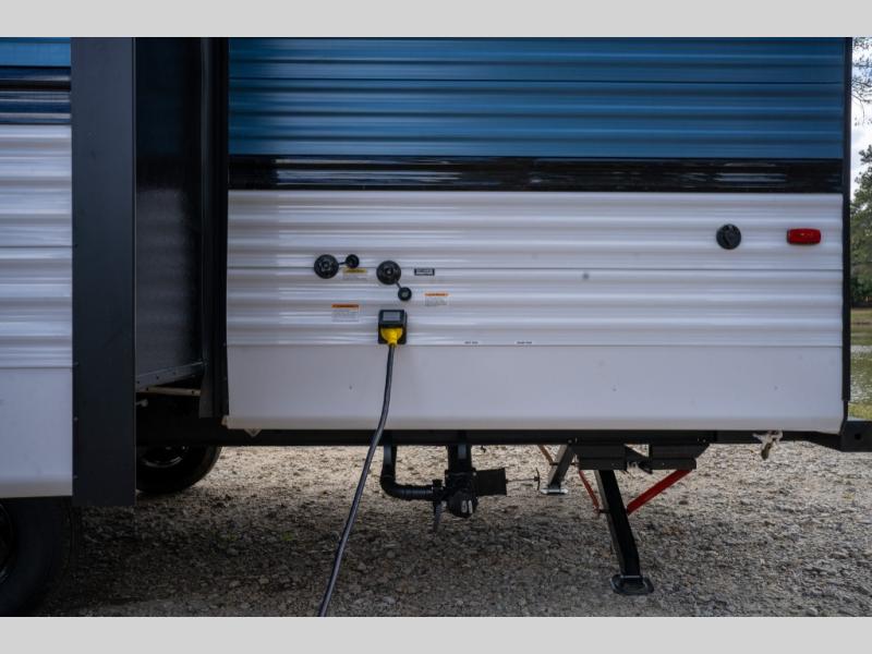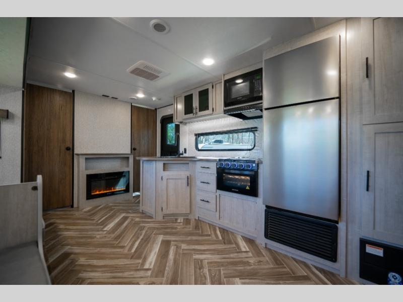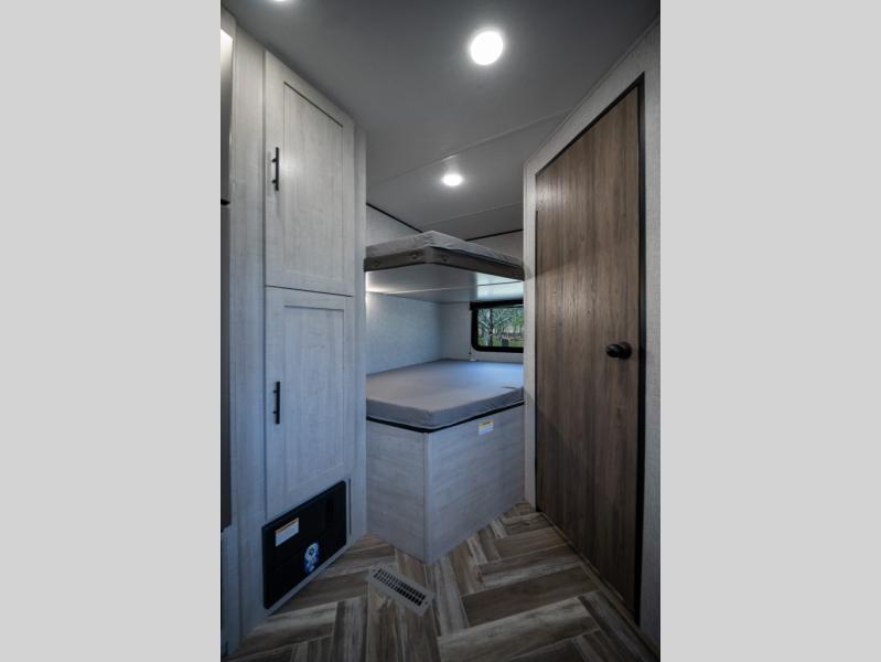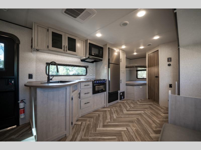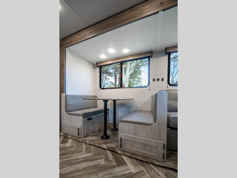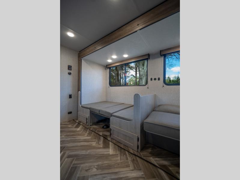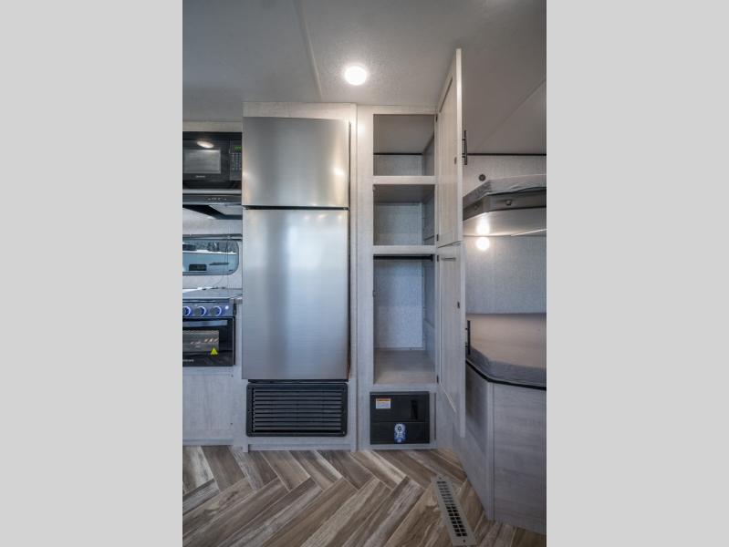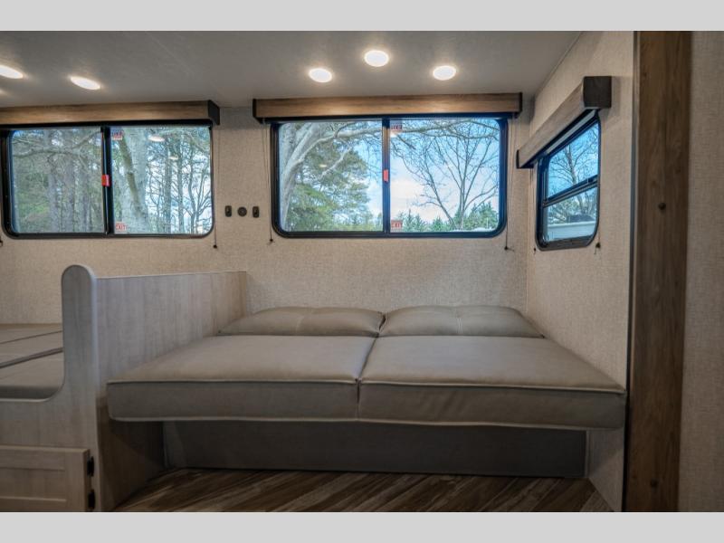 If you've been searching for a travel trailer that can sleep more campers and give you more interior space, this is the one! There are double-size bunks with a ladder for the little ones, an RV queen bed in the front bedroom, plus a jackknife sofa and booth dinette that will double as seating and sleeping space. You will be able to make home cooked meals for your crew since there is a three burner range with a glass top and LED lit knobs, and the 10 cu. ft. 12V refrigerator can keep your food fresh. This model also includes a full bath with a 30" x 36" shower, a foot flush toilet, and a medicine cabinet to keep items organized.