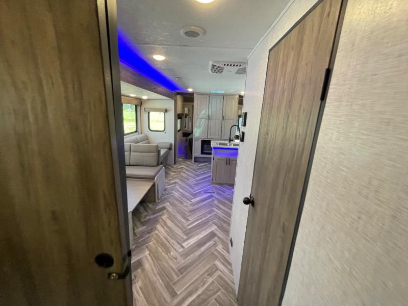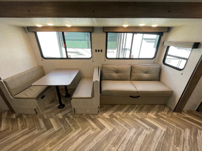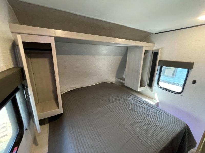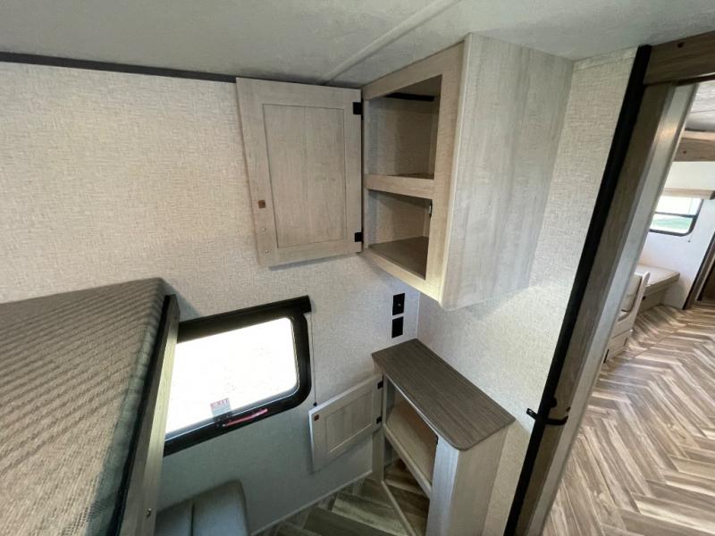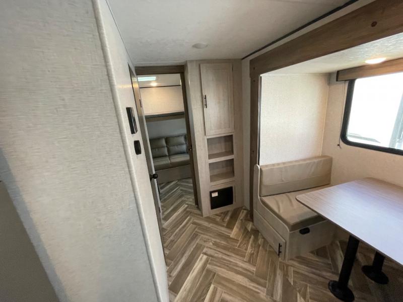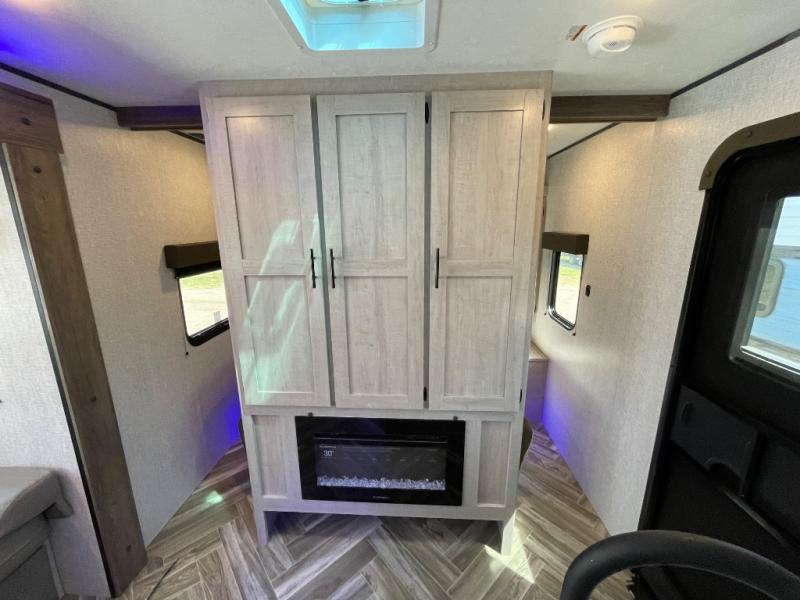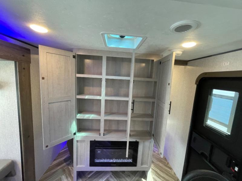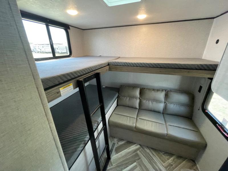 The whole gang will love camping in this spacious travel trailer for nine! There is a rear private bunkhouse with set of bunk beds plus a third bunk over the jack sofa, a mat under the sofa for even more sleeping space, and a dresser to keep this room tidy. You'll have the front private bedroom all to yourselves which includes an RV queen bed and dual shirt closets. In the morning, everyone can meet in the combined kitchen and living area that includes an 80" booth dinette and jack knife sofa within the large slide out, full kitchen amenities, and an entertainment center with a fireplace to make it feel more like home. And the full bath is another plus when camping!