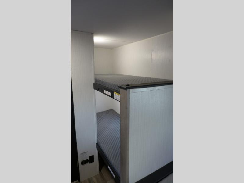This cozy bunk model has exactly what you need for a fun camping trip to your favorite campgrounds! The rear corner bunks will be a delight for the children, and if there are more than two, you can always fold down the booth dinette for one or two more depending on size. A queen bed up front will offer comfortable sleeping for two more which means this unit can sleep four to six. The rear corner private shower and toilet will keep you from having to use the campground facilities, and the location next to the bunks is handy for little ones at night. Cooking will also be a breeze with a two burner cooktop, sink, and refrigerator for your perishables so you don't have to rely on cooking over an open fire if you don't want to. Save the fire for the s'mores! You also have a handy awning for outdoor protection, and exterior storage as well.