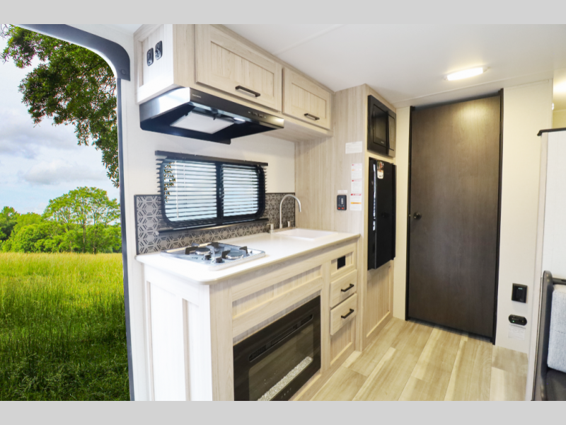 • Galley 3.3 cu ft 12V refrigerator 2burner cooktop microwave-ready cabinet single basin sink