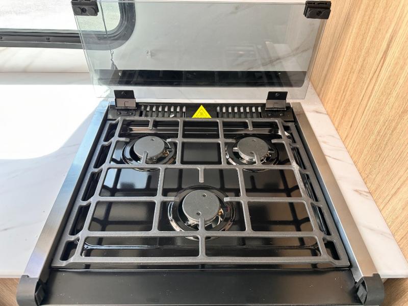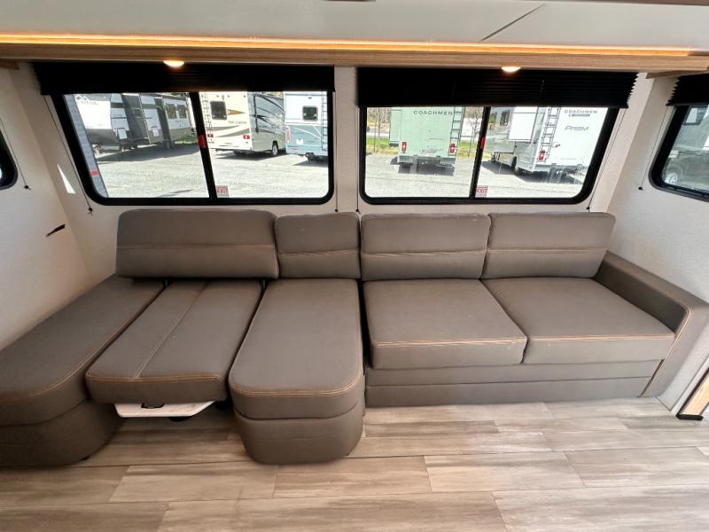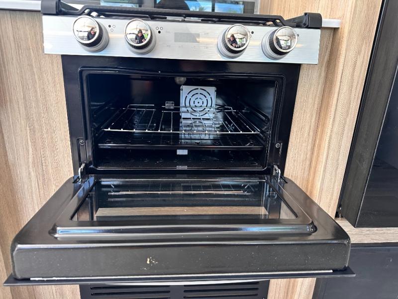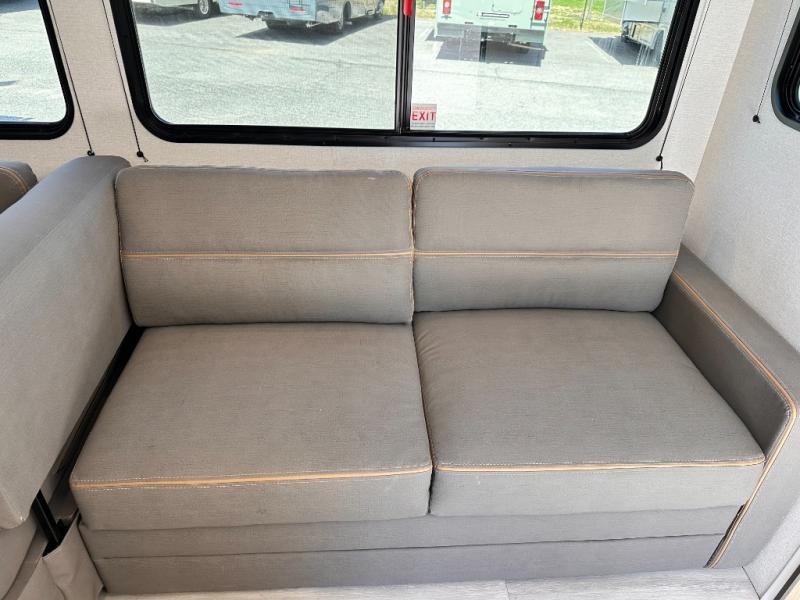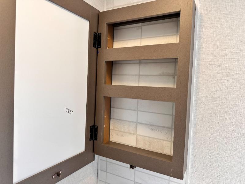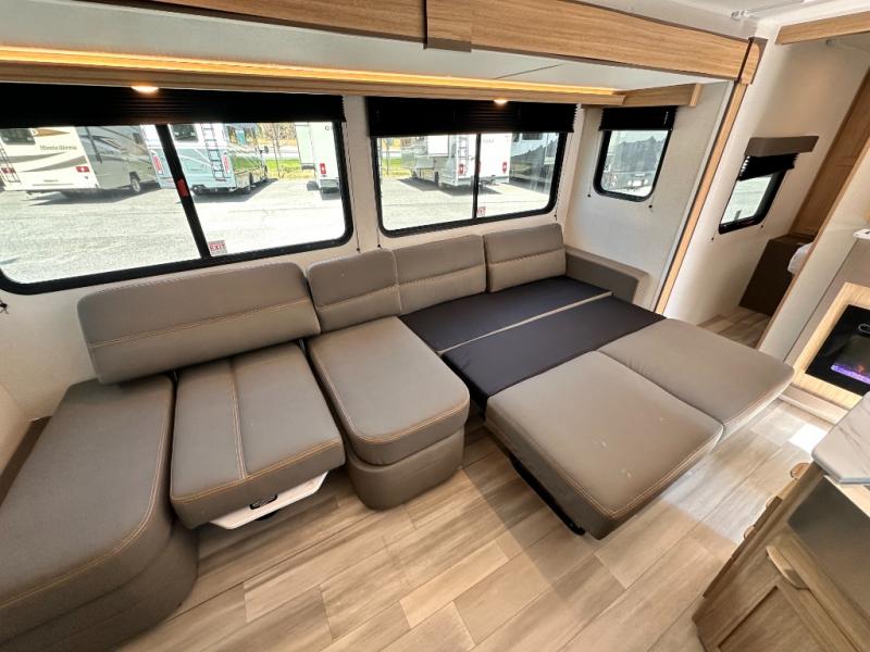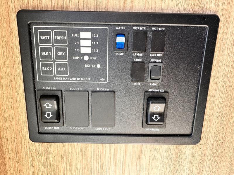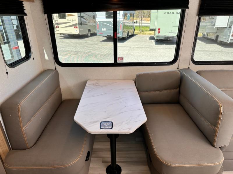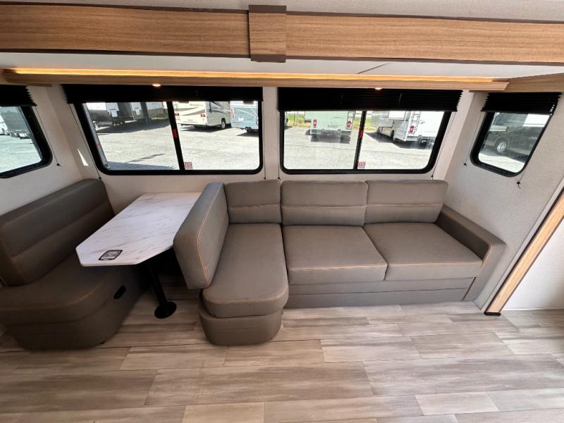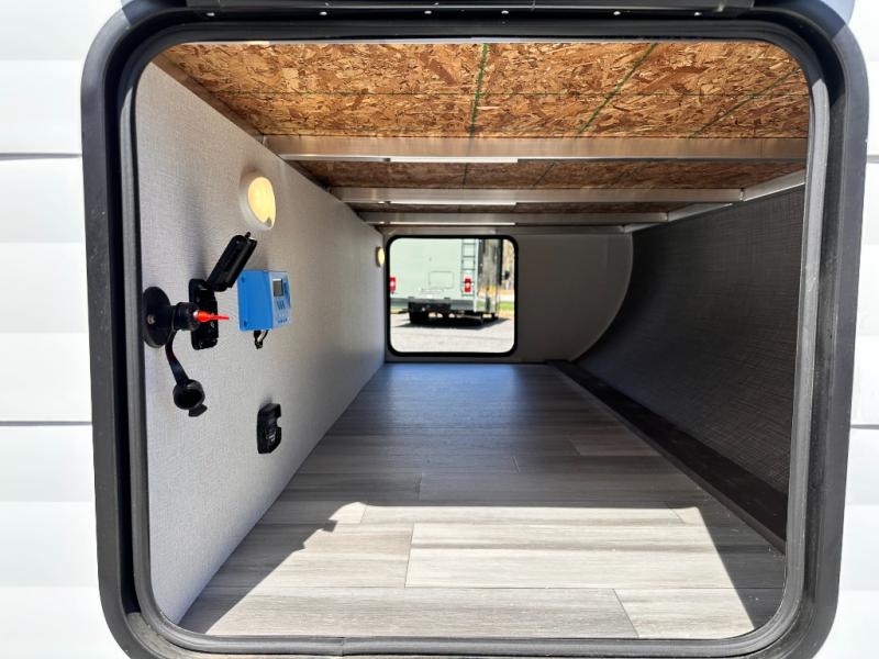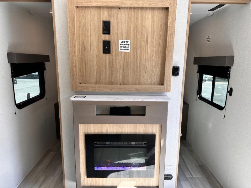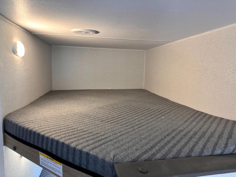 Dual entry doors, sleeping space for nine, and a spacious interior make this model perfect for camping with a larger group! Your crew can relax by the fireplace in the evening on the Lux Lounge, which will convert to sleeping space. There is also a booth dinette that will provide a place to dine each day, as well as a place for more guests to sleep if needed. You can be sure the double-size bunks will be claimed by the littles ones, and the queen bed in the front private bedroom will provide a great night's rest after adventuring in the woods. Whip up your best meals on the three burner cooktop, freshen up in the full bath with its own exterior entry door, grab a cold drink from the exterior refrigerator, and do so much more in this spacious trailer!