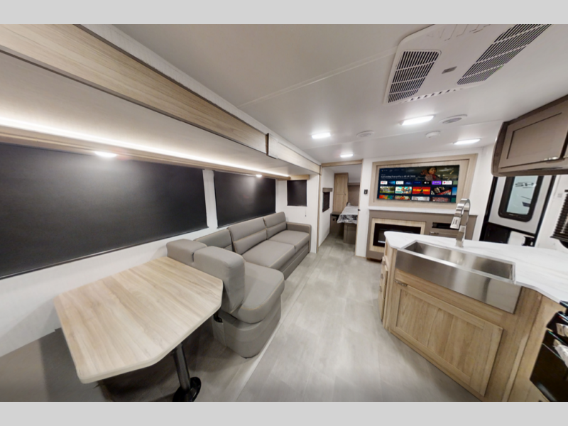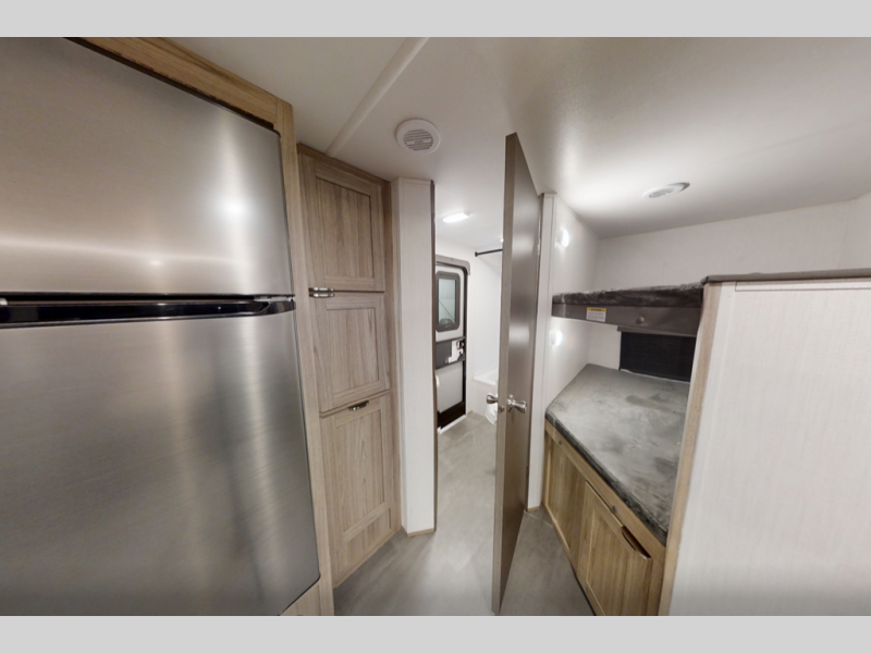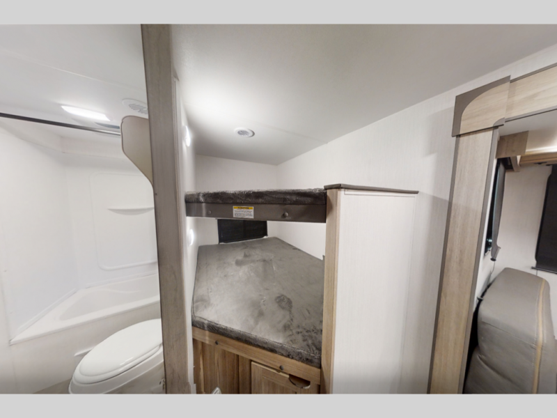 Dual entry doors, sleeping space for nine, and a spacious interior make this model perfect for camping with a larger group! Your crew can relax by the fireplace in the evening on the Lux Lounge, which will convert to sleeping space. There is also a booth dinette that will provide a place to dine each day, as well as a place for more guests to sleep if needed. You can be sure the double-size bunks will be claimed by the littles ones, and the queen bed in the front private bedroom will provide a great night's rest after adventuring in the woods. Whip up your best meals on the three burner cooktop, freshen up in the full bath with its own exterior entry door, grab a cold drink from the exterior refrigerator, and do so much more in this spacious trailer!