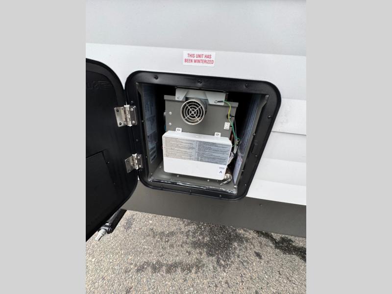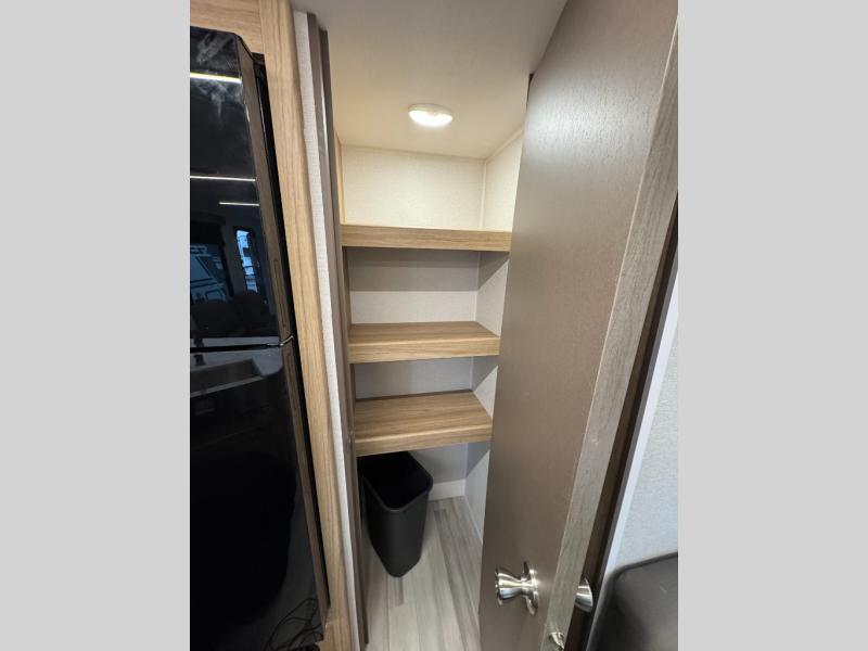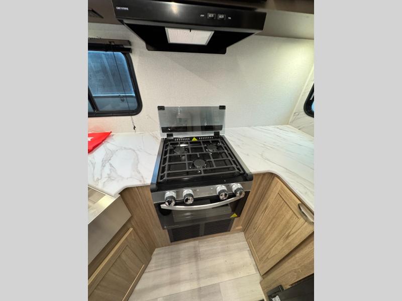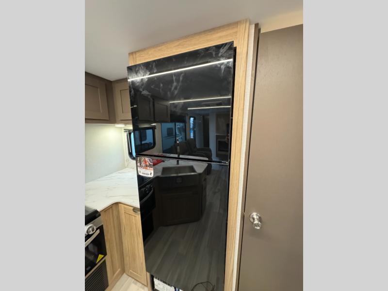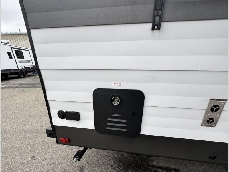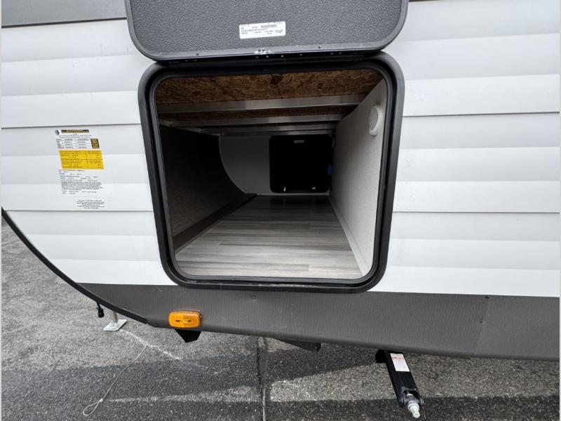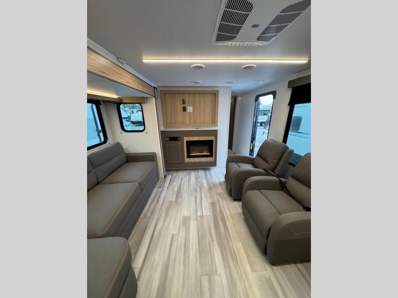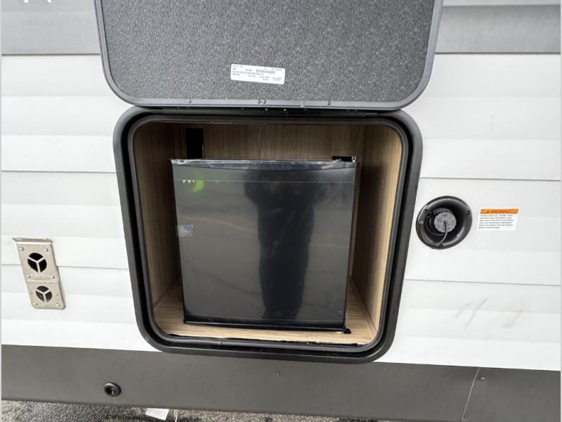 Start a new journey in this cozy travel trailer for five to six. The rear kitchen includes ample counter space to prep meals, a three burner cooktop, plus a spacious pantry where you can keep dry goods and snacks. There are two lounge chairs to relax on, along with a Lux Lounge, and a booth dinette. The fireplace is sure to make your space feel a little more like home, as well as the front private bedroom with a queen bed. The spacious full bath is close by the bedroom for convenience, and there is a bedroom wardrobe so you're not living out of a suitcase all weekend! You can unload your camping chairs from the full pass-through storage, grab a cold drink from the exterior refrigerator, and relax under the 18' patio awning!