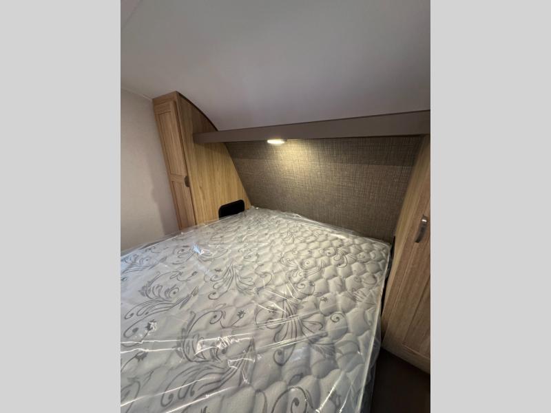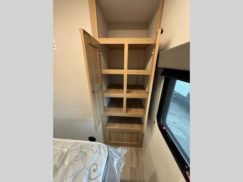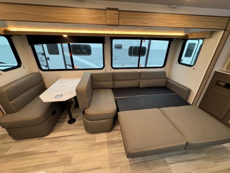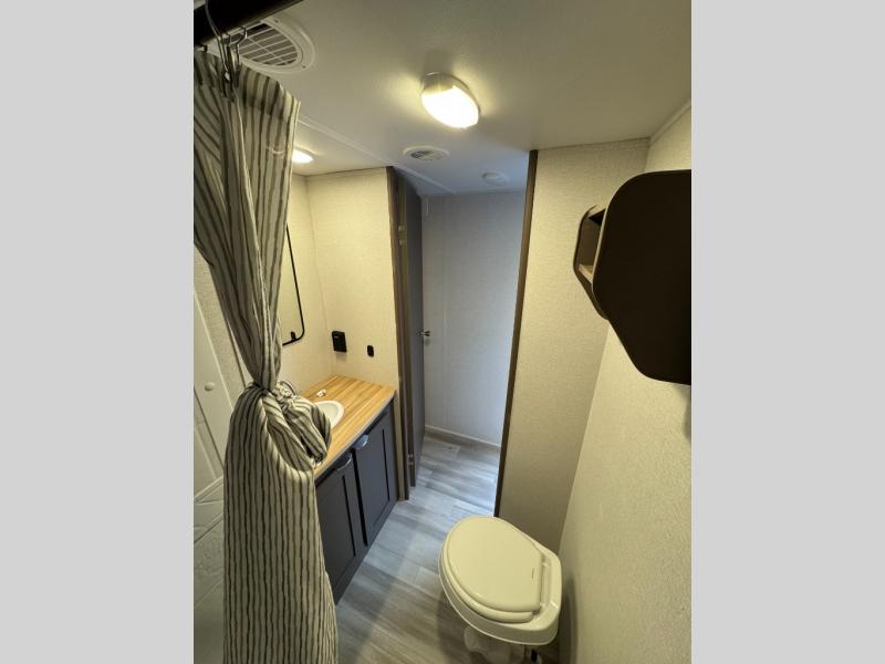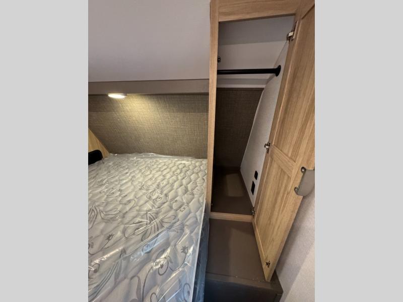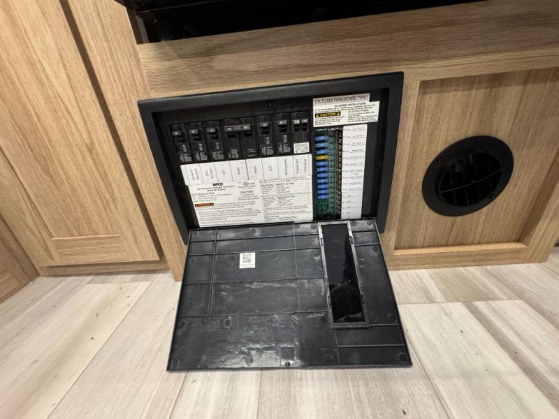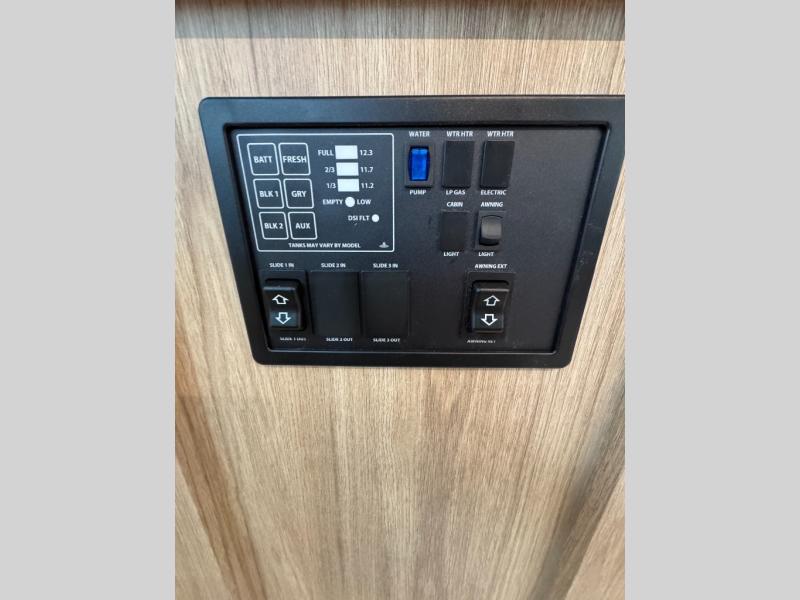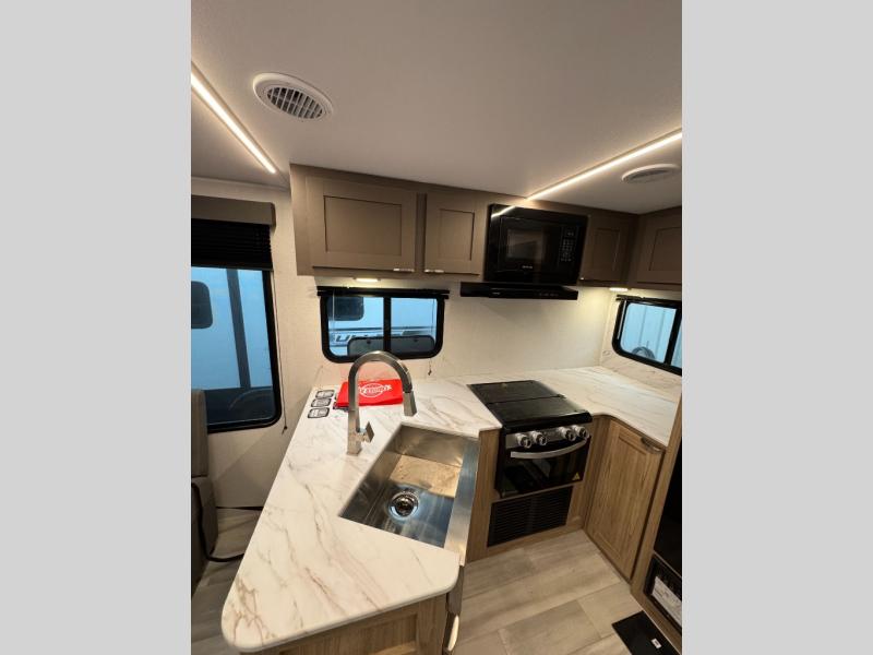 Start a new journey in this cozy travel trailer for five to six. The rear kitchen includes ample counter space to prep meals, a three burner cooktop, plus a spacious pantry where you can keep dry goods and snacks. There are two lounge chairs to relax on, along with a Lux Lounge, and a booth dinette. The fireplace is sure to make your space feel a little more like home, as well as the front private bedroom with a queen bed. The spacious full bath is close by the bedroom for convenience, and there is a bedroom wardrobe so you're not living out of a suitcase all weekend! You can unload your camping chairs from the full pass-through storage, grab a cold drink from the exterior refrigerator, and relax under the 18' patio awning!