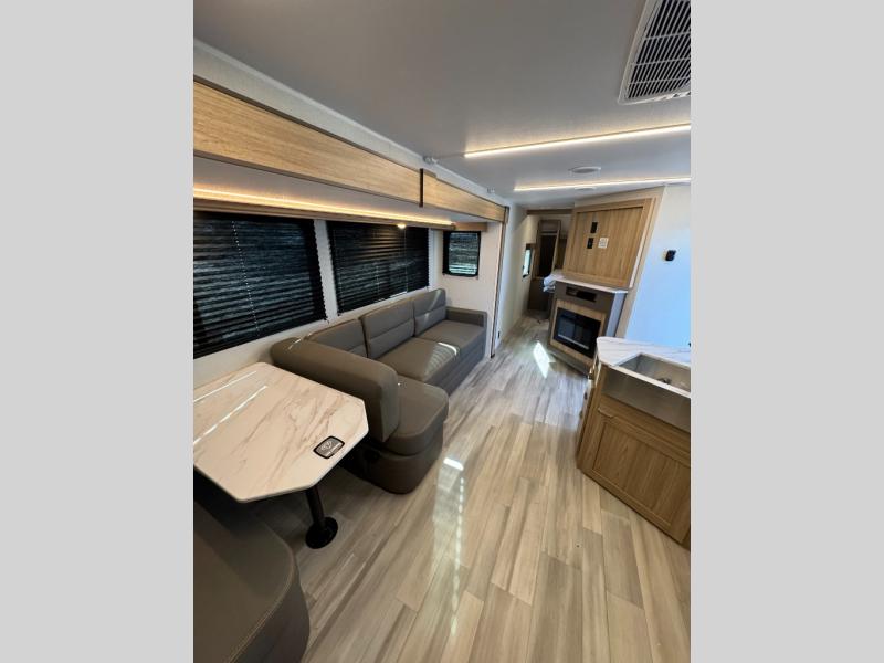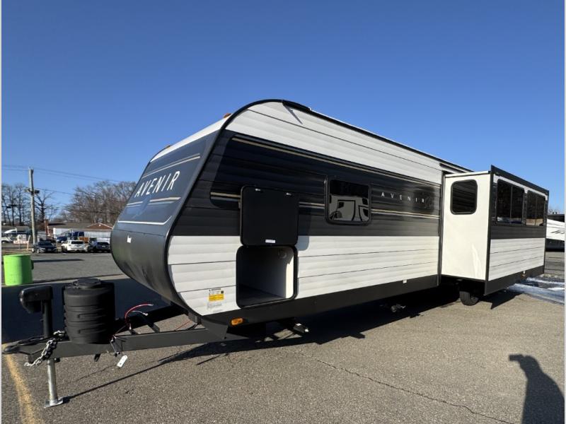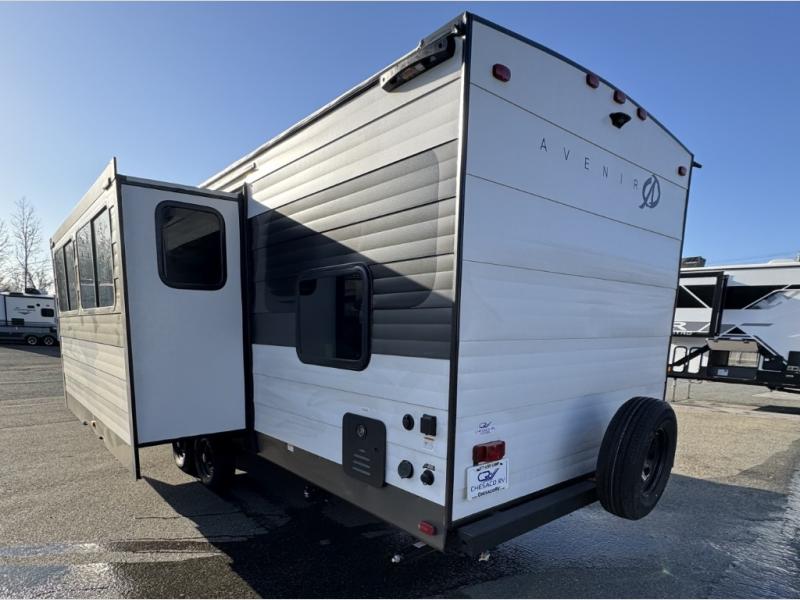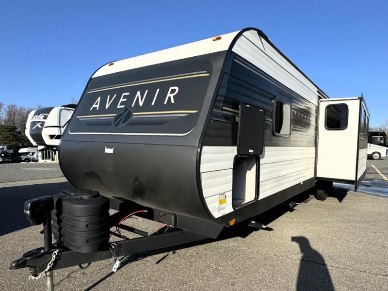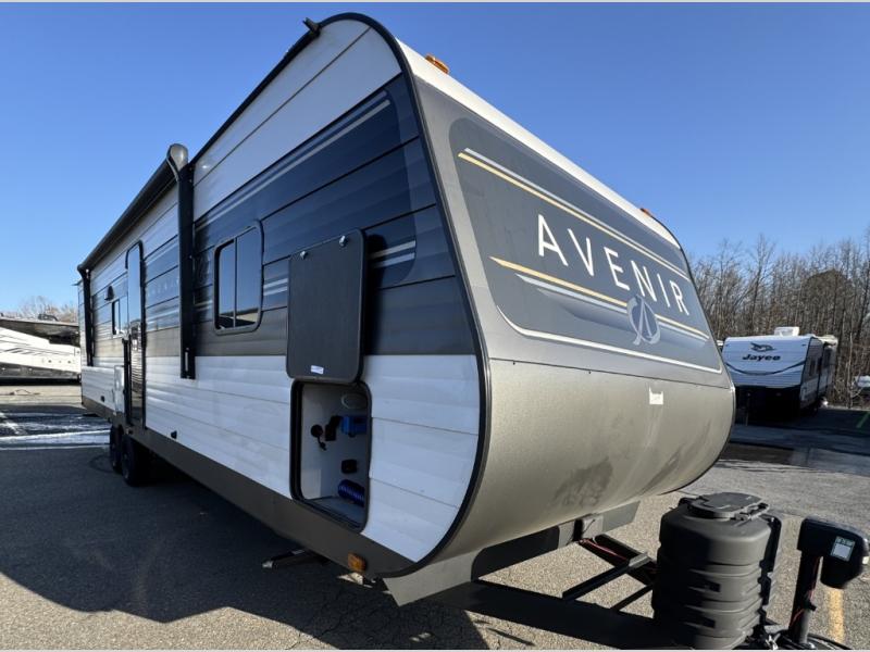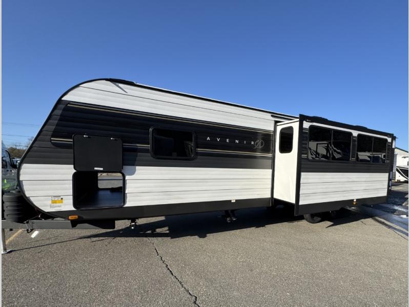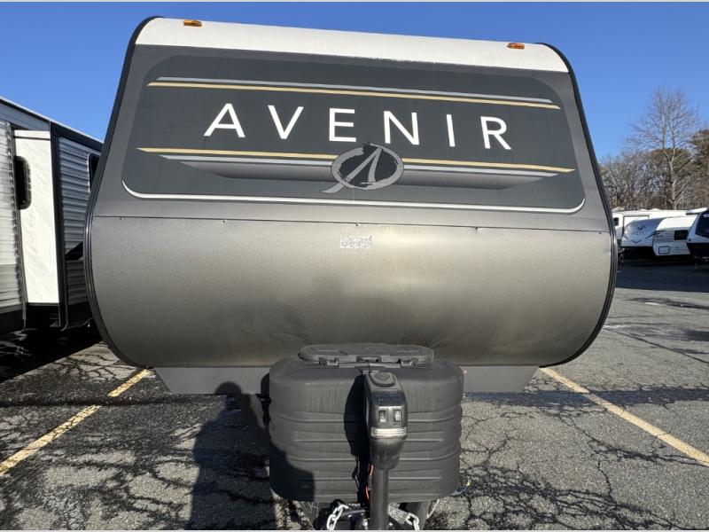 This spacious Avenir offers sleeping space for a large group with a private bunkhouse in back featuring a bunk over a jackknife sofa and a second set of bunks sleeping five total in this space. There is also a dresser for storage opposite the sofa with TV prep above it. In the main combined kitchen and living room you will enjoy added space thanks to a large slide out 42" x 76" booth dinette and Lux Lounge which can both be converted to extra sleeping space if needed. An angled interior wall from the bathroom is where you will view the fireplace. Opposite the slide is your kitchen area where you can easily create meals and snacks just like home. You will find a large pantry, refrigerator, three burner cooktop and large sink for cleaning up. There is also a microwave oven and overhead storage for all of your dishes. An outside refrigerator under the 18' awning allows you to keep drinks and cold snacks readily available when spending time outside. A full bath with radius shower will keep everyone feeling clean and fresh, and the private front bedroom offers a queen bed, dual nightstands and storage with a full pass-through on the outside beneath the head of the bed for all of your outdoor gear.