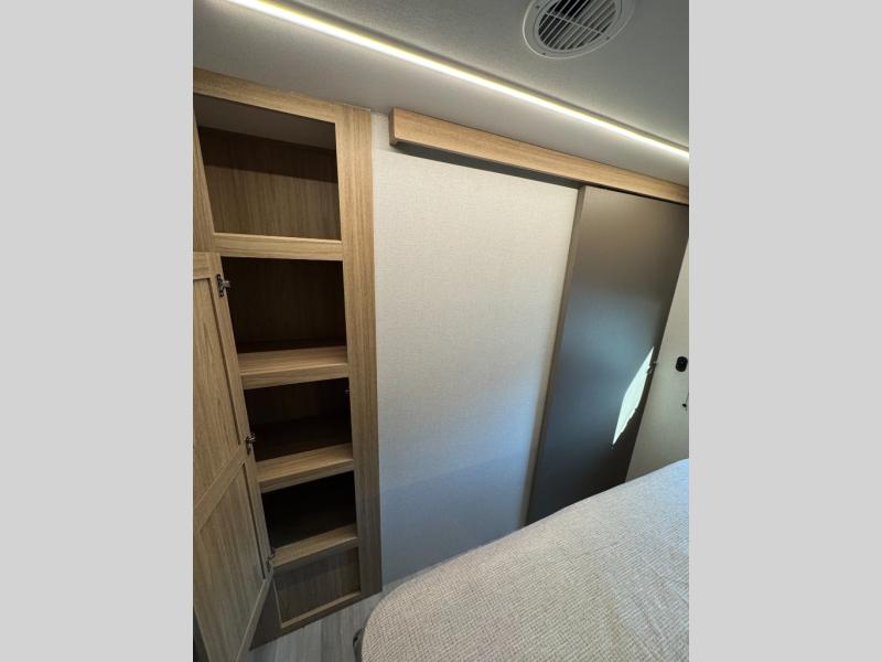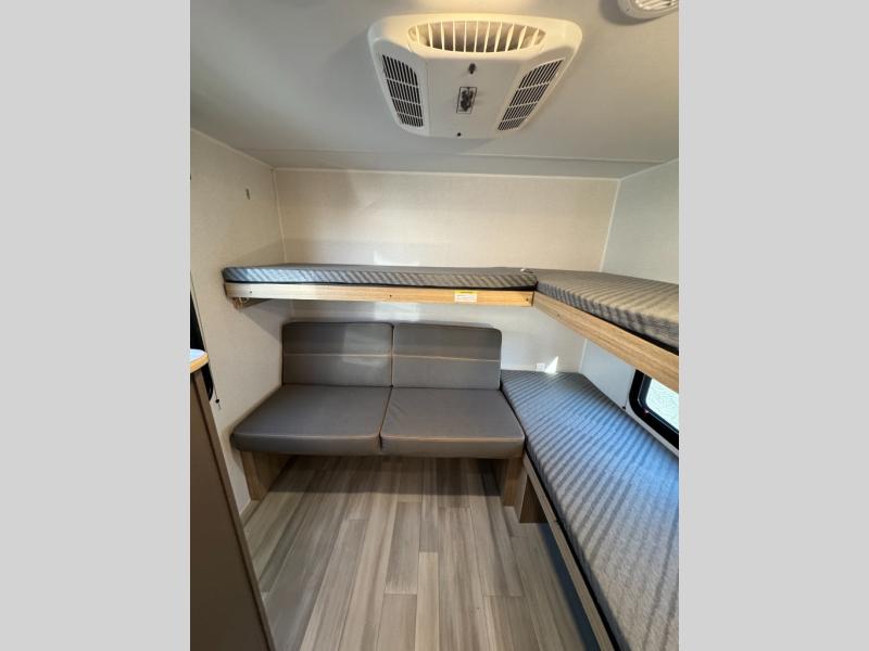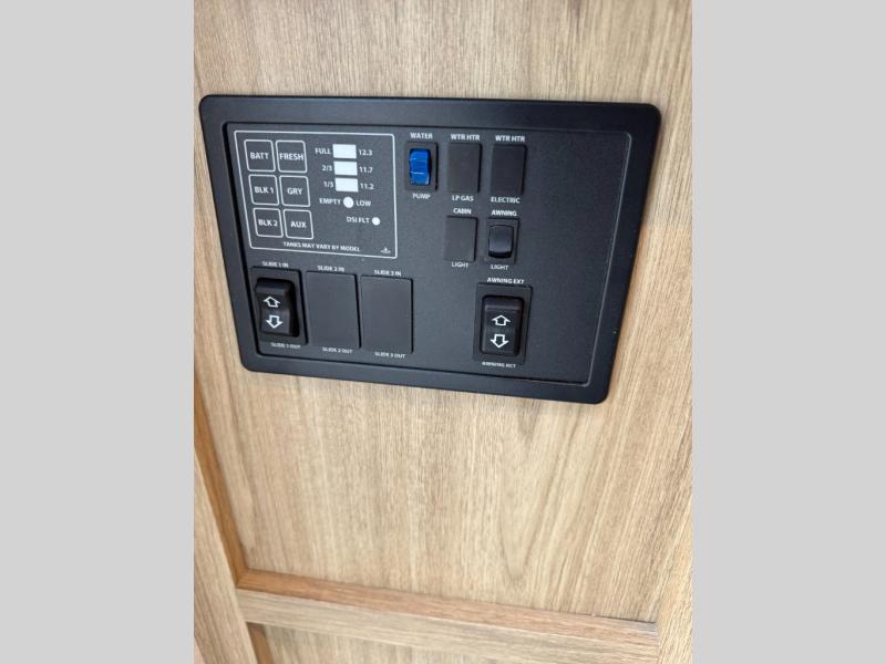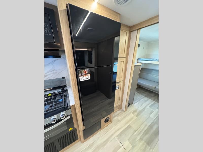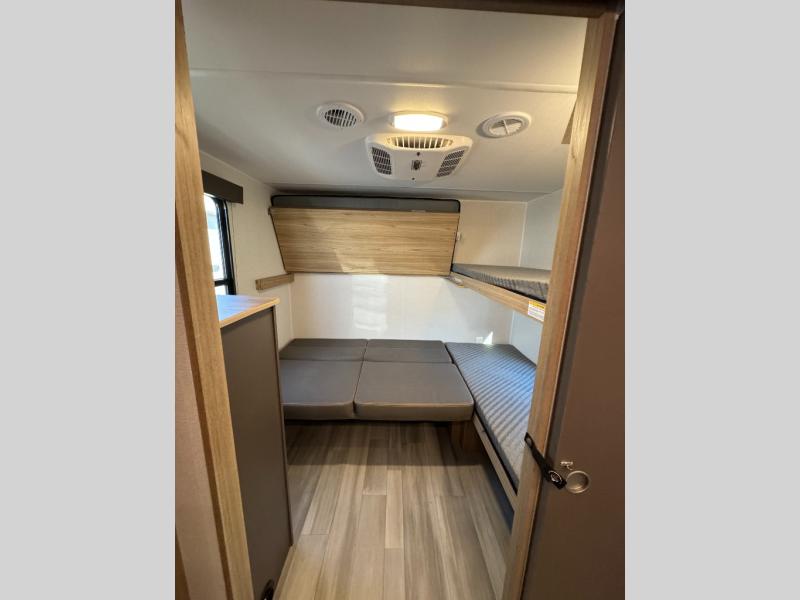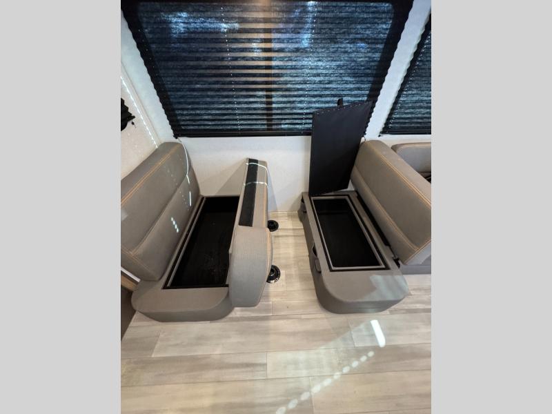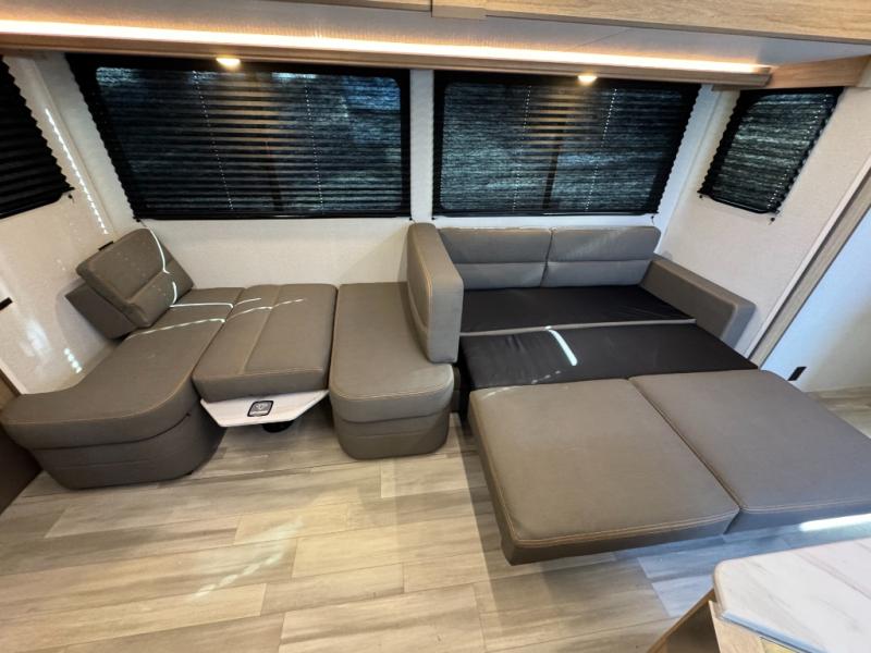 This spacious Avenir offers sleeping space for a large group with a private bunkhouse in back featuring a bunk over a jackknife sofa and a second set of bunks sleeping five total in this space. There is also a dresser for storage opposite the sofa with TV prep above it. In the main combined kitchen and living room you will enjoy added space thanks to a large slide out 42" x 76" booth dinette and Lux Lounge which can both be converted to extra sleeping space if needed. An angled interior wall from the bathroom is where you will view the fireplace. Opposite the slide is your kitchen area where you can easily create meals and snacks just like home. You will find a large pantry, refrigerator, three burner cooktop and large sink for cleaning up. There is also a microwave oven and overhead storage for all of your dishes. An outside refrigerator under the 18' awning allows you to keep drinks and cold snacks readily available when spending time outside. A full bath with radius shower will keep everyone feeling clean and fresh, and the private front bedroom offers a queen bed, dual nightstands and storage with a full pass-through on the outside beneath the head of the bed for all of your outdoor gear.