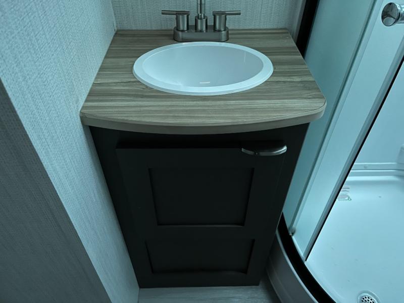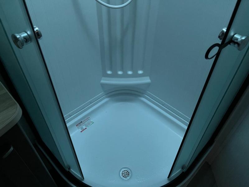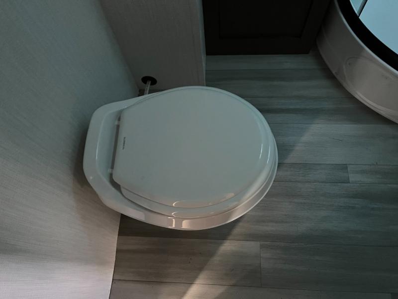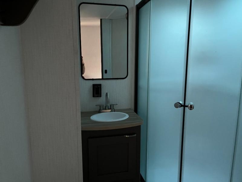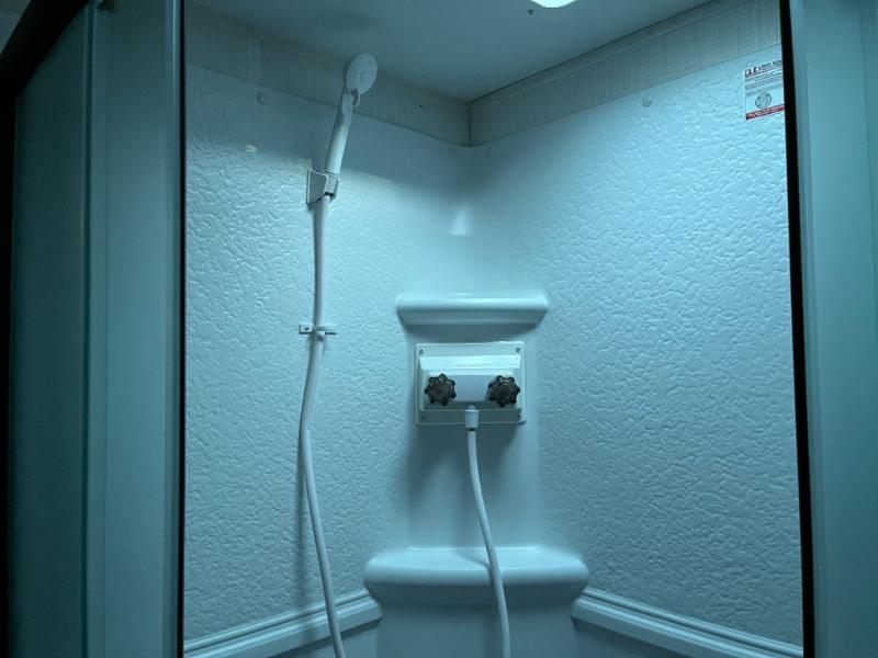 Shower, toilet, and vanity bring everyday convenience to your campsite.