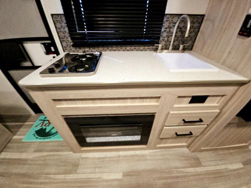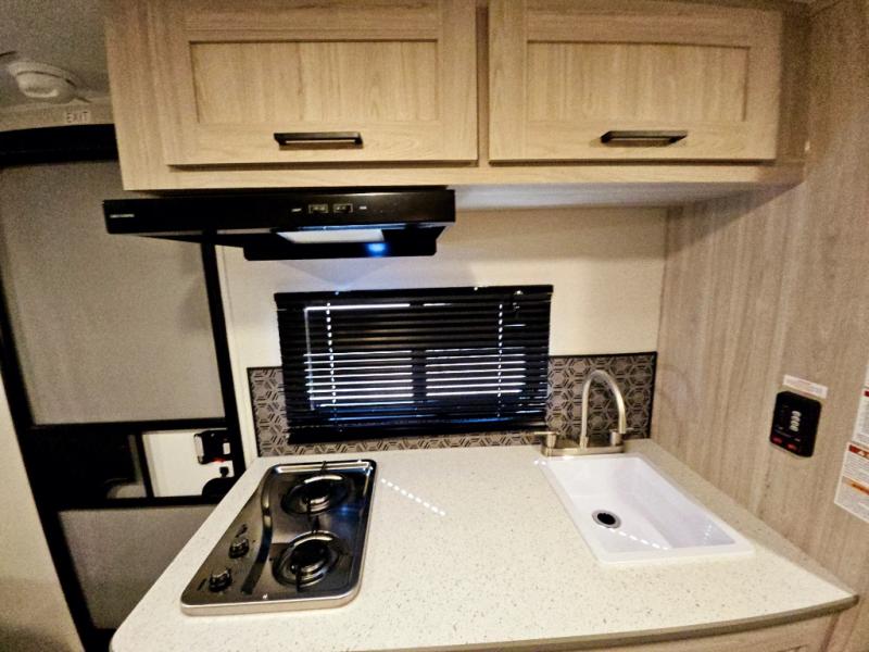 - E:ectric Water Heater, Damond Plate Stone Guard, Range W/ 2 Burner Cook Top, 2lb LP Tank,