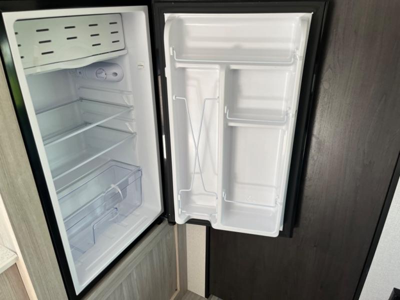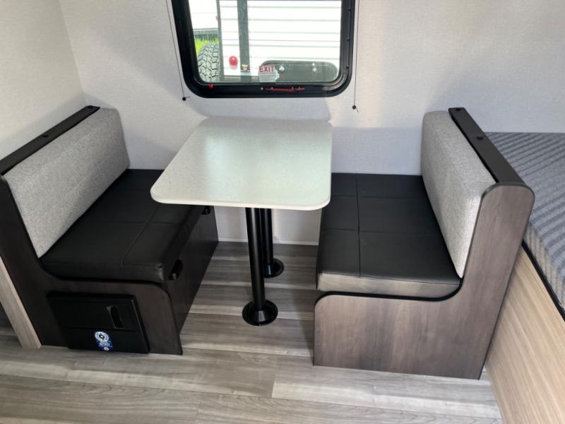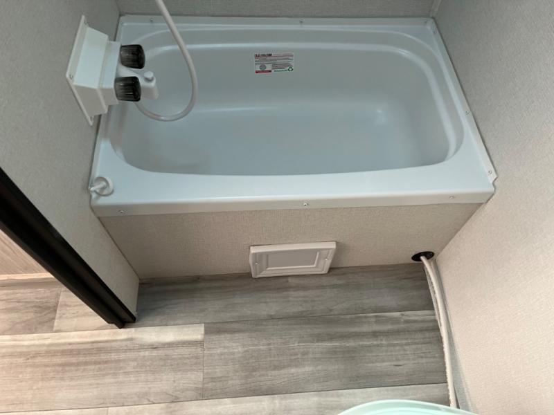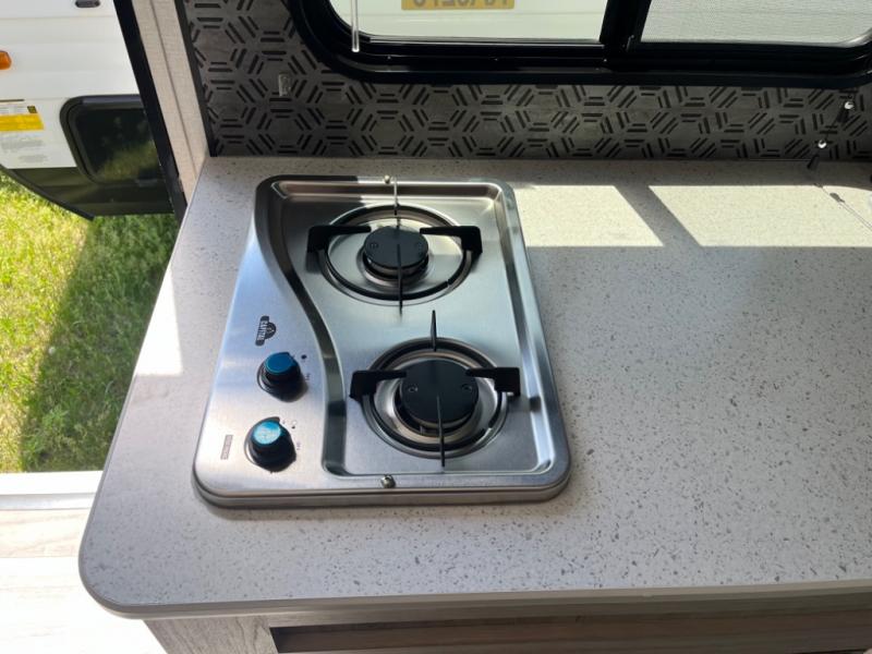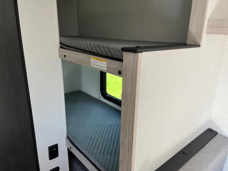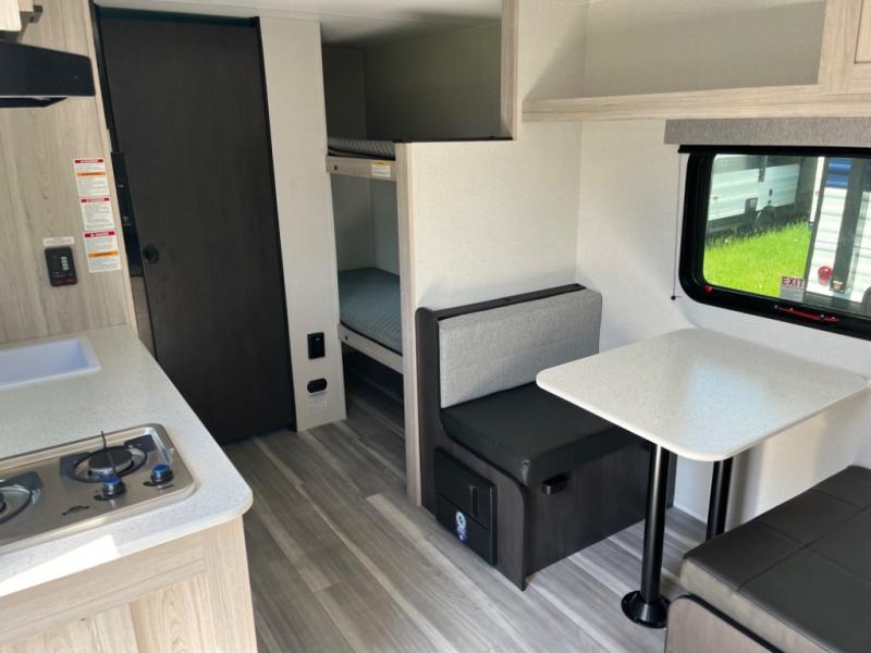 This cozy bunk model has exactly what you need for a fun camping trip to your favorite campgrounds! The rear corner bunks will be a delight for the children, and if there are more than two, you can always fold down the booth dinette for one or two more depending on size. A queen bed up front will offer comfortable sleeping for two more which means this unit can sleep four to six. The rear corner private shower and toilet will keep you from having to use the campground facilities, and the location next to the bunks is handy for little ones at night. Cooking will also be a breeze with a two burner cooktop, sink, and refrigerator for your perishables so you don't have to rely on cooking over an open fire if you don't want to. Save the fire for the s'mores! You also have a handy 8' awning for outdoor protection, and exterior storage as well.