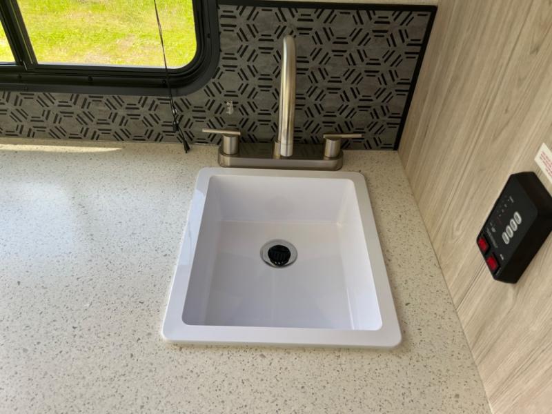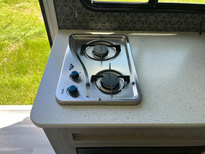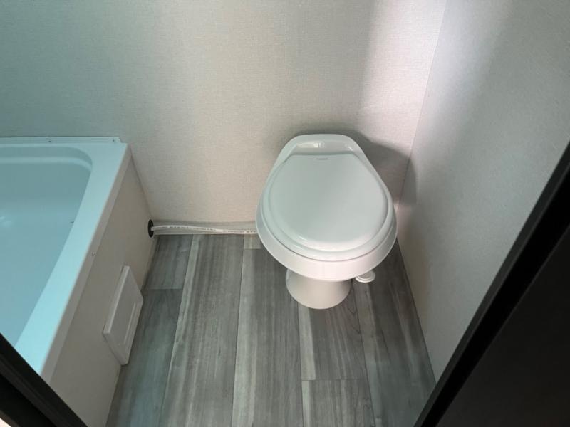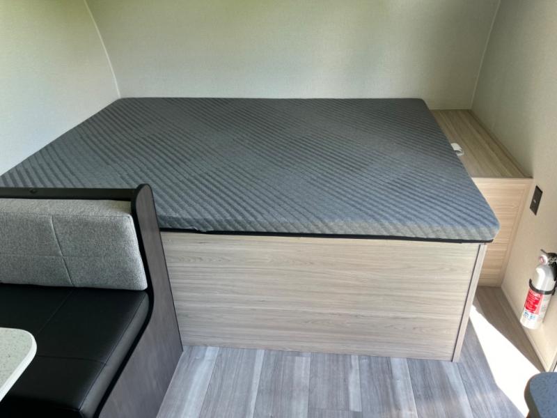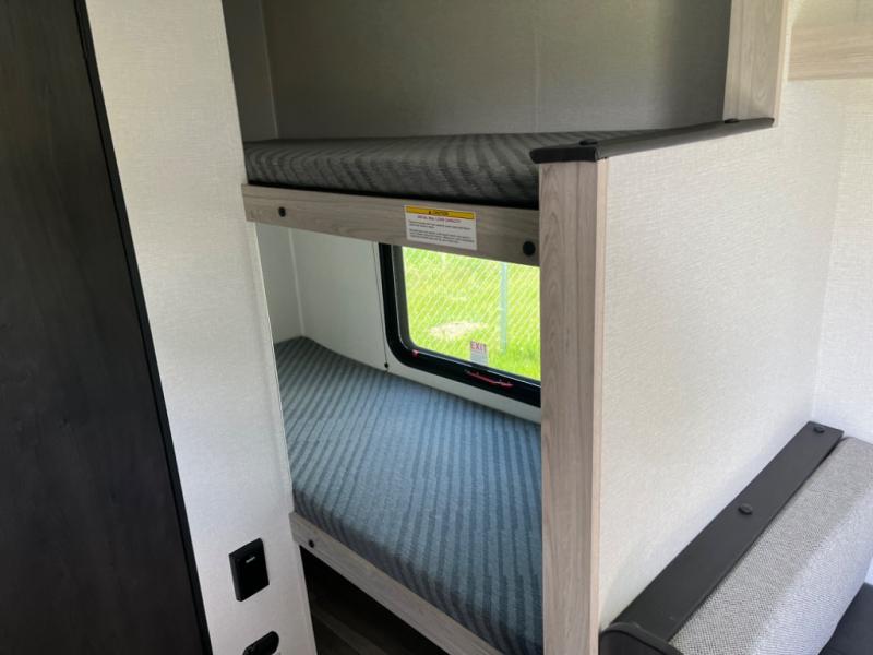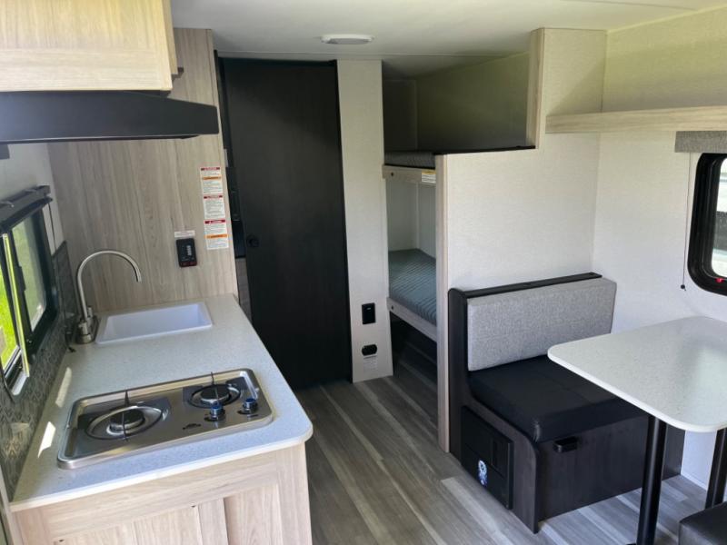 This cozy bunk model has exactly what you need for a fun camping trip to your favorite campgrounds! The rear corner bunks will be a delight for the children, and if there are more than two, you can always fold down the booth dinette for one or two more depending on size. A queen bed up front will offer comfortable sleeping for two more which means this unit can sleep four to six. The rear corner private shower and toilet will keep you from having to use the campground facilities, and the location next to the bunks is handy for little ones at night. Cooking will also be a breeze with a two burner cooktop, sink, and refrigerator for your perishables so you don't have to rely on cooking over an open fire if you don't want to. Save the fire for the s'mores! You also have a handy 8' awning for outdoor protection, and exterior storage as well.