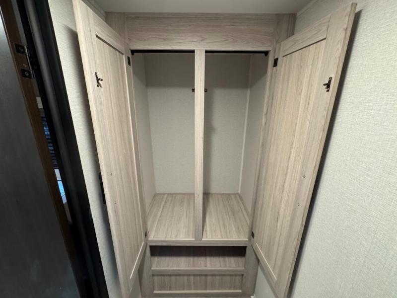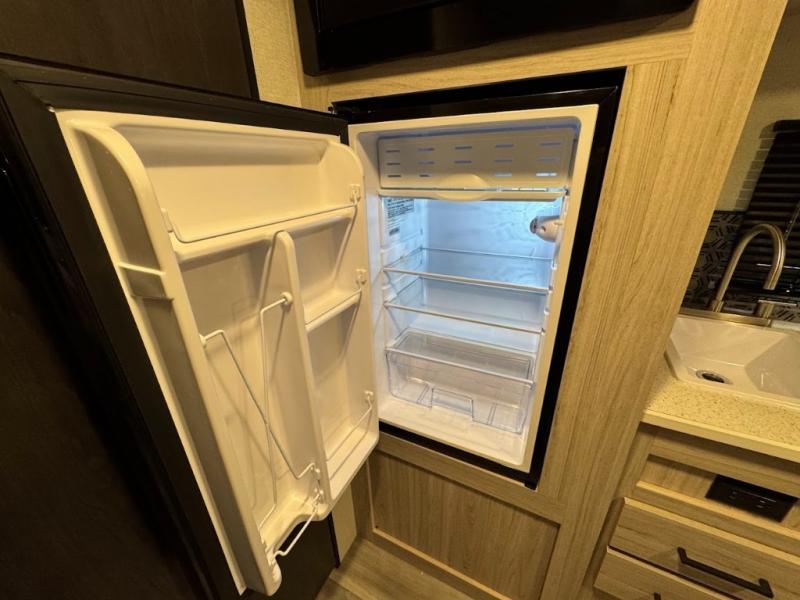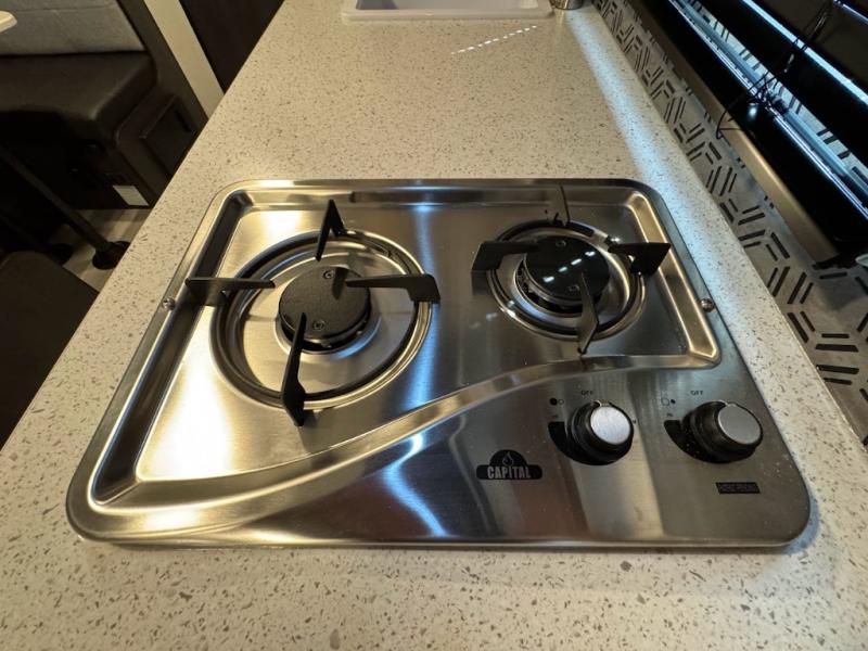 This is the perfect couple's trailer with space for an overnight guest or two little ones on the booth dinette. Each morning you can make breakfast on the two burner cooktop and store food in the refrigerator. There is a rear bath with a shower, toilet, and wardrobe to keep your clothes wrinkle-free. When you're ready to get some shut-eye, the front queen bed will provide a great night's rest!