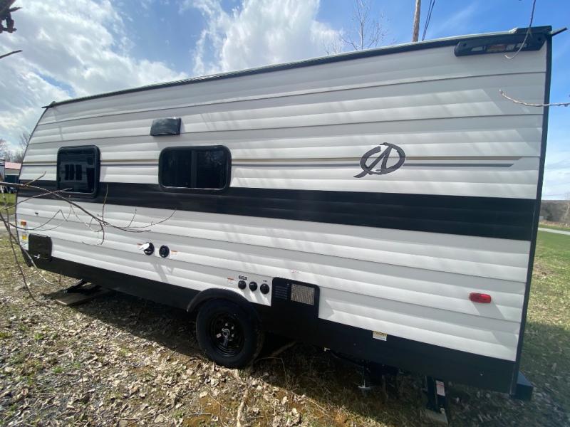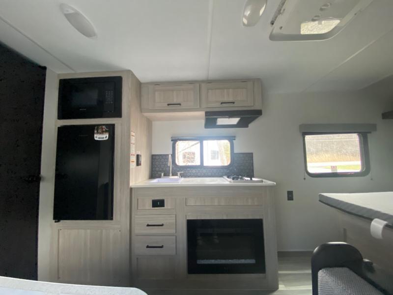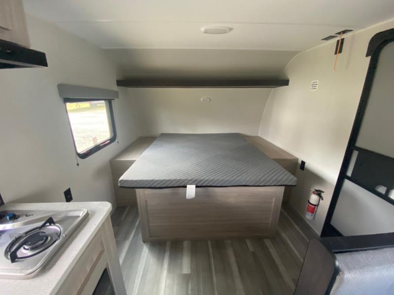 This is the perfect couple's trailer with space for an overnight guest or two little ones on the booth dinette. Each morning you can make breakfast on the two burner cooktop and store food in the refrigerator. There is a rear bath with a shower, toilet, and wardrobe to keep your clothes wrinkle-free. When you're ready to get some shut-eye, the front queen bed will provide a great night's rest!