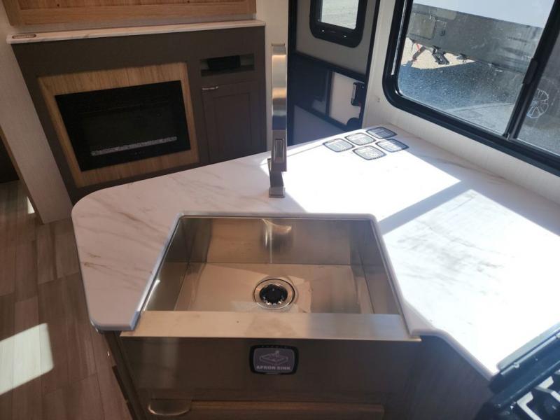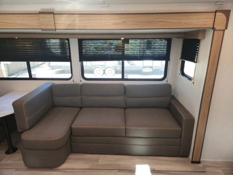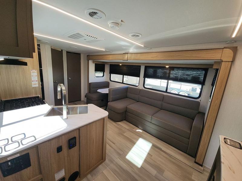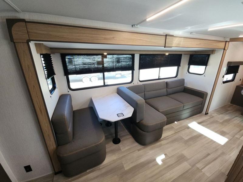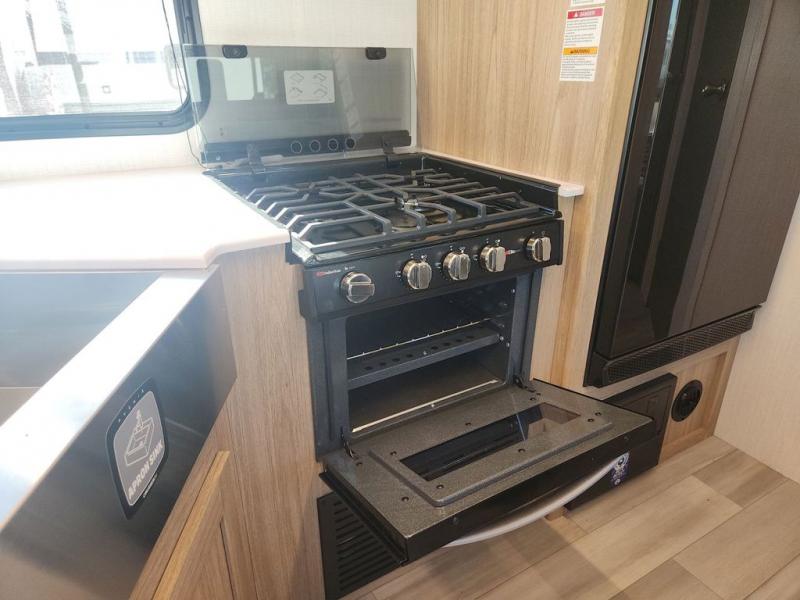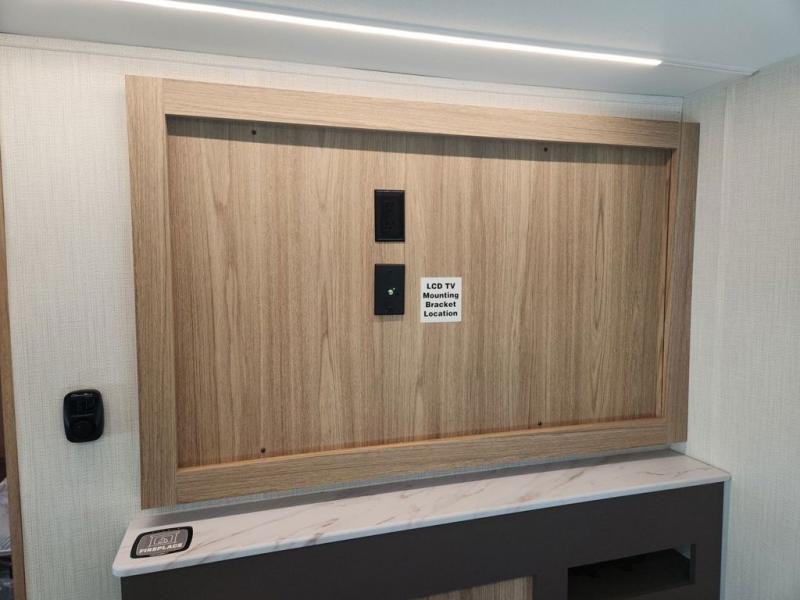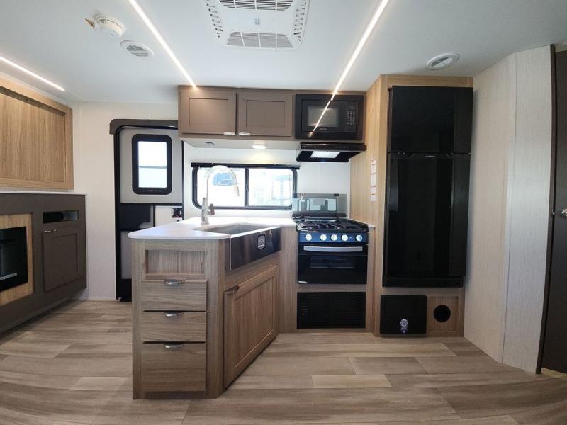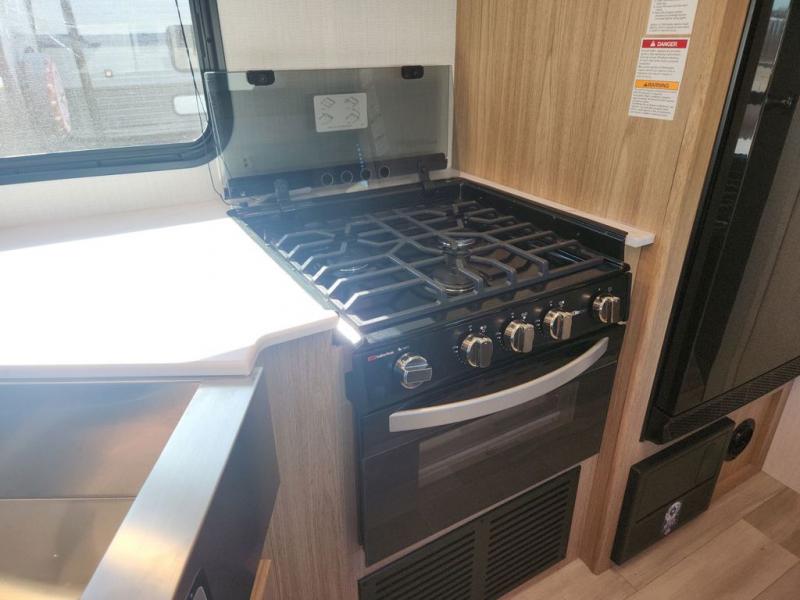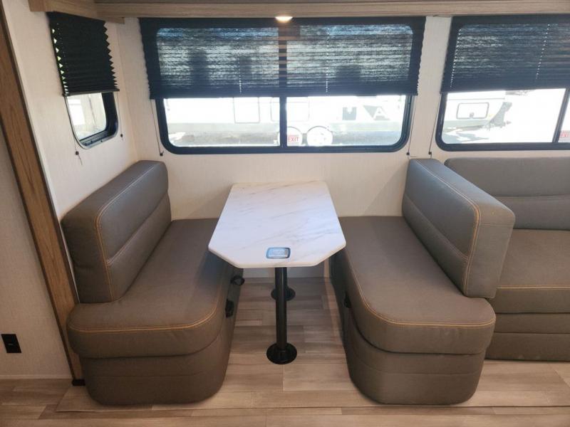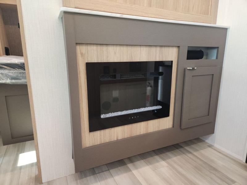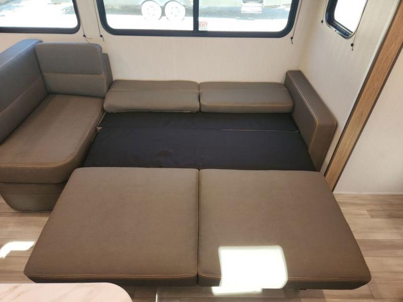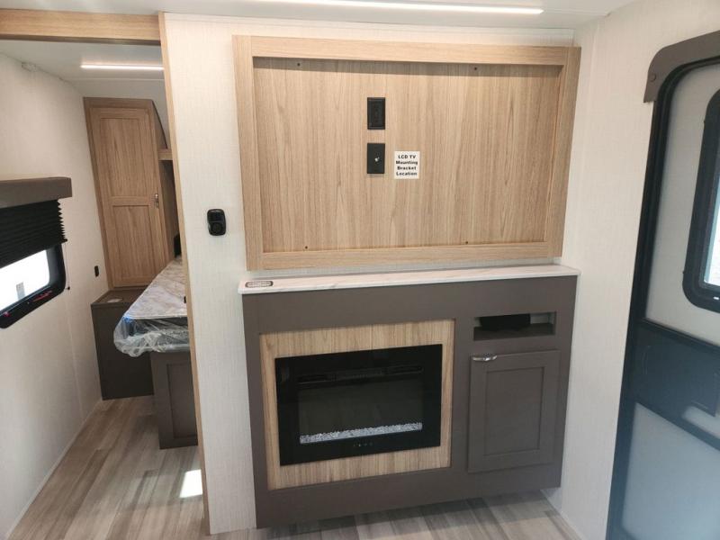 Sleeping for five or six depending on size makes this a great family trailer! A large slide in the combined kitchen and living room allows plenty of space for everyone to easily move around. Enjoy relaxing on the Lux Lounge which can also double as sleeping space for family or friends. There is also a 42" x 76" booth dinette for meals and games which can also be transformed into sleeping if needed. Both seating spaces can easily view the fireplace while relaxing inside. The queen bed in the front private bedroom will provide a great night's rest after adventuring all day, and in the morning you can create a hearty breakfast using the three burner cooktop. A spacious rear corner bath provides a radius shower, toilet, and sink so everyone can feel their best. On the outside, a full pass-through compartment features ample storage for camp chairs, an outdoor rug for under the 18' awning, and so much more!