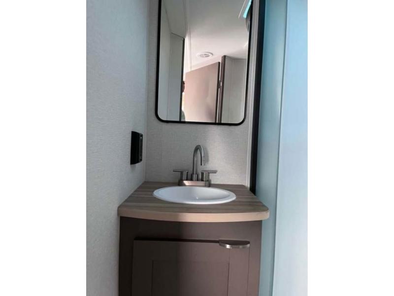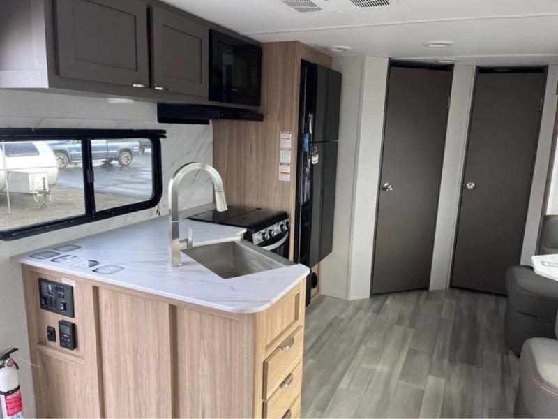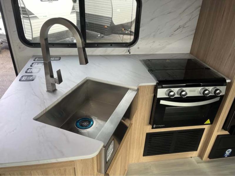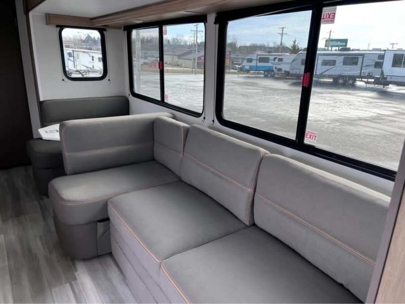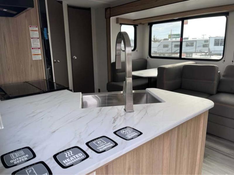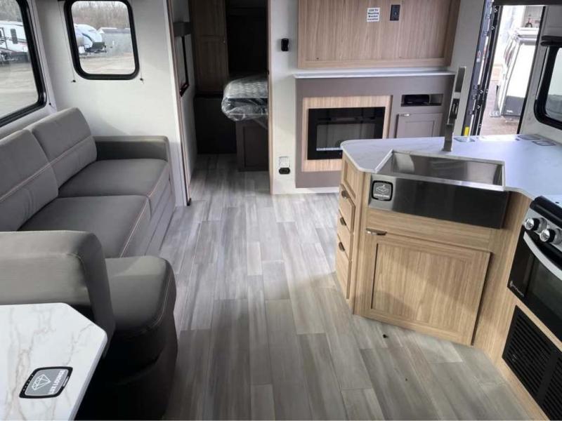 Sleeping for five or six depending on size makes this a great family trailer! A large slide in the combined kitchen and living room allows plenty of space for everyone to easily move around. Enjoy relaxing on the Lux Lounge which can also double as sleeping space for family or friends. There is also a 42" x 76" booth dinette for meals and games which can also be transformed into sleeping if needed. Both seating spaces can easily view the fireplace while relaxing inside. The queen bed in the front private bedroom will provide a great night's rest after adventuring all day, and in the morning you can create a hearty breakfast using the three burner cooktop. A spacious rear corner bath provides a radius shower, toilet, and sink so everyone can feel their best. On the outside, a full pass-through compartment features ample storage for camp chairs, an outdoor rug for under the 18' awning, and so much more!