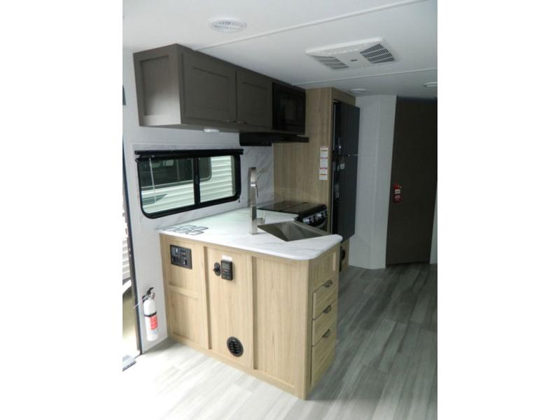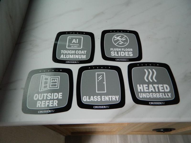 With any Avenir travel trailer by Cruiser RV, you will enjoy affordable luxury at every turn! The smooth corrugated metal exterior and industry leading 3X's full-height cross-members provide a durable foundation, and the Cruiser climate defense heated/enclosed underbelly helps extend your camping season. There is batten strip lighting with a dimmer, max storage in the deluxe curated kitchen, and thoughtfully located USB ports and 110V charging outlets to keep your electronics charged. A central control panel lets you easily access your units functions, and the Wi-Fi prep will give you the option to stay connected while you camp. Each model also features a tinted exterior glass door, an on-demand tankless water heater, solid flip-down steps with a telescoping handrail, and a roof mounted 50W solar panel with a 10A charge controller for added convenience.