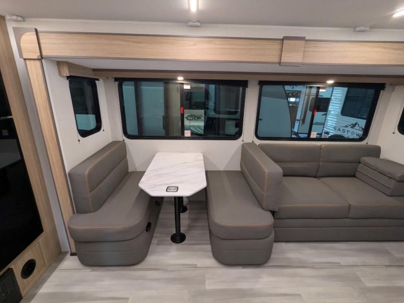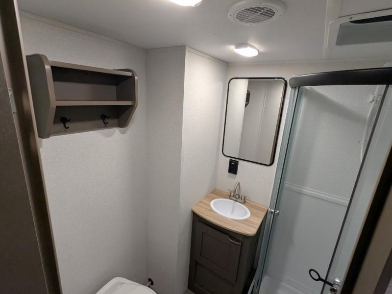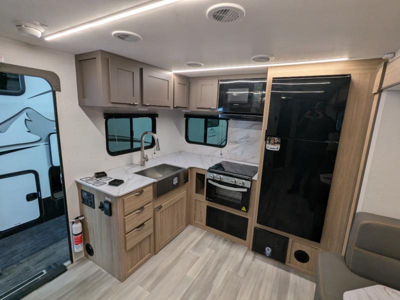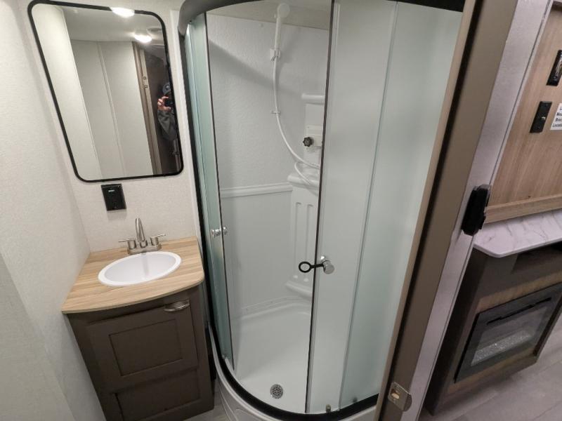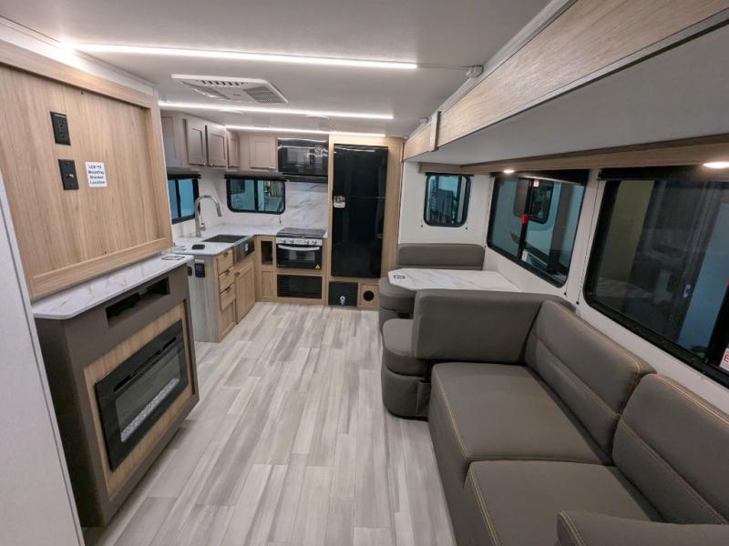 Start a new journey in this cozy travel trailer for five to six. The rear kitchen includes ample counter space to prep meals, a three burner cooktop, plus an entryway walk-in pantry where you can keep dry goods, snacks, and jackets. There is a Lux Lounge and a booth dinette for seating and sleeping space, and the fireplace is sure to make your space feel a little more like home. The spacious full bath is close by the bedroom for convenience, and there is a bedroom closet so you're not living out of a suitcase all weekend!