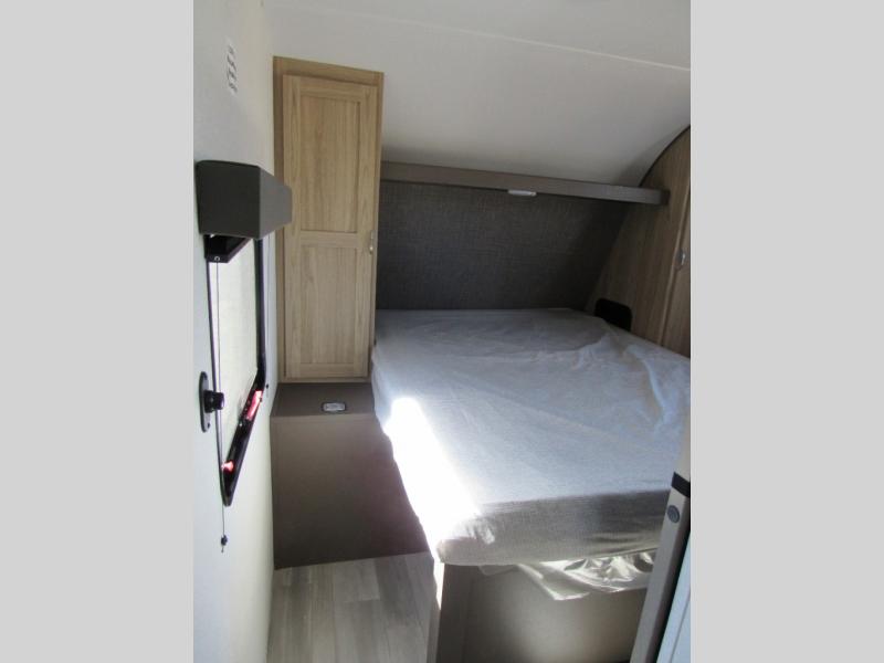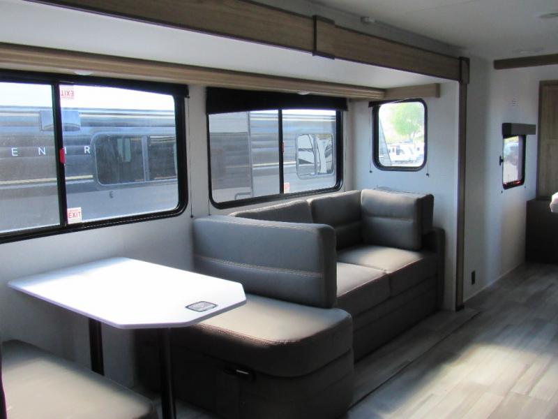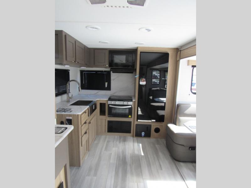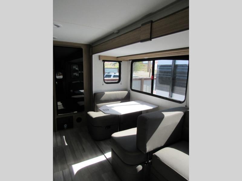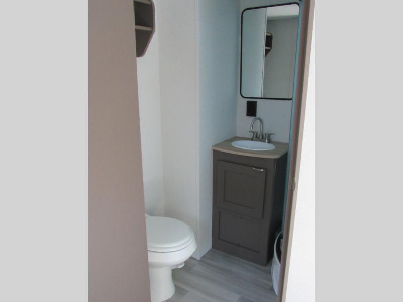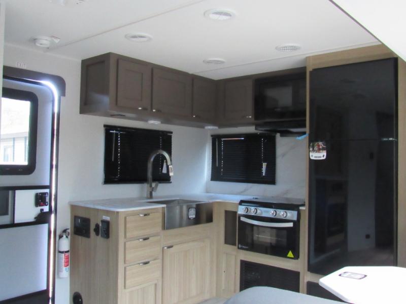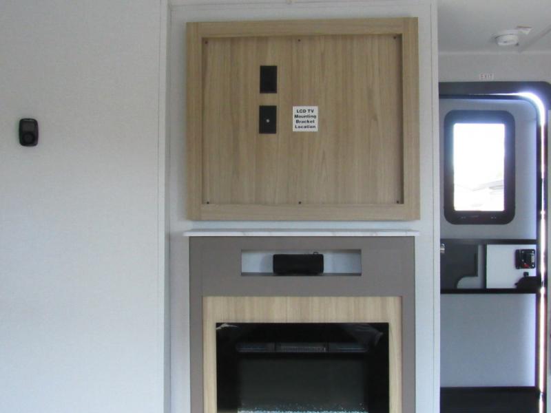 Start a new journey in this cozy travel trailer for five to six. The rear kitchen includes ample counter space to prep meals, a three burner cooktop, plus an entryway walk-in pantry where you can keep dry goods, snacks, and jackets. There is a Lux Lounge and a booth dinette for seating and sleeping space, and the fireplace is sure to make your space feel a little more like home. The spacious full bath is close by the bedroom for convenience, and there is a bedroom closet so you're not living out of a suitcase all weekend!