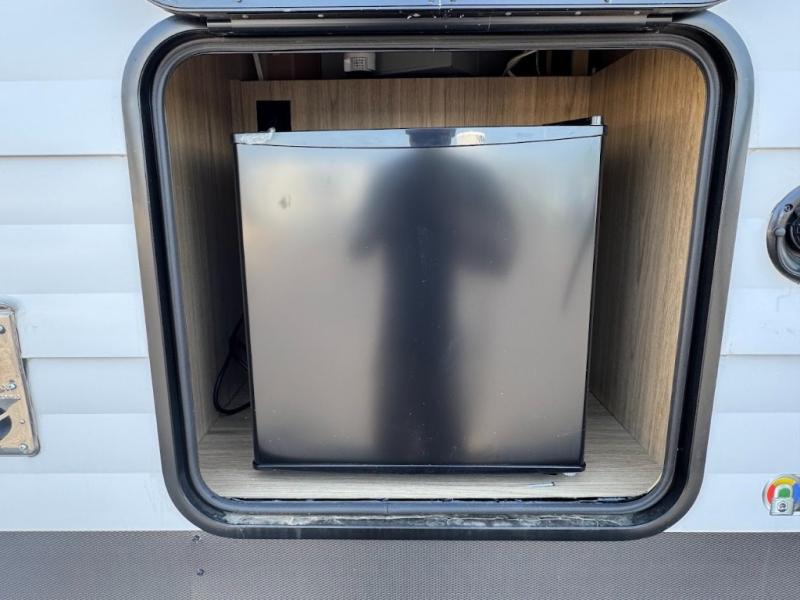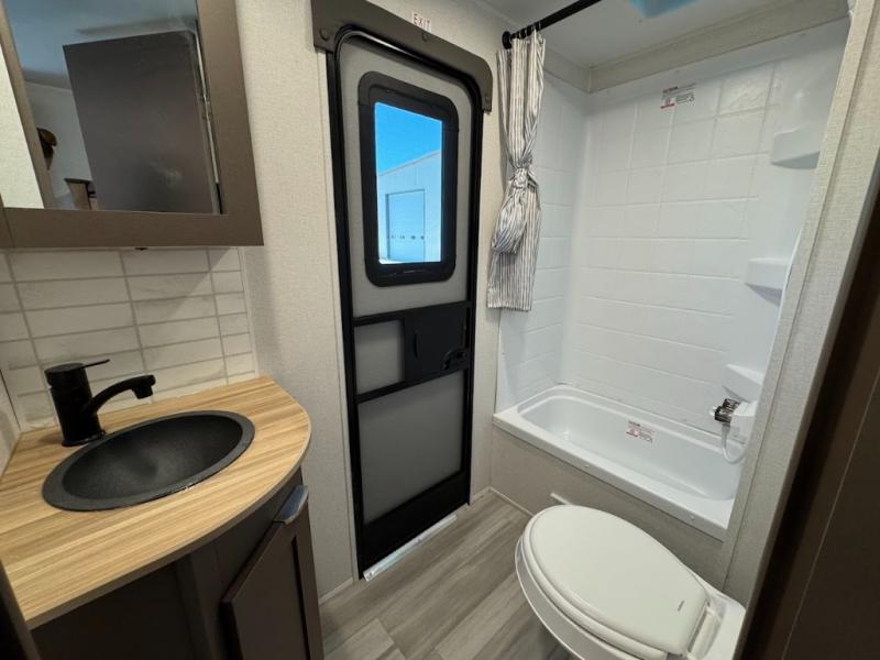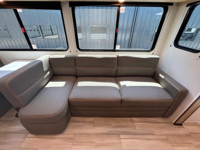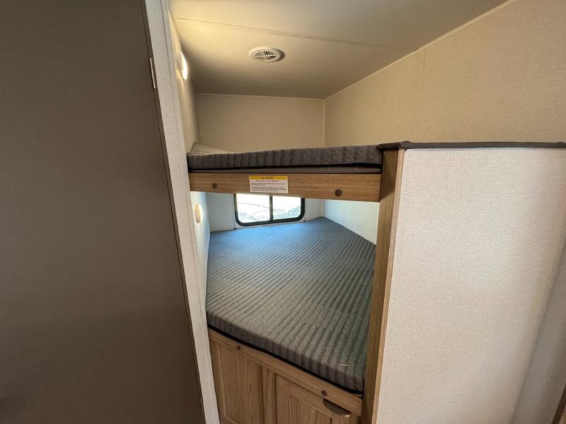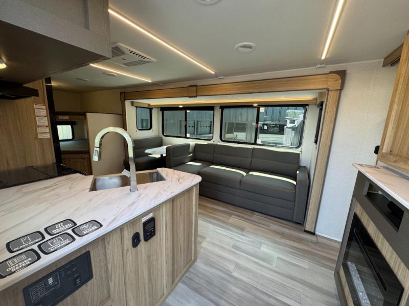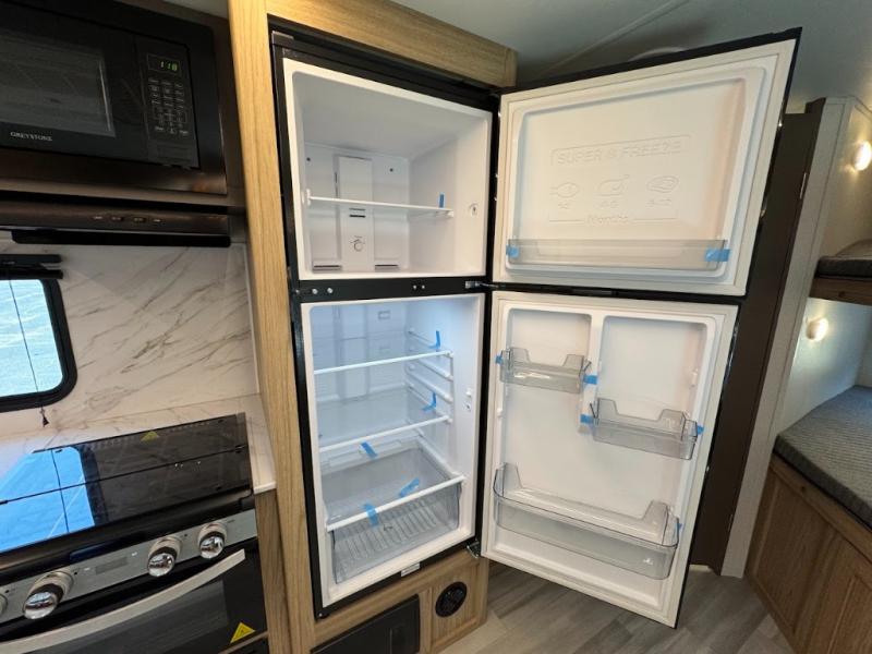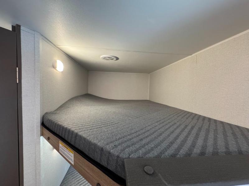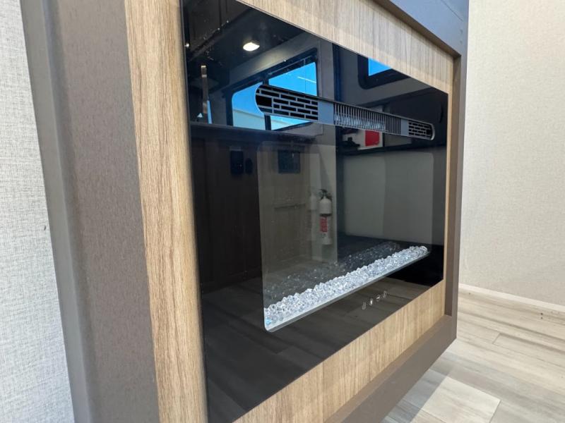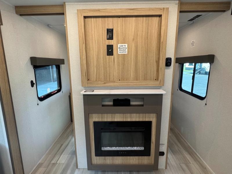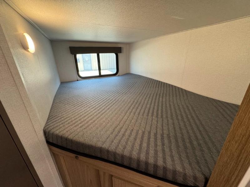 Dual entry doors, sleeping space for nine, and a spacious interior make this model perfect for camping with a larger group! Your crew can relax by the fireplace in the evening on the Lux Lounge, which will convert to sleeping space. There is also a booth dinette that will provide a place to dine each day, as well as a place for more guests to sleep if needed. You can be sure the double-size bunks will be claimed by the littles ones, and the queen bed in the front private bedroom will provide a great night's rest after adventuring in the woods. Whip up your best meals on the three burner cooktop, freshen up in the full bath with its own exterior entry door, grab a cold drink from the exterior refrigerator, and do so much more in this spacious trailer!