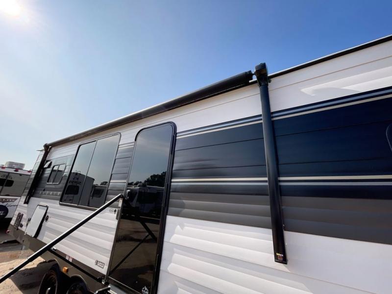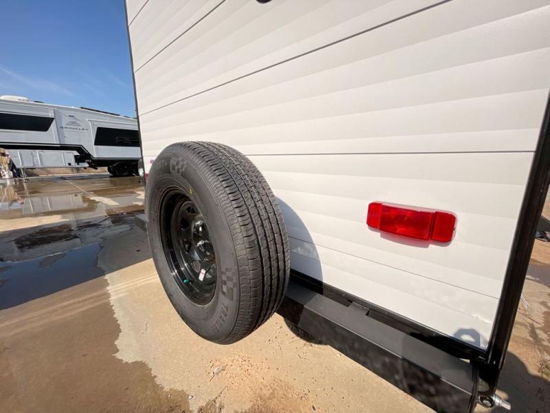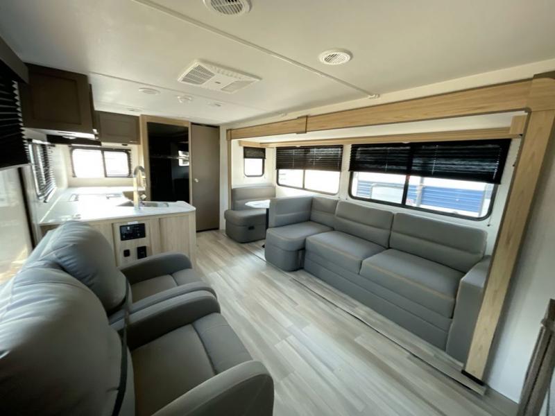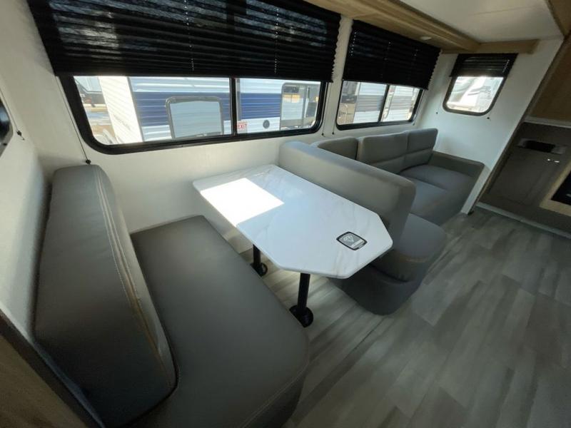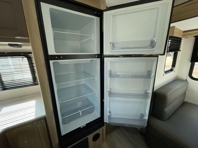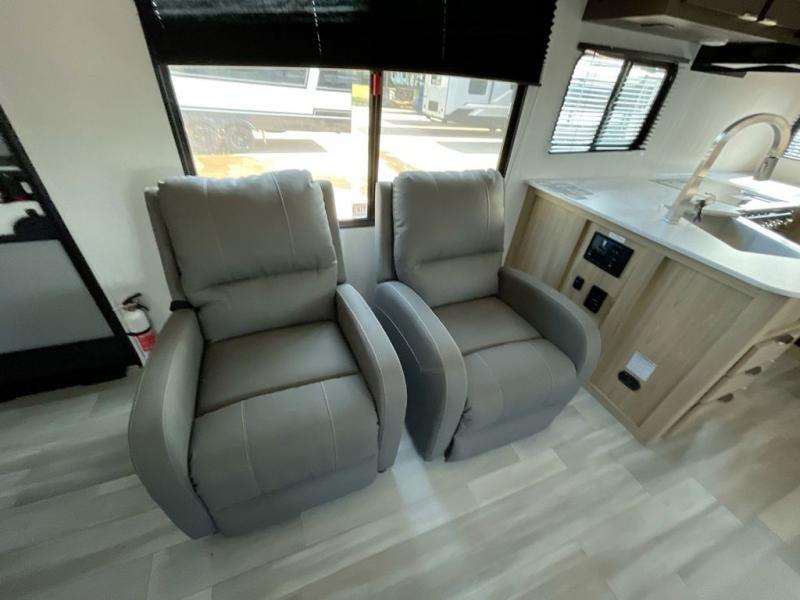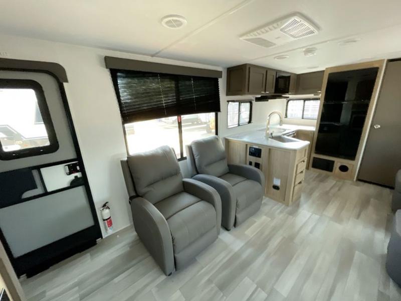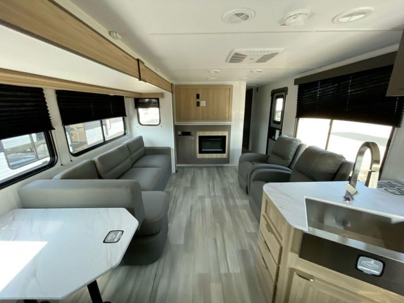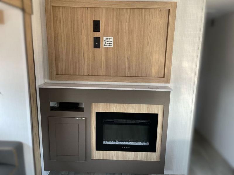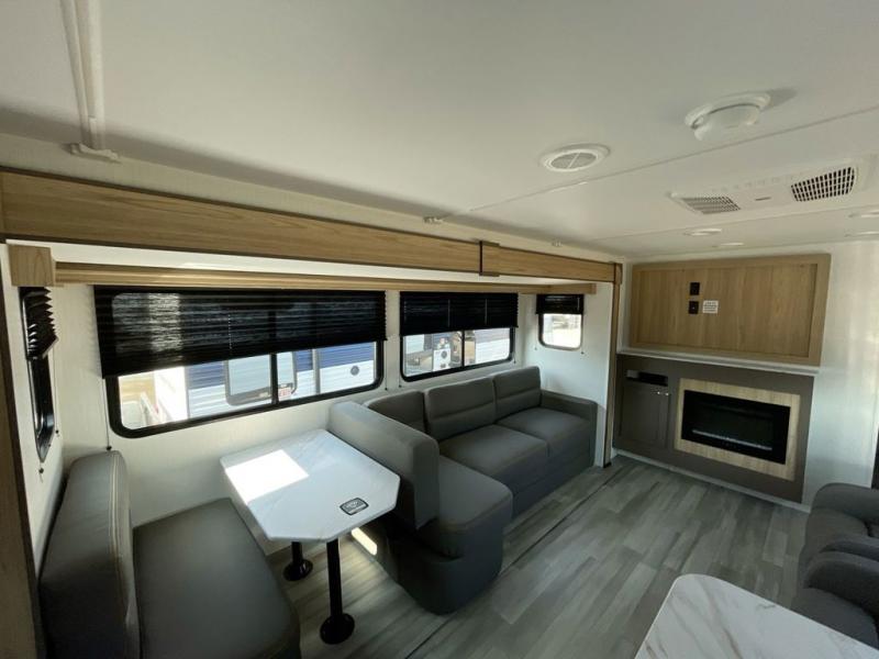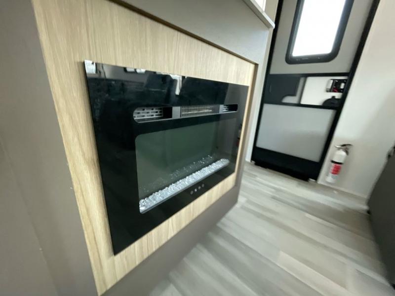 Start a new journey in this cozy travel trailer for five to six. The rear kitchen includes ample counter space to prep meals, a three burner cooktop, plus a spacious pantry where you can keep dry goods and snacks. There are two lounge chairs to relax on, along with a Lux Lounge, and a booth dinette. The fireplace is sure to make your space feel a little more like home, as well as the front private bedroom with a queen bed. The spacious full bath is close by the bedroom for convenience, and there is a bedroom wardrobe so you're not living out of a suitcase all weekend! You can unload your camping chairs from the full pass-through storage, grab a cold drink from the exterior refrigerator, and relax under the 18' patio awning!