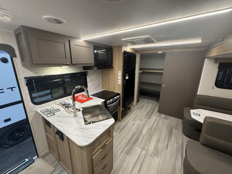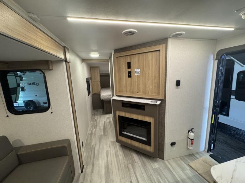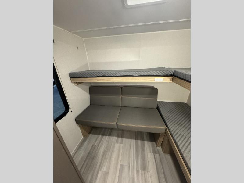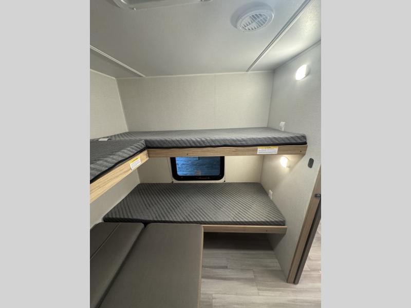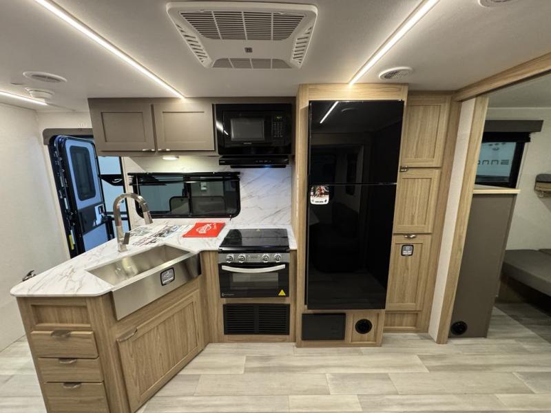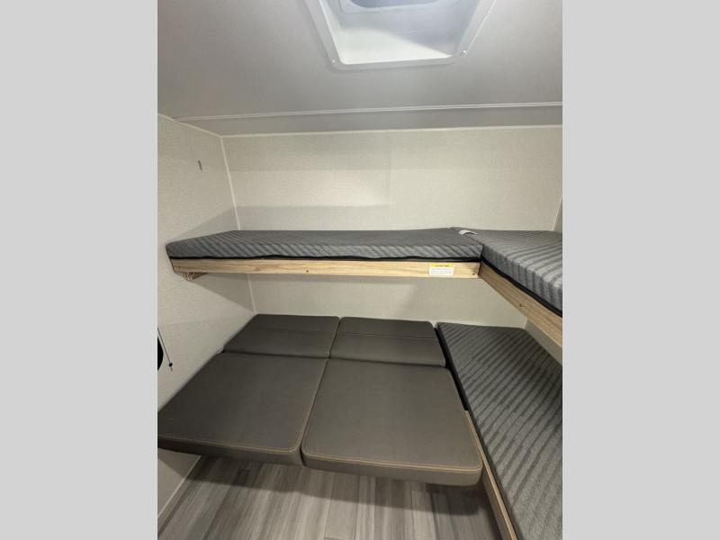 This spacious Avenir offers sleeping space for a large group with a private bunkhouse in back featuring a bunk over a jackknife sofa and a second set of bunks sleeping five total in this space. There is also a dresser for storage opposite the sofa with TV prep above it. In the main combined kitchen and living room you will enjoy added space thanks to a large slide out 42" x 76" booth dinette and Lux Lounge which can both be converted to extra sleeping space if needed. An angled interior wall from the bathroom is where you will view the fireplace. Opposite the slide is your kitchen area where you can easily create meals and snacks just like home. You will find a large pantry, refrigerator, three burner cooktop and large sink for cleaning up. There is also a microwave oven and overhead storage for all of your dishes. An outside refrigerator under the 18' awning allows you to keep drinks and cold snacks readily available when spending time outside. A full bath with radius shower will keep everyone feeling clean and fresh, and the private front bedroom offers a queen bed, dual nightstands and storage with a full pass-through on the outside beneath the head of the bed for all of your outdoor gear.