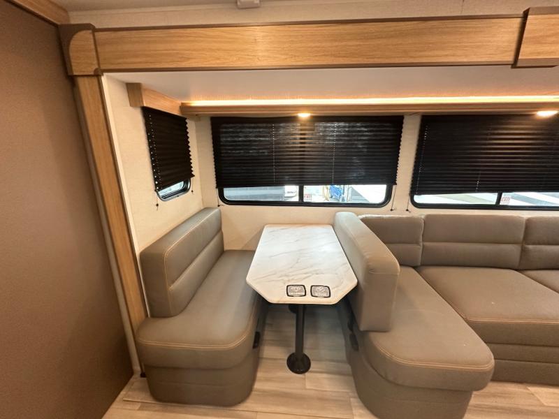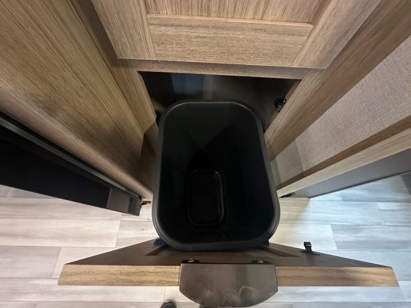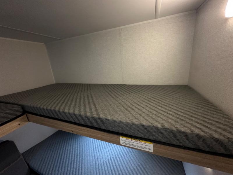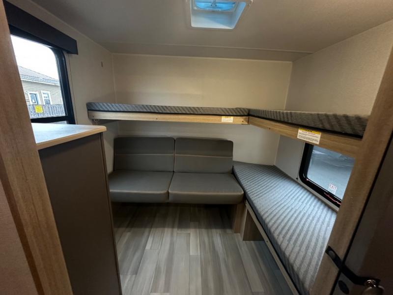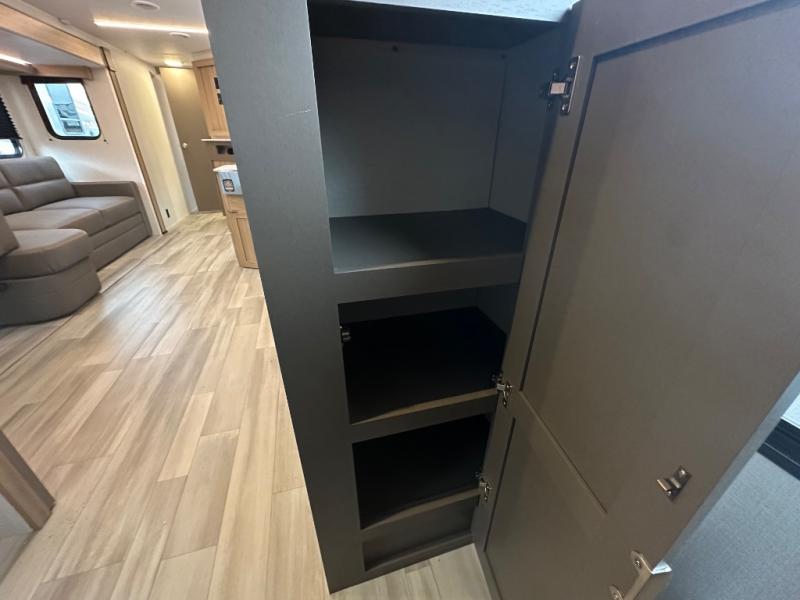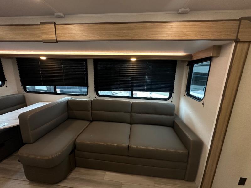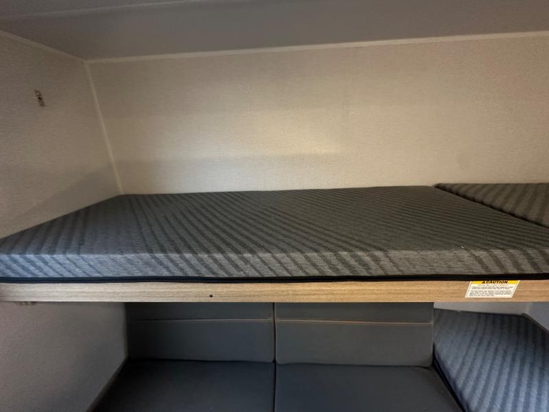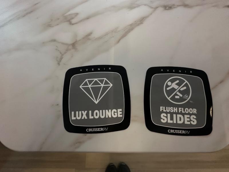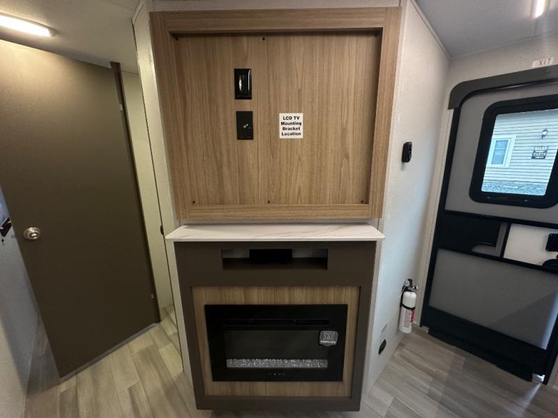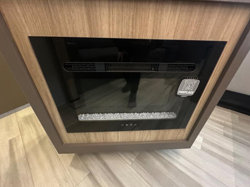 This spacious Avenir offers sleeping space for a large group with a private bunkhouse in back featuring a bunk over a jackknife sofa and a second set of bunks sleeping five total in this space. There is also a dresser for storage opposite the sofa with TV prep above it. In the main combined kitchen and living room you will enjoy added space thanks to a large slide out 42" x 76" booth dinette and Lux Lounge which can both be converted to extra sleeping space if needed. An angled interior wall from the bathroom is where you will view the fireplace. Opposite the slide is your kitchen area where you can easily create meals and snacks just like home. You will find a large pantry, refrigerator, three burner cooktop and large sink for cleaning up. There is also a microwave oven and overhead storage for all of your dishes. An outside refrigerator under the 18' awning allows you to keep drinks and cold snacks readily available when spending time outside. A full bath with radius shower will keep everyone feeling clean and fresh, and the private front bedroom offers a queen bed, dual nightstands and storage with a full pass-through on the outside beneath the head of the bed for all of your outdoor gear.