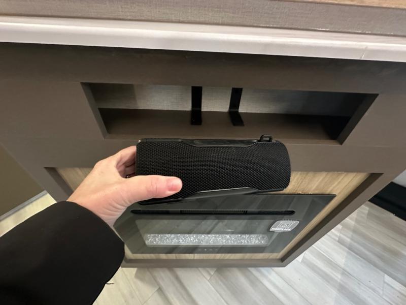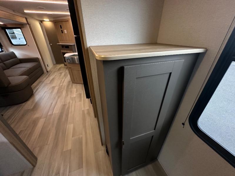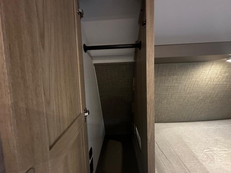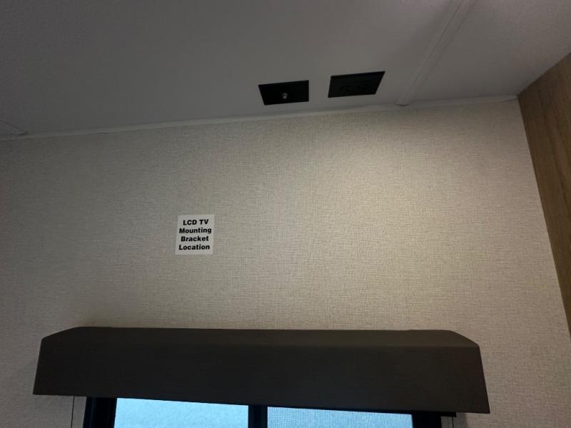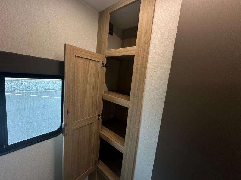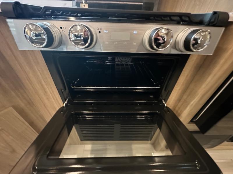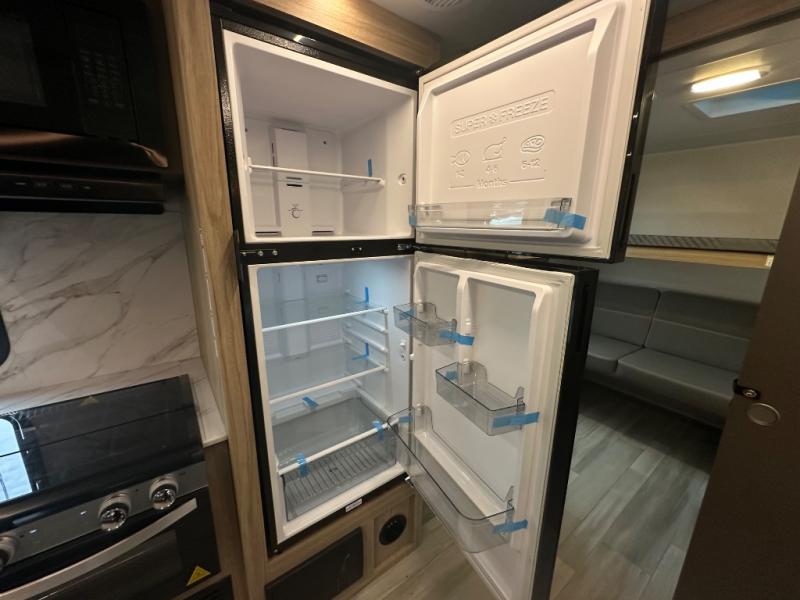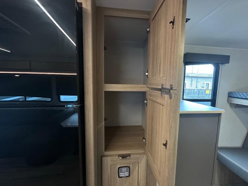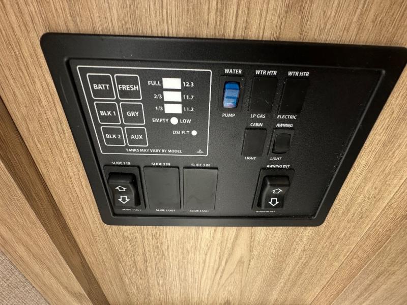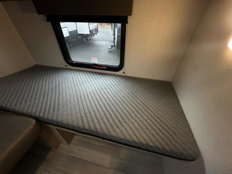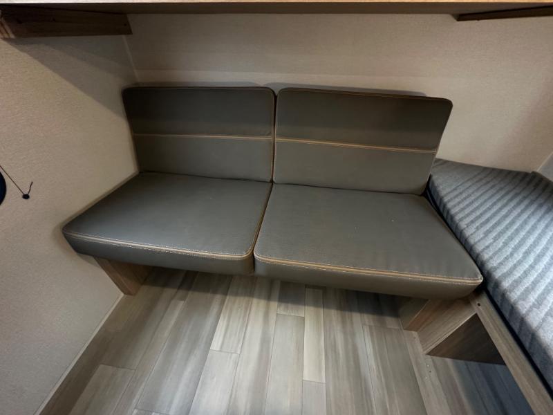This spacious Avenir offers sleeping space for a large group with a private bunkhouse in back featuring a bunk over a jackknife sofa and a second set of bunks sleeping five total in this space. There is also a dresser for storage opposite the sofa with TV prep above it. In the main combined kitchen and living room you will enjoy added space thanks to a large slide out 42" x 76" booth dinette and Lux Lounge which can both be converted to extra sleeping space if needed. An angled interior wall from the bathroom is where you will view the fireplace. Opposite the slide is your kitchen area where you can easily create meals and snacks just like home. You will find a large pantry, refrigerator, three burner cooktop and large sink for cleaning up. There is also a microwave oven and overhead storage for all of your dishes. An outside refrigerator under the 18' awning allows you to keep drinks and cold snacks readily available when spending time outside. A full bath with radius shower will keep everyone feeling clean and fresh, and the private front bedroom offers a queen bed, dual nightstands and storage with a full pass-through on the outside beneath the head of the bed for all of your outdoor gear.