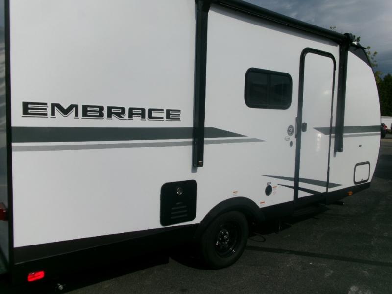 Experience a peace of mind with each one of these Cruiser Embrace travel trailers! The diamond plate stone guard and tough coat heavy duty smooth corrugated exterior metal will help protect against rock and debris on the way to the campground. There are stabilizer jacks for easy set up, and the power awning with an LED light and arm adjustment is sure to come in handy when camping. You'll find many comforts inside, along with an LED light, a two burner range, and an electric water heater so you can enjoy a hot shower after a day outdoors!
