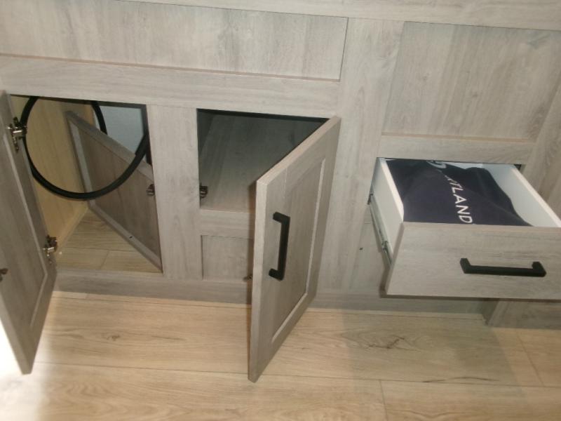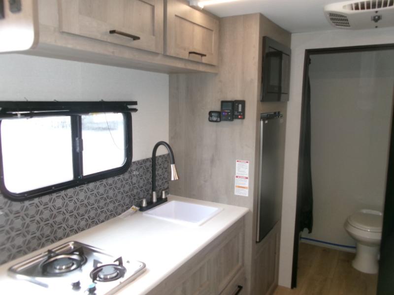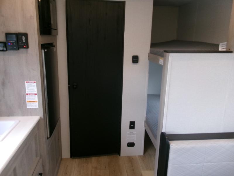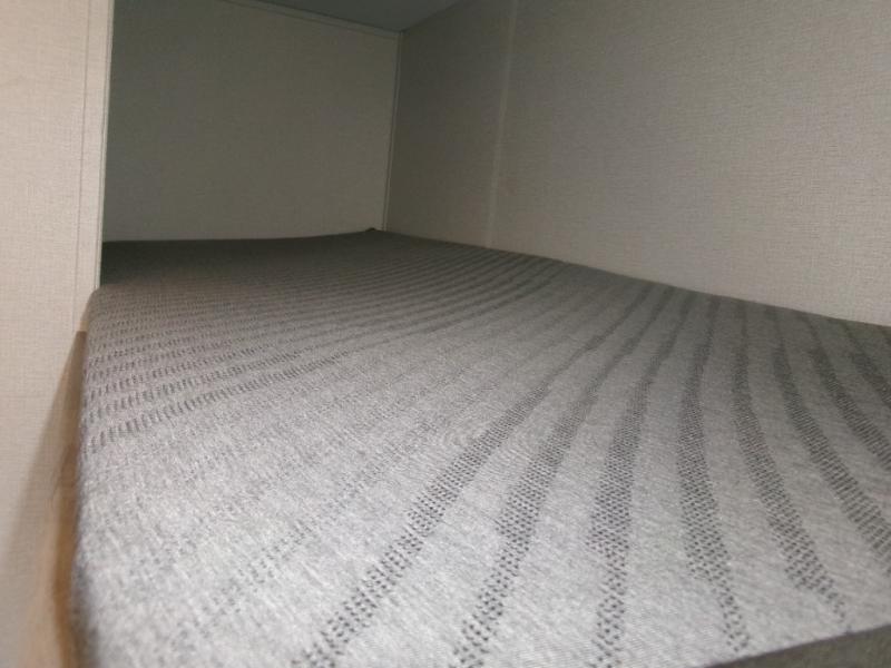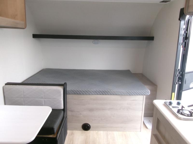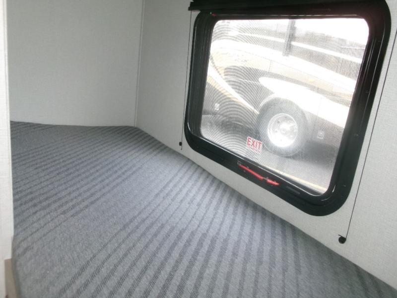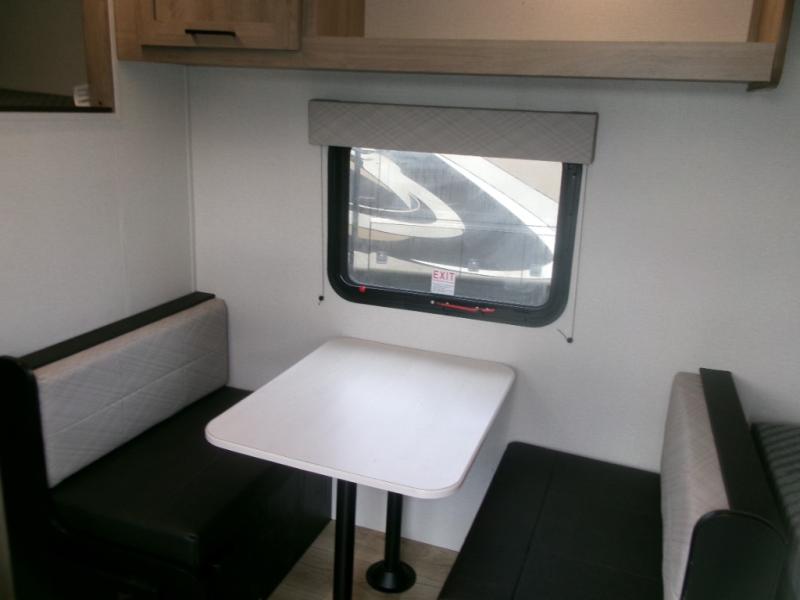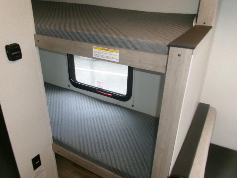 This single axle unit may be compact, but you can confidently sleep five each night thanks to the rear corner bunk beds! Up front you'll find a queen bed with a shelf above for your things, and there is even a booth dinette which which double as dining and sleeping space. A two burner cooktop and double door refrigerator will let you cook and store food each day, and the 8' power awning provides shade if you want to eat outside. There is also a private shower and toilet so you don't have to use the camp's facilities at night!