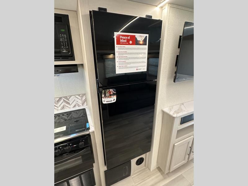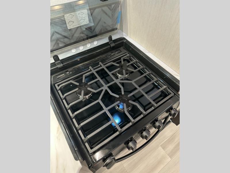 Kitchen: 3-burner cooktop, 10.7 cu ft residential-style 12V refrigerator.