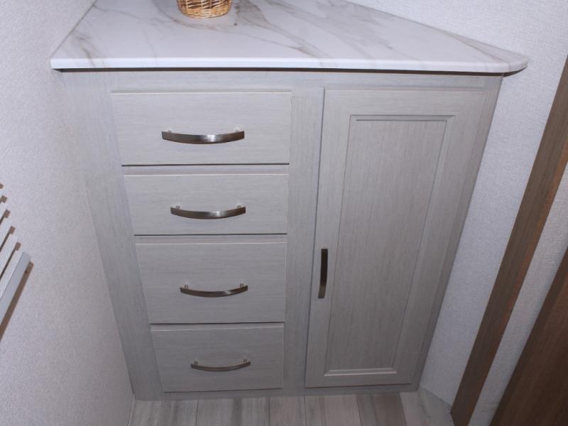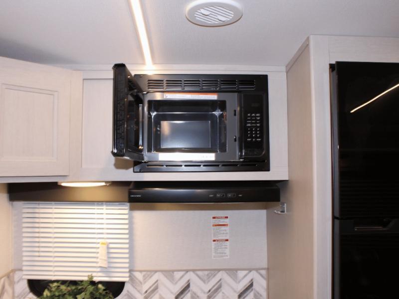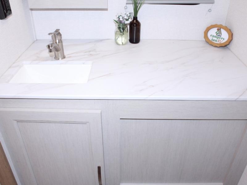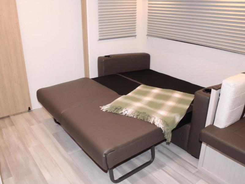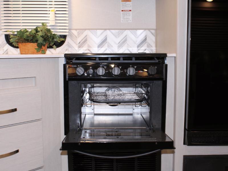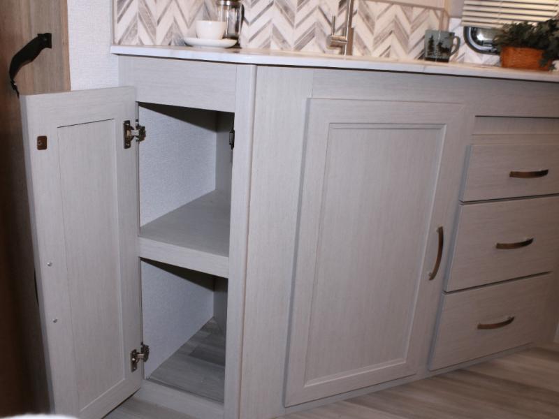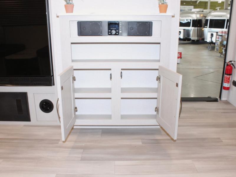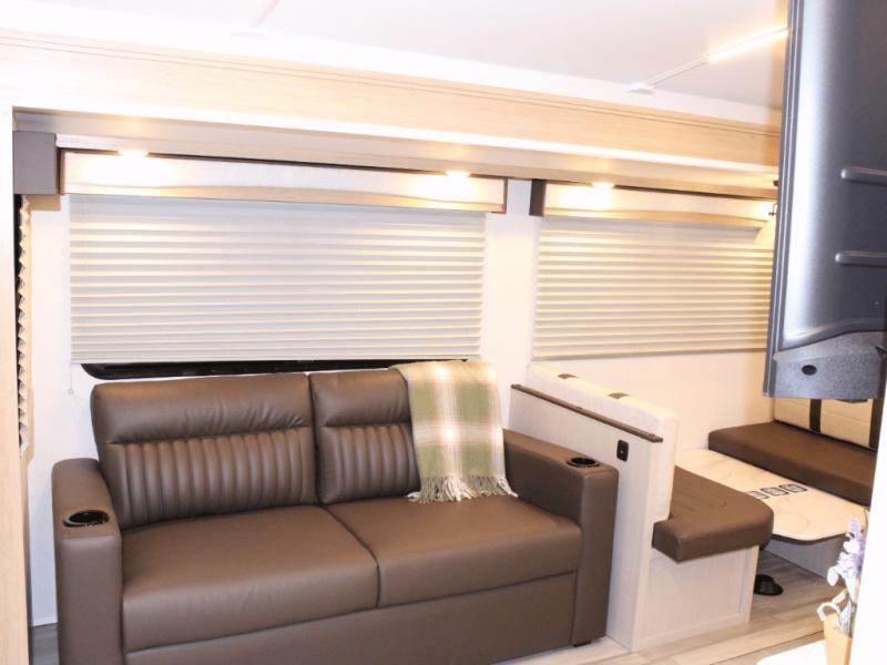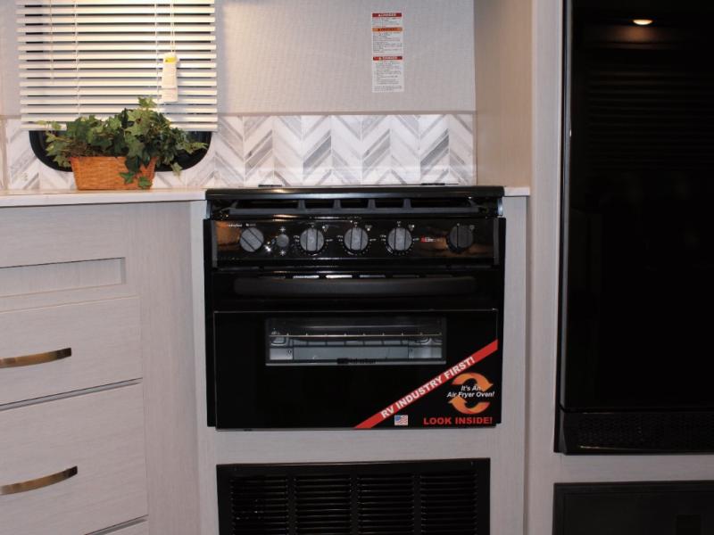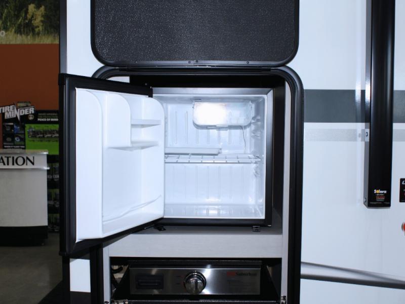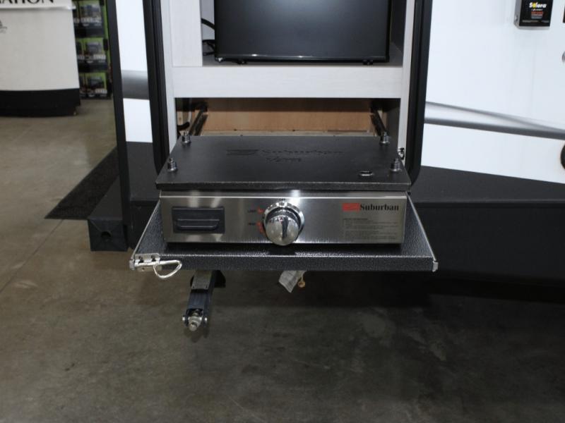 Calling all chefs! The well-appointed kitchen includes a three-burner cooktop and a walk-in pantry stocked with ample space for your dry goods and snacks. Take your outdoor cooking to the next level with the outdoor kitchen featuring a griddle, perfect for breakfast or dinner al fresco. Inside, gather your crew around the comfortable booth dinette for meals and conversation, or enjoy the fresh air beneath the 20-foot power awning with LED lighting, ideal for evening relaxation or entertaining guests.