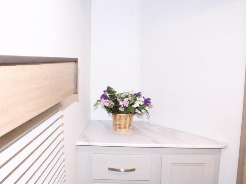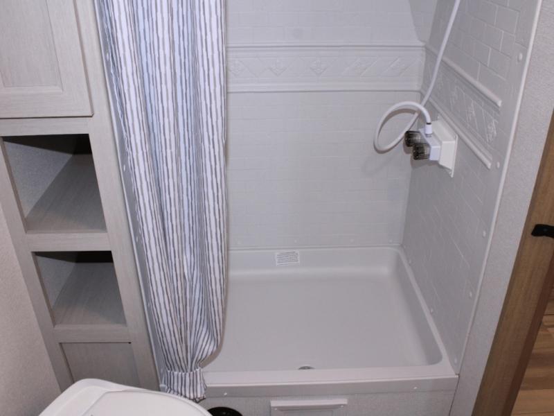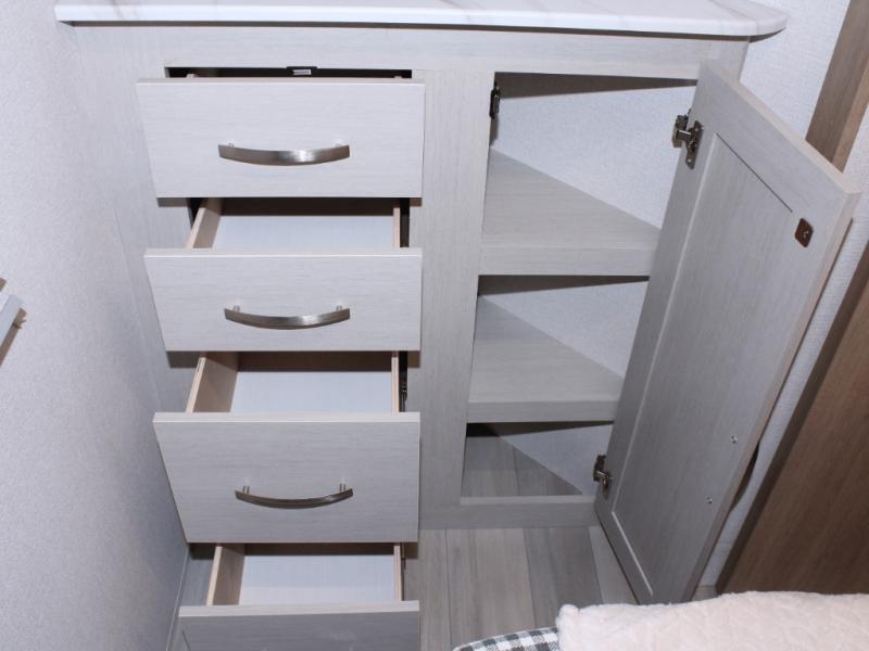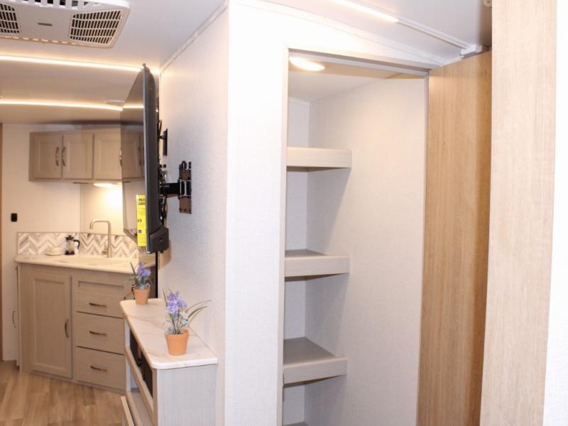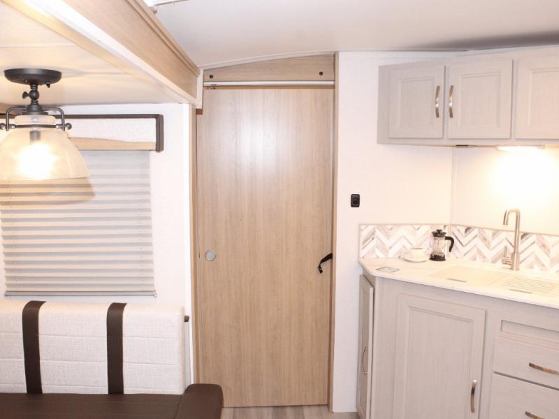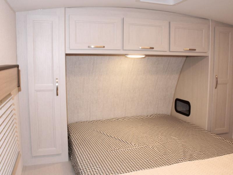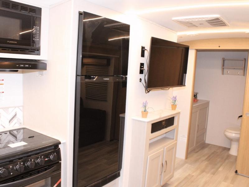 At the front of the trailer, you’ll find a cozy private bedroom with a queen bed and dual wardrobes providing plenty of storage for all your clothes and essentials, so you can travel light but live large.