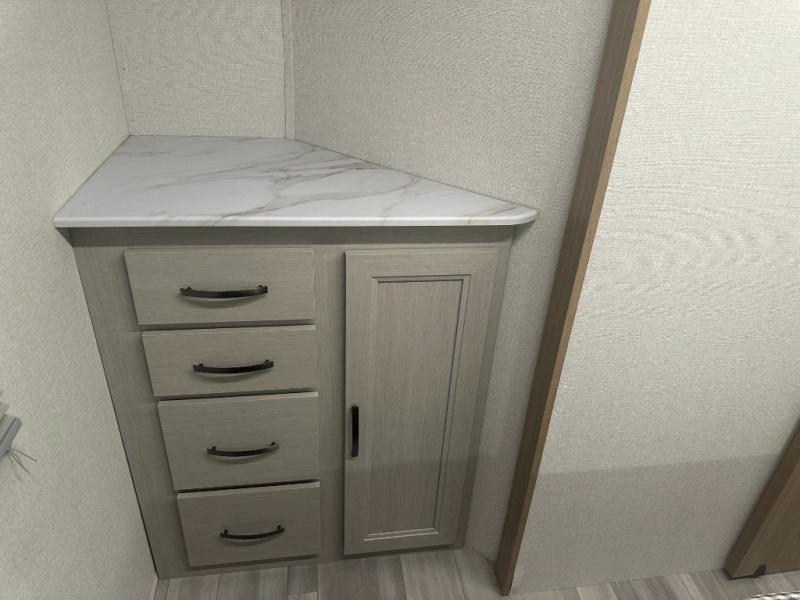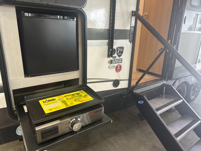 Plan out your summer vacations in this spacious travel trailer for five to six people. The large slide out will allow everyone enough space indoors including the dog who will find plenty of space to nap after a long hike. There is also a full rear bath to get cleaned up in. The chef will have everything they need to prepare a delicious lunch on the three burner cooktop, plus there is a walk-in pantry for dry goods and snacks. You can even entertain outdoors easily with the outdoor kitchen including a griddle. Your crew can dine at the booth dinette, or enjoy some fresh air under the 20' power awning with LED lights. You will feel right at home with a private bedroom up front that includes a queen bed and dual wardrobes for all your clothes!