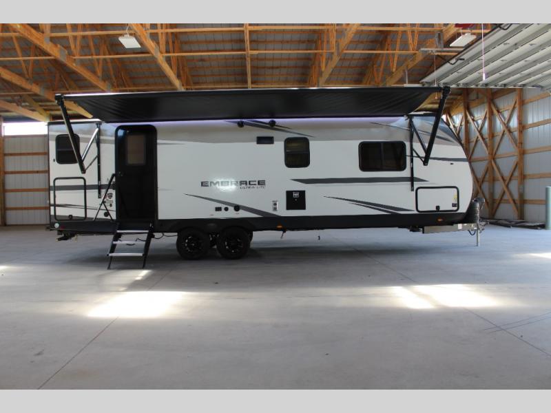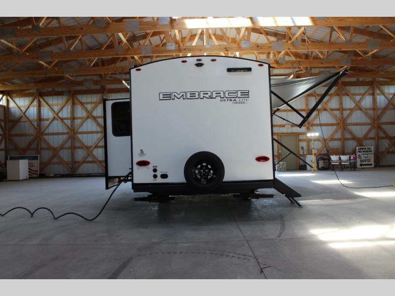 Experience a peace of mind with each one of these Cruiser Embrace travel trailers! Durable construction consists of a painted front cap with LED lights, a one-piece vinyl TPO membrane roof, plus a heated and enclosed underbelly to help extend your camping season. There are also 15" rims and tires on heavy-duty axles, 5/8" tongue and groove plywood flooring, a power awning with LED lights, plus more top selling features. Inside, you'll enjoy seamless countertops, concealed cabinet door hinges, an LED lighting package, and many more comforts.