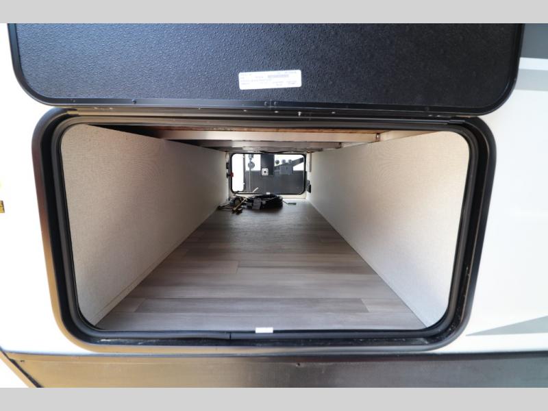 The Embrace EL26RB boasts a sleek design with a painted front cap illuminated by LED lights. Access is a breeze with a 30” primary entry door complemented by a triple step and light. The oversized pass-through storage ensures you have ample space for all your gear.