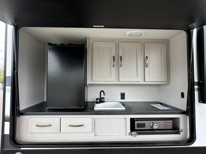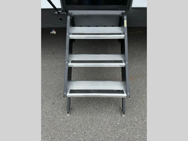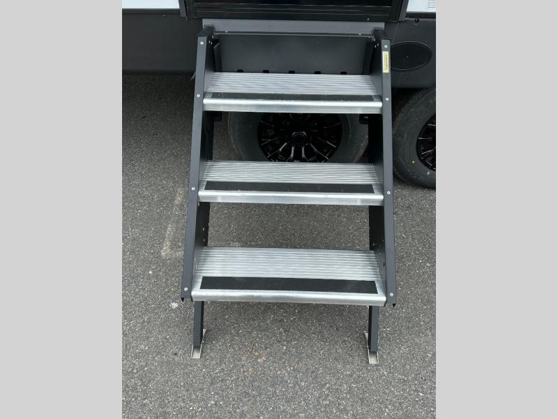 Solid Steps, Power Tongue Jack, Bluetooth Soundbar, Vaulted Interior Ceiling, Large Folding Entry Handle.