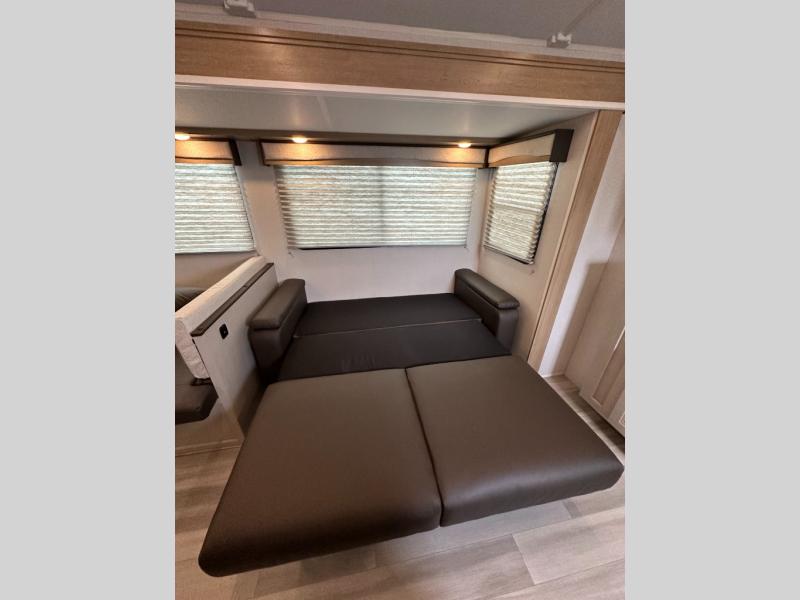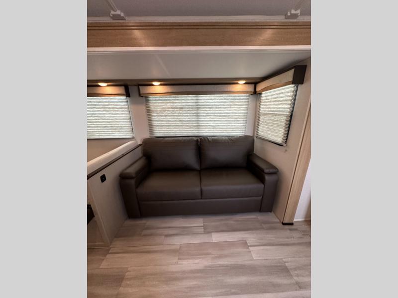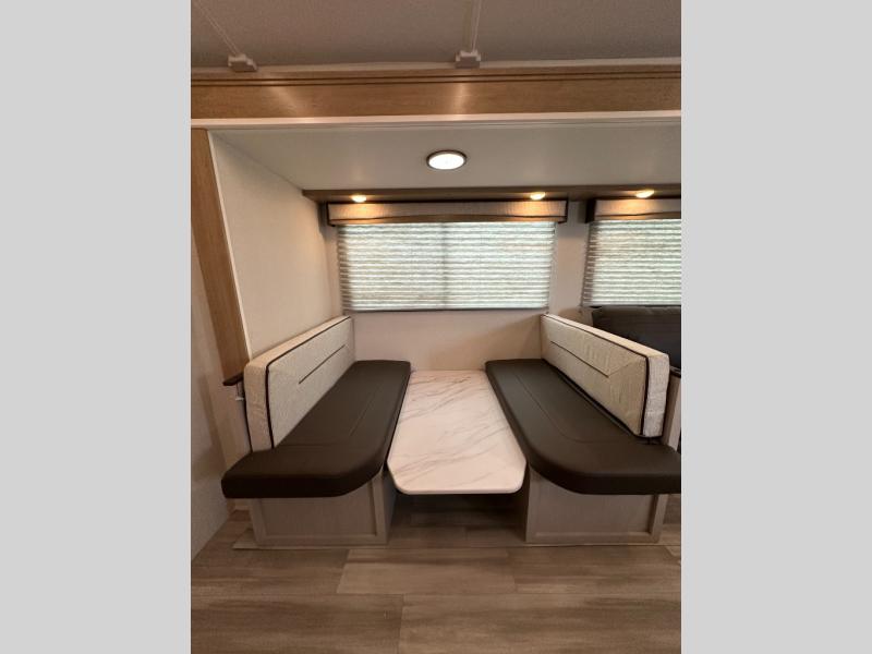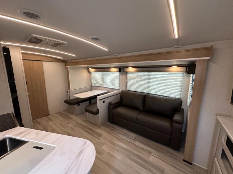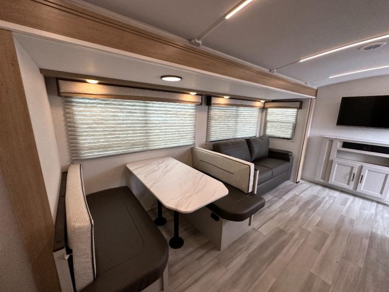 Living/Dining Area: A large slide out includes a U-shaped or booth dinette + sofa (tri-fold) setup to gather.