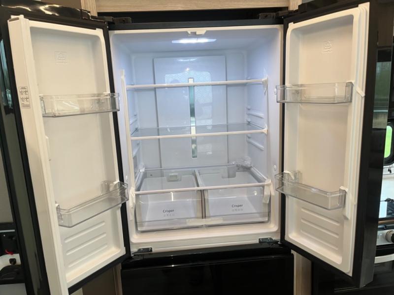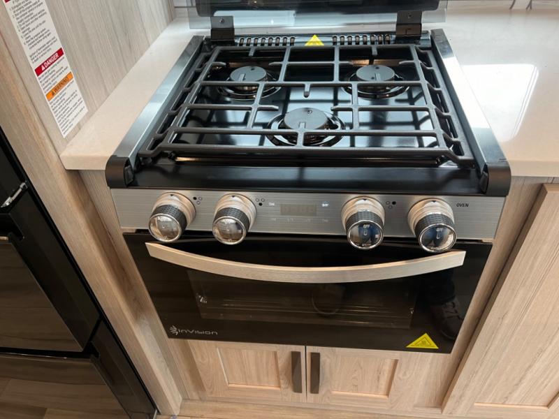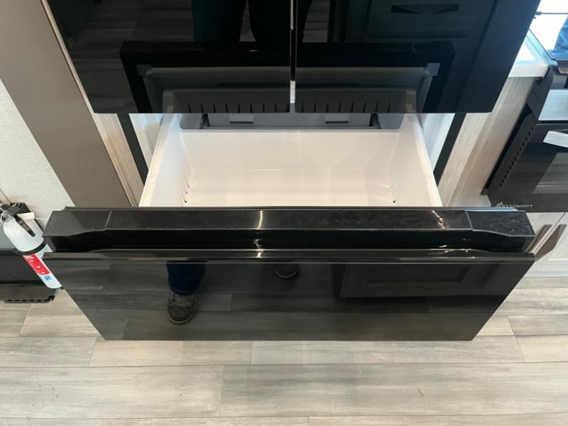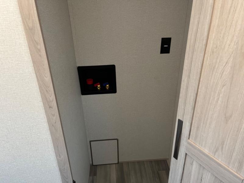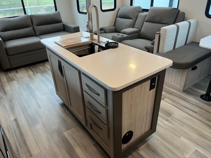 You and your friends will enjoy exploring your favorite camping spots in this spacious fifth wheel thanks to dual opposing slides in the combined kitchen and living area. Here you will find a center island with sink and plenty of counter space for food prep, a 16.2 cu. ft. refrigerator, and a three burner cooktop and microwave oven. For relaxing, there is a 76" tri-fold sofa along the rear wall and theater seating within the roadside slide that also houses the dinette. The front private bedroom features a queen bed with a pillow top mattress and under bed storage, as well as an area prepped for a washer and dryer so you could have clean clothes throughout your entire trip. Freshen up each morning in the full bathroom with an upgraded shower surround then head to the fully equipped kitchen to whip up some breakfast before heading outside. This unit features a 23' awning and an outside kitchen so you can even cook out in the fresh air if you like.
