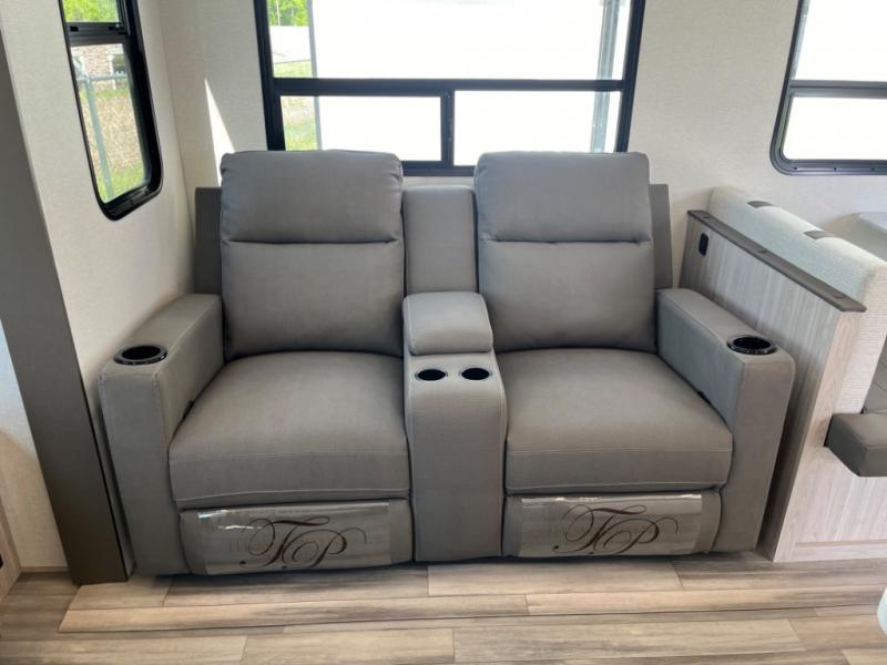 You and your friends will enjoy exploring your favorite camping spots in this spacious fifth wheel thanks to dual opposing slides in the combined kitchen and living area. Here you will find a center island with sink and plenty of counter space for food prep, a 16.2 cu. ft. refrigerator, and a three burner cooktop and microwave oven. For relaxing, there is a 76" tri-fold sofa along the rear wall and theater seating within the roadside slide that also houses the dinette. The front private bedroom features a queen bed with a pillow top mattress and under bed storage, as well as an area prepped for a washer and dryer so you could have clean clothes throughout your entire trip. Freshen up each morning in the full bathroom with an upgraded shower surround then head to the fully equipped kitchen to whip up some breakfast before heading outside. This unit features a 23' awning and an outside kitchen so you can even cook out in the fresh air if you like.